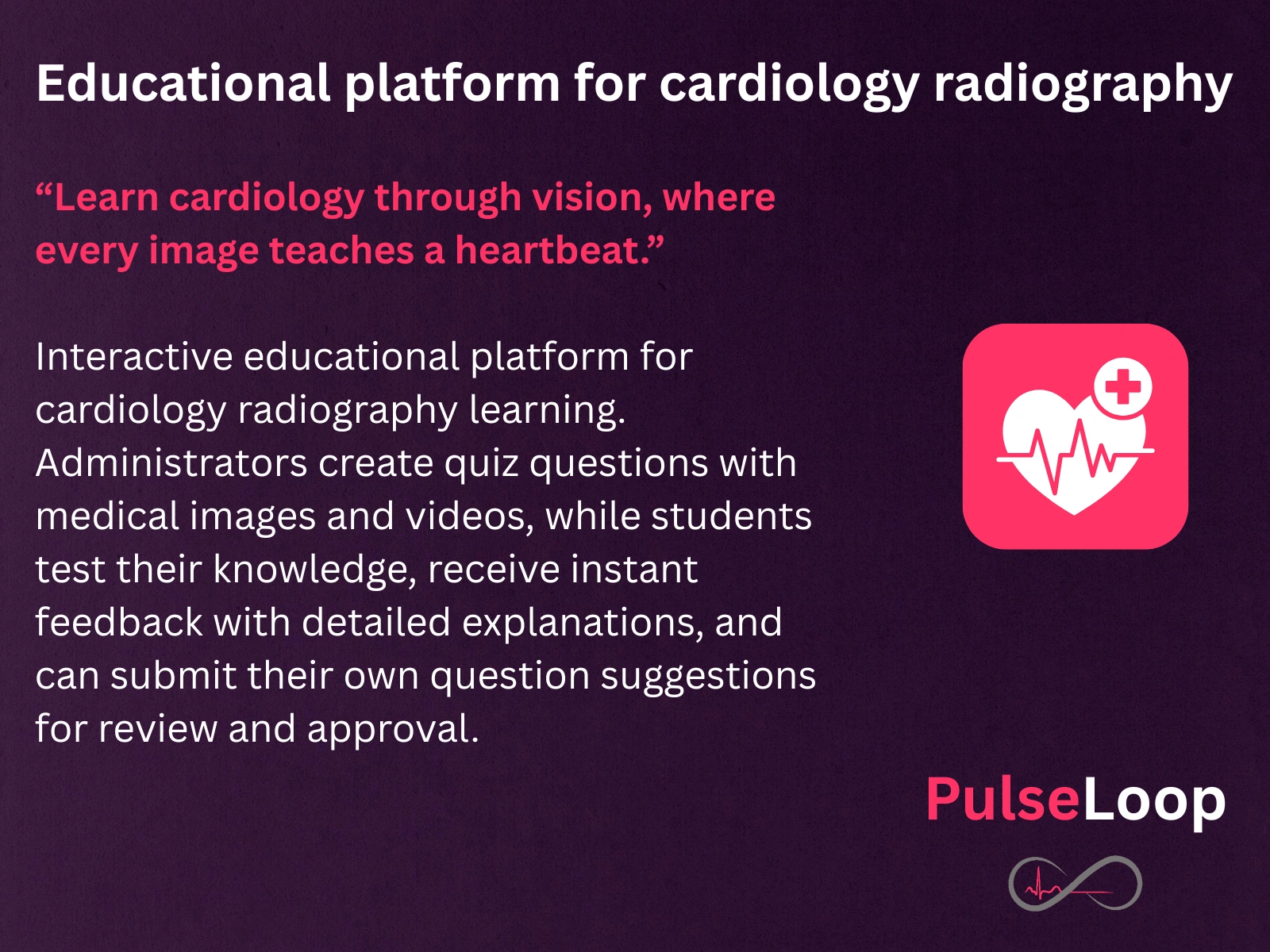 Interactive educational platform for cardiology radiography learning. Administrators create quiz questions with medical images and videos.