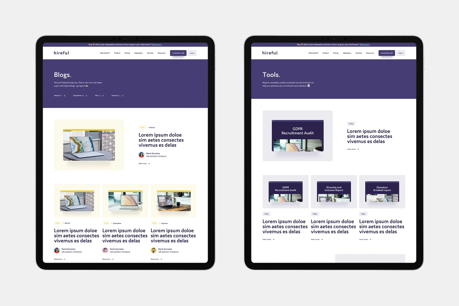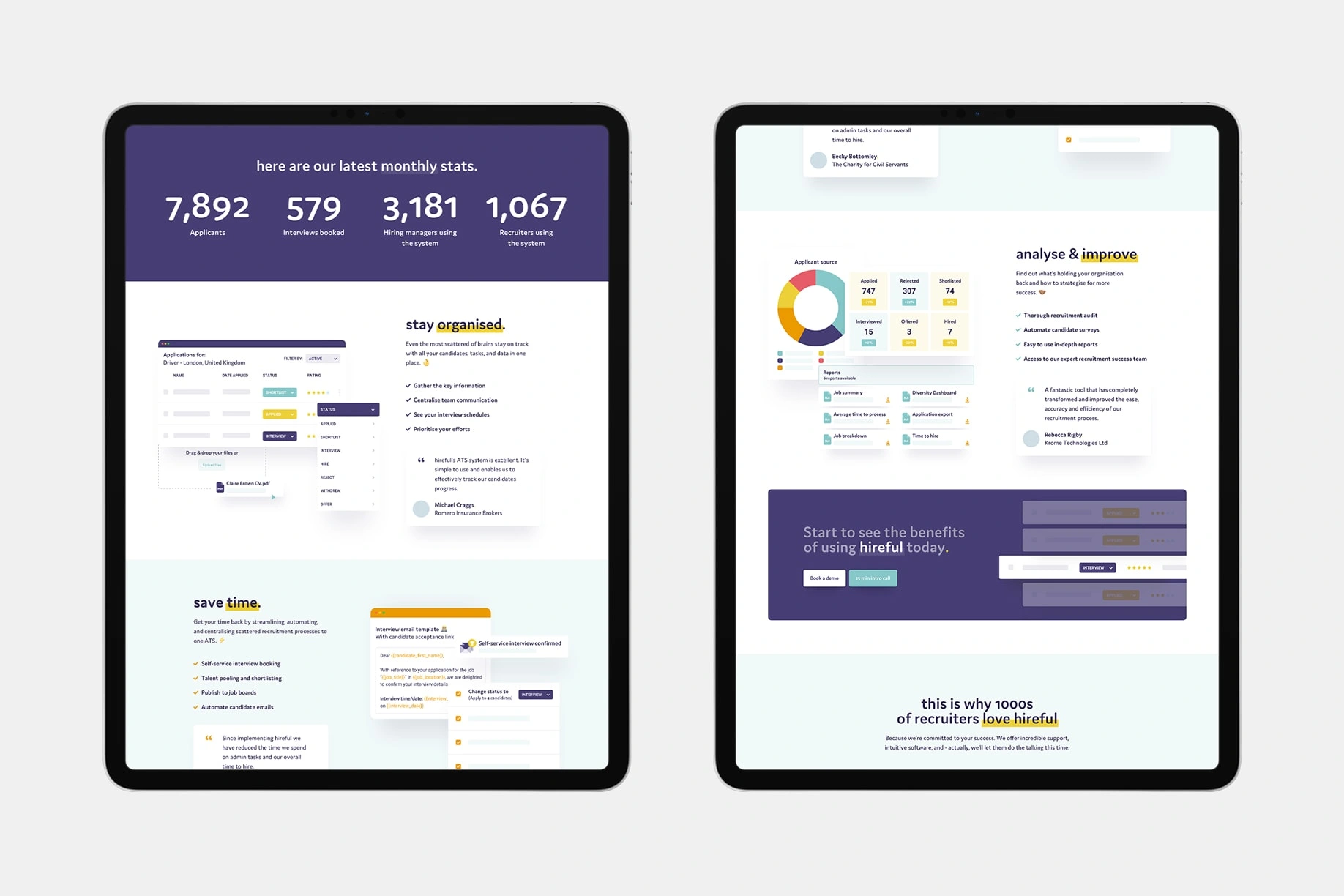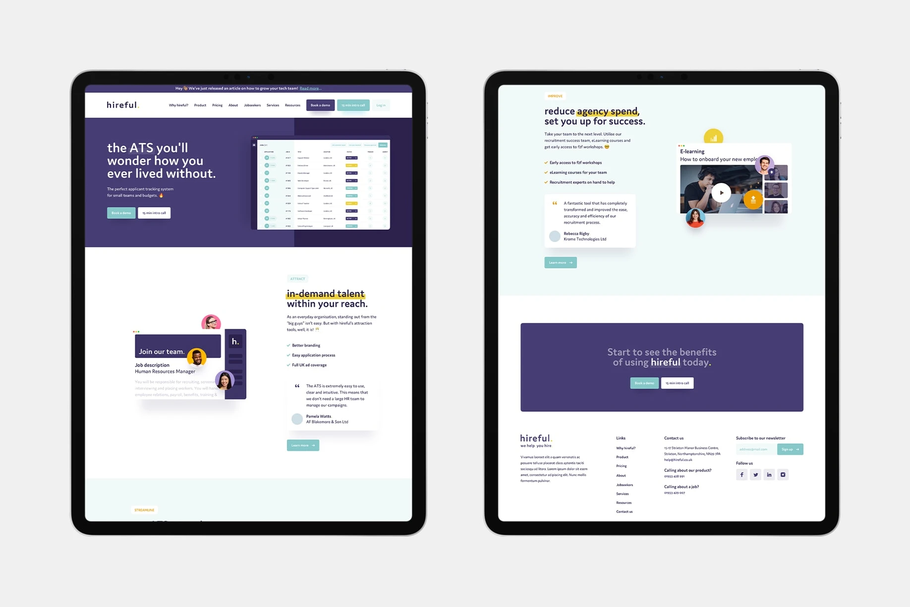 Particular attention was given to the approach Hireful wanted to take in regards to the customer journey, with Attract, Streamline, Hire and Improve as their main steps to make HR staff and recruiters life easier, and revolve their resources around these topics as well. Using different brand colours to outline the different stages makes the navigation throught the site incredibly intuitive.