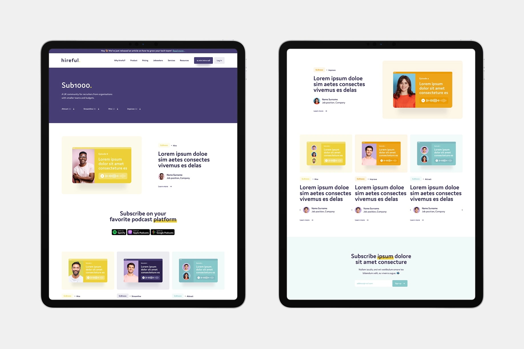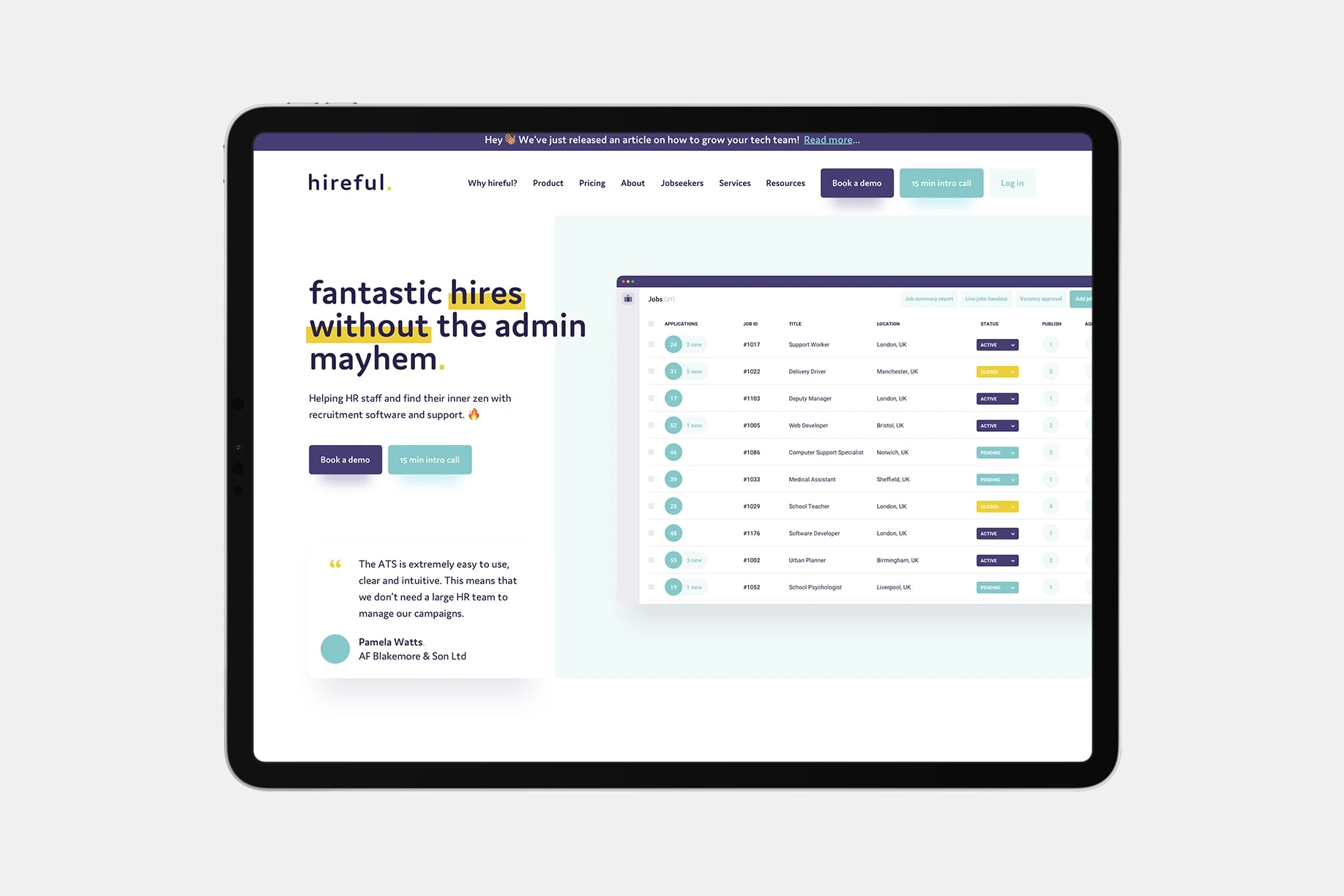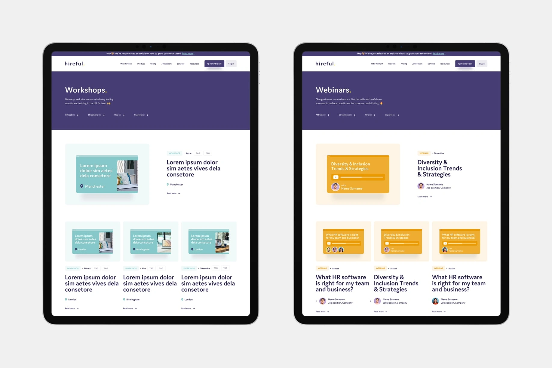 Particular attention was given to the approach Hireful wanted to take in regards to the customer journey, with Attract, Streamline, Hire and Improve as their main steps to make HR staff and recruiters life easier, and revolve their resources around these topics as well. Using different brand colours to outline the different stages makes the navigation throught the site incredibly intuitive.