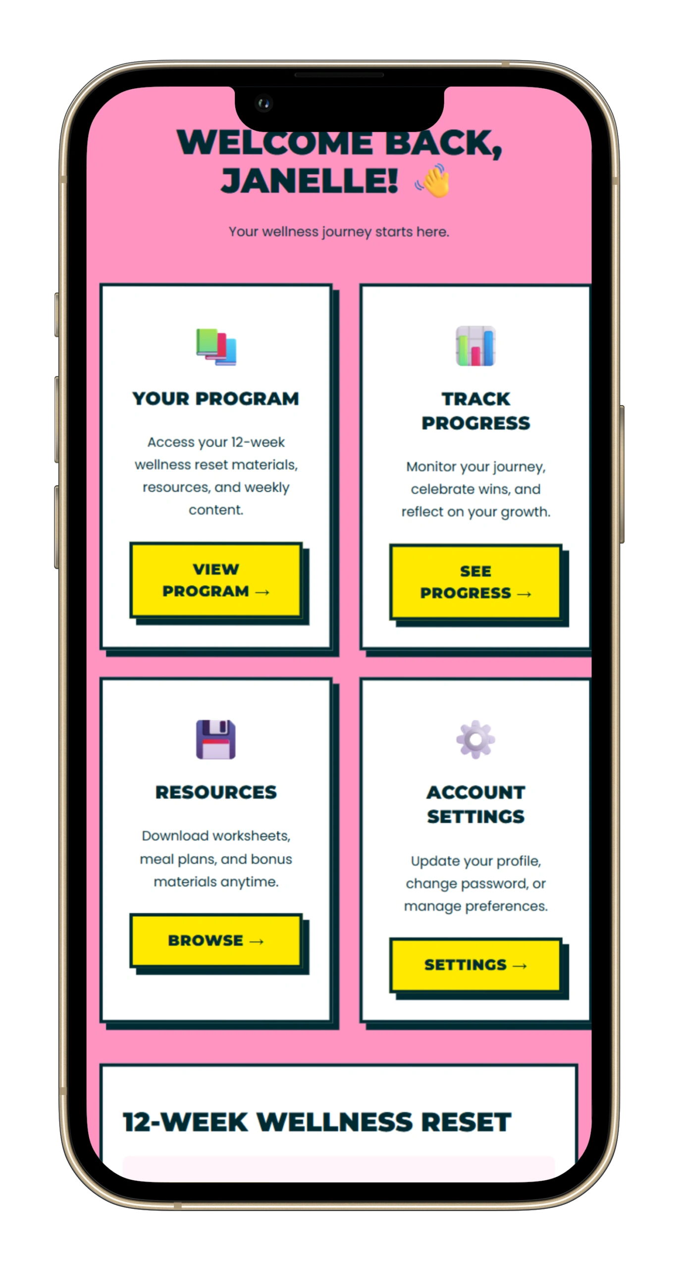 For the demo, I’ve added sample PDFs and placeholder content to show the structure. In your build, this is where your actual program materials would live—video embeds, worksheet downloads, audio files, whatever you deliver to your clients.