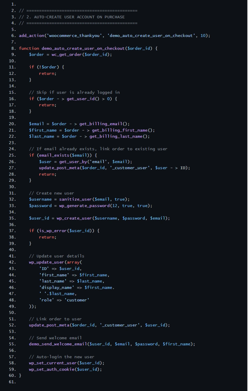 It checks if a user already exists. If not, it creates one with secure credentials, assigns them the customer role, links the order, and triggers the welcome email.