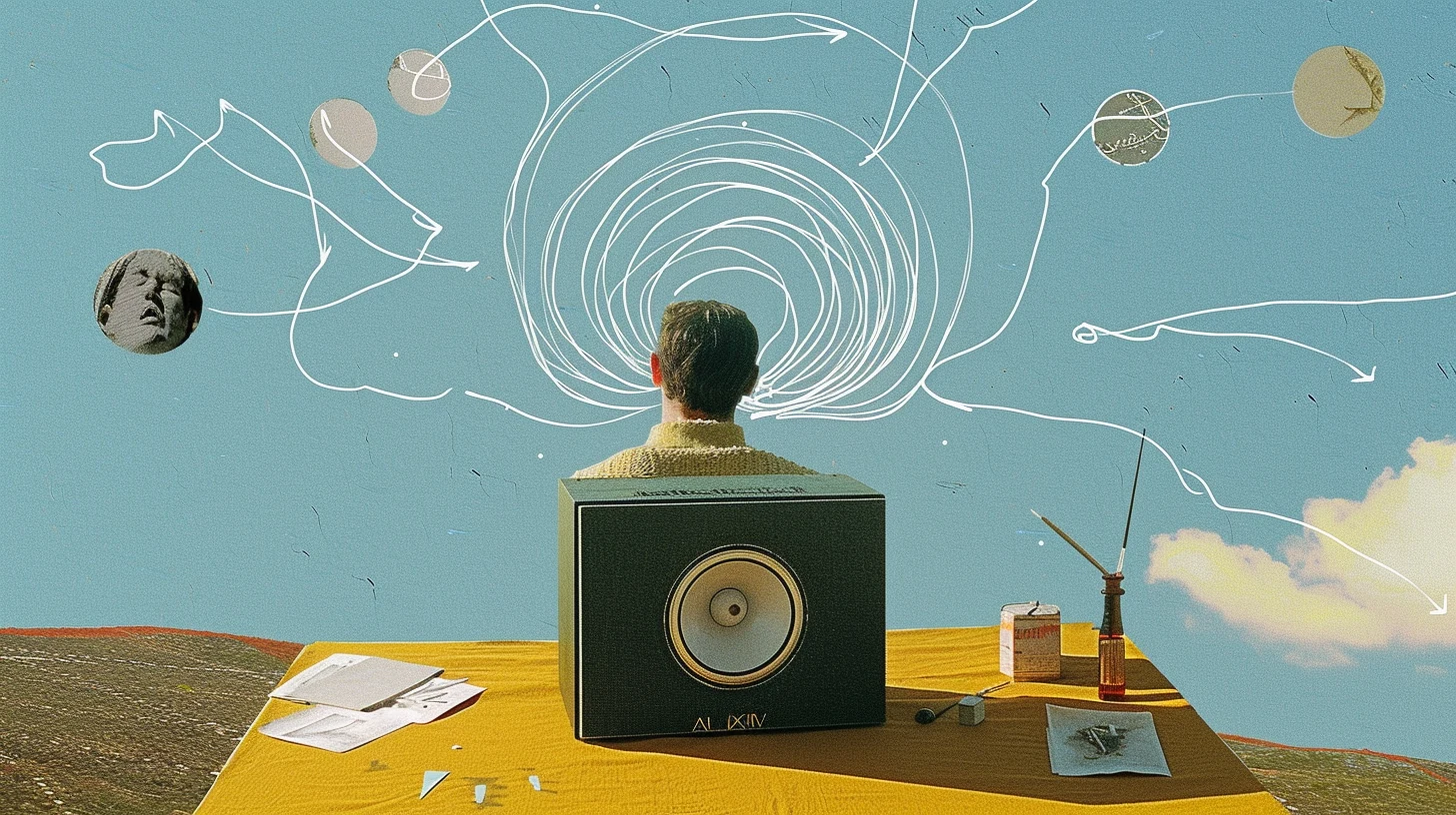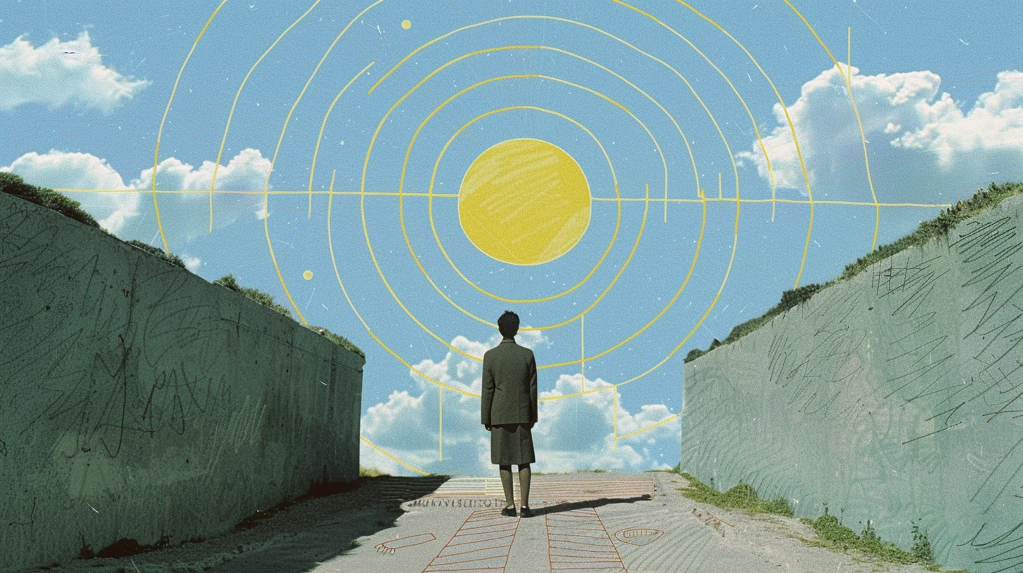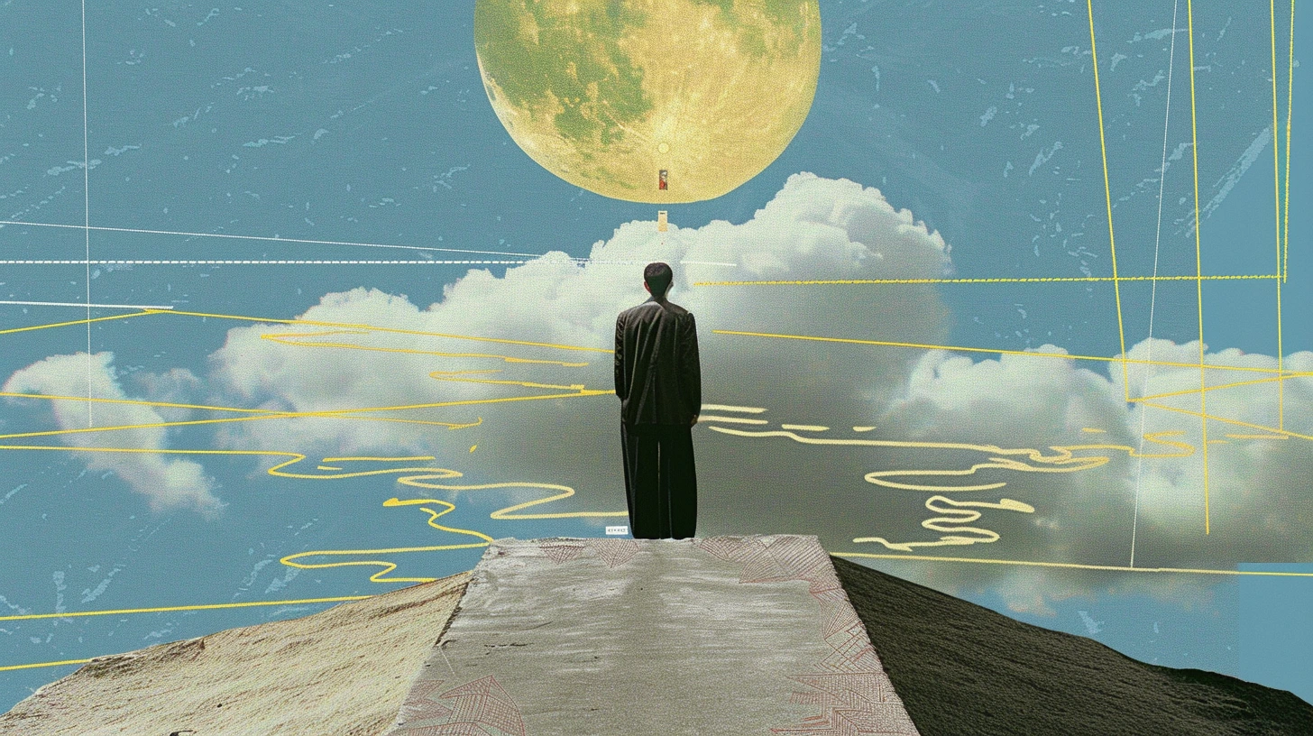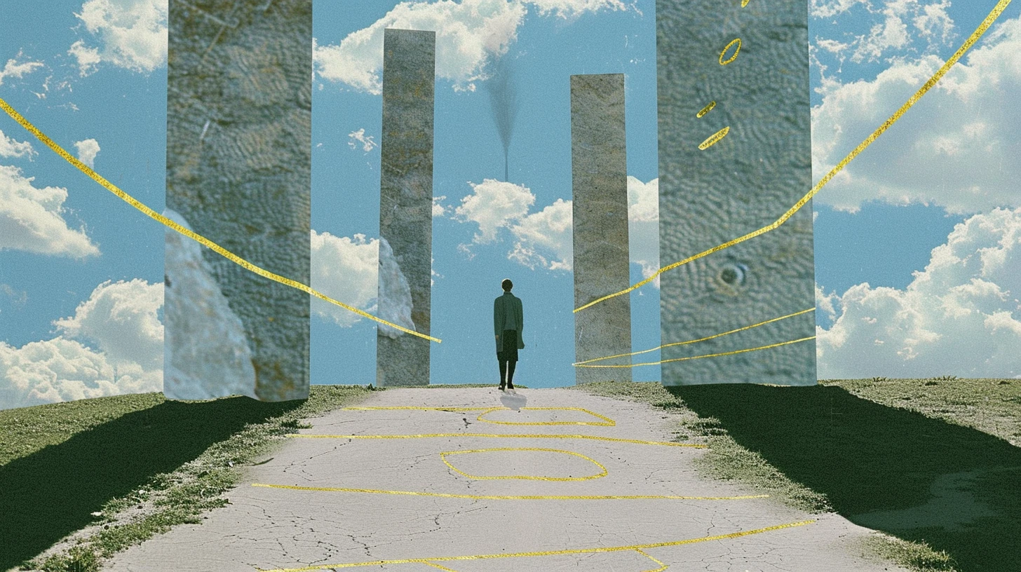This prompt explores cinematic perspective, surreal collage, and editorial-style imagery—bringing together architecture, scale, and subtle abstraction. It blends matte film grain textures, muted neutral tones, and restrained gold accents, with geometric lines and sketch-like details layered into the scene.