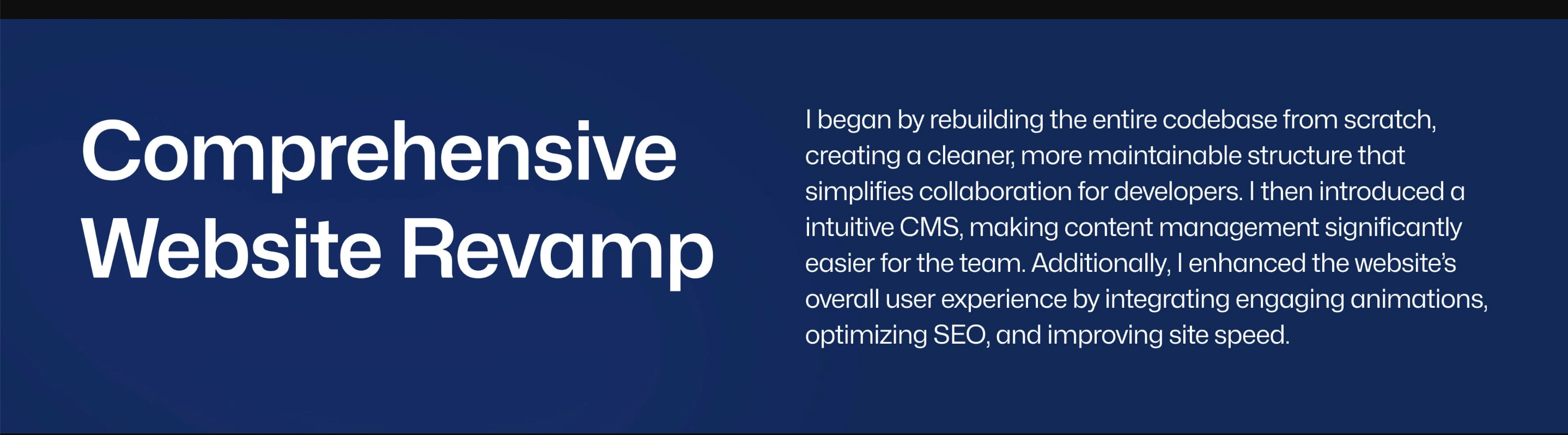 Originally tasked with design updates, the project evolved into a full website revamp due to maintenance issues. I introduced an intuitive CMS, enhanced the user experience with engaging animations, and optimized both SEO and site speed. I also created two animated marketing landing pages that elevated the brand presence. The result was a visually stunning, efficient, and user-friendly website.