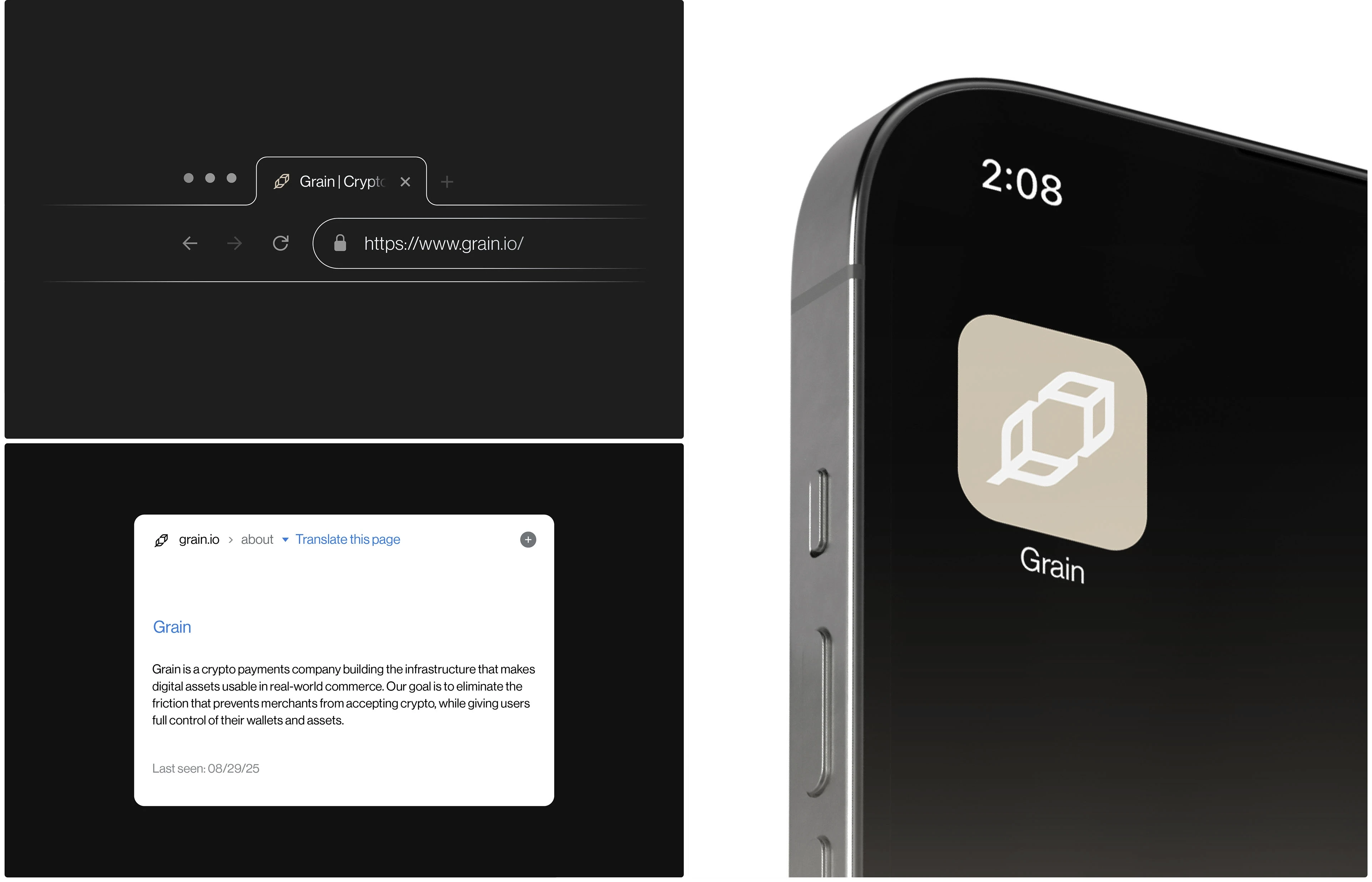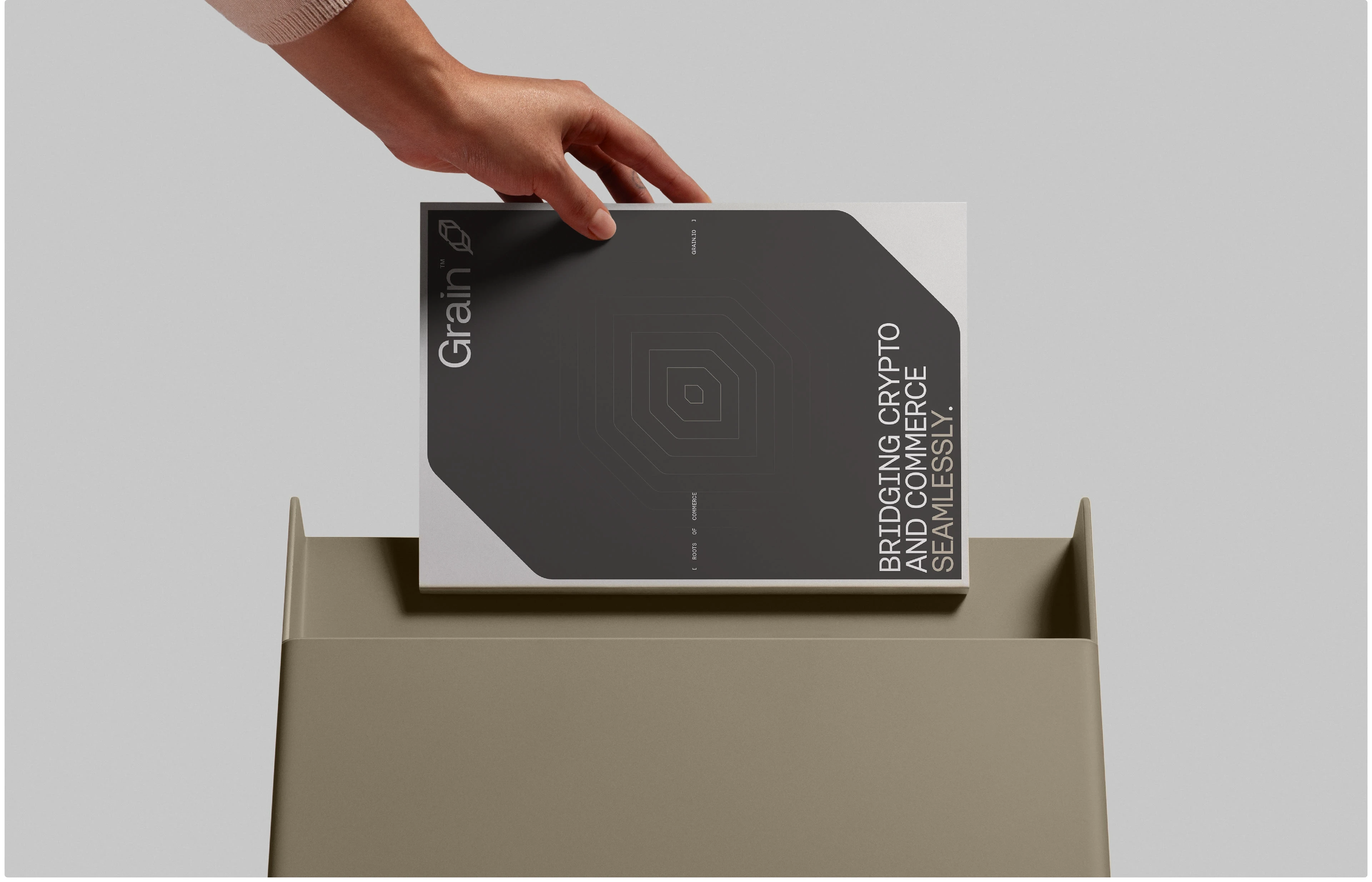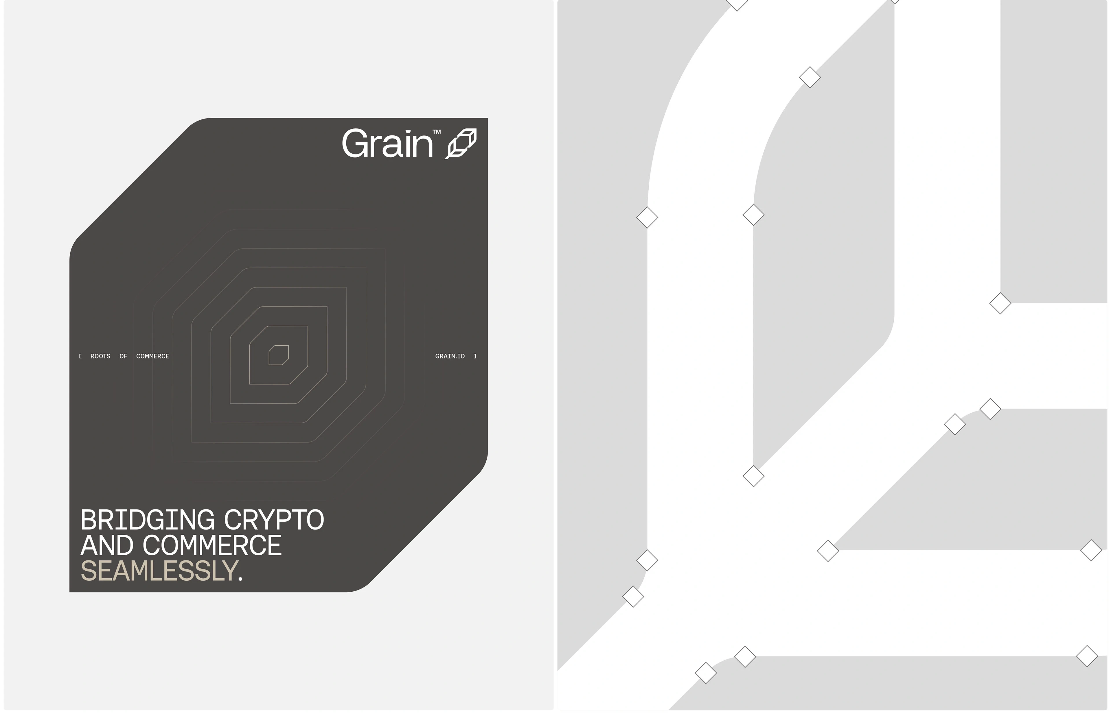 The visual identity bridges the gap between cutting-edge crypto technology and daily commerce, making cryptocurrency payments as simple and secure as traditional methods. The logo leverages negative space to create the silhouette of a grain of wheat, subtly conveying our core values of removing barriers and simplifying complexity. The dynamic interplay of geometric shapes and negative space lends a modern, forward-thinking character to the brand, echoing Grain’s commitment to constant innovation in digital assets.