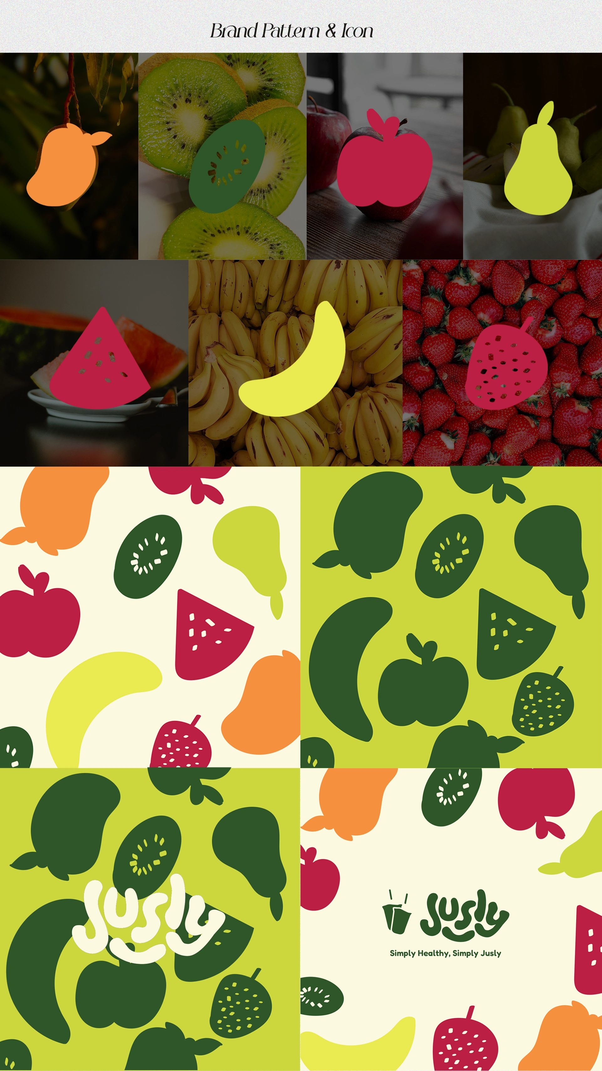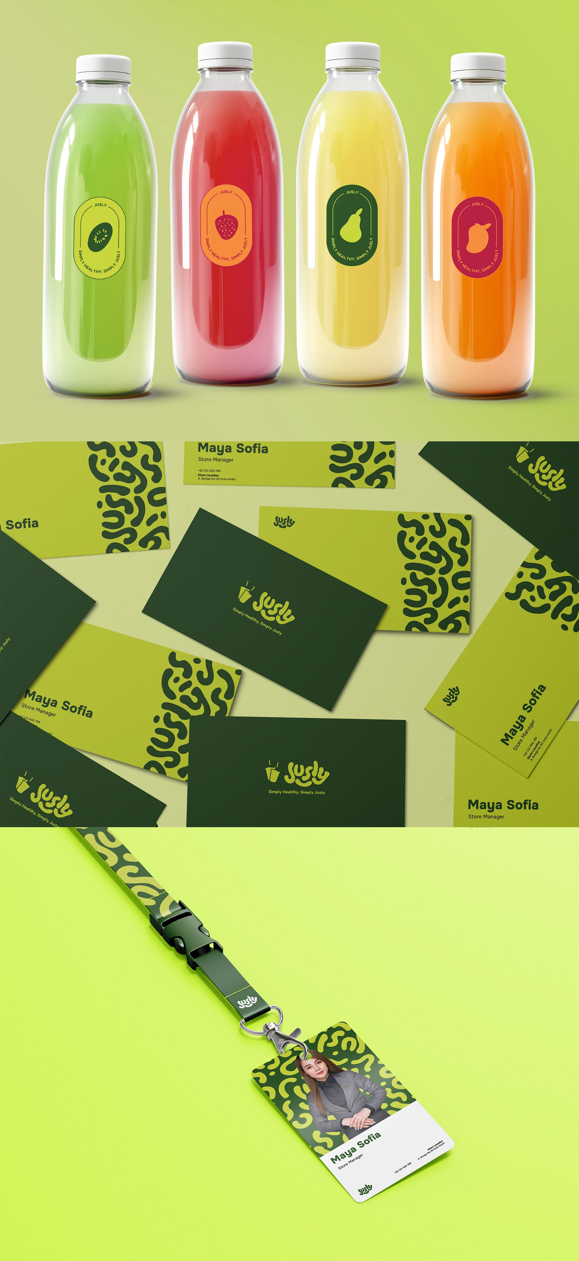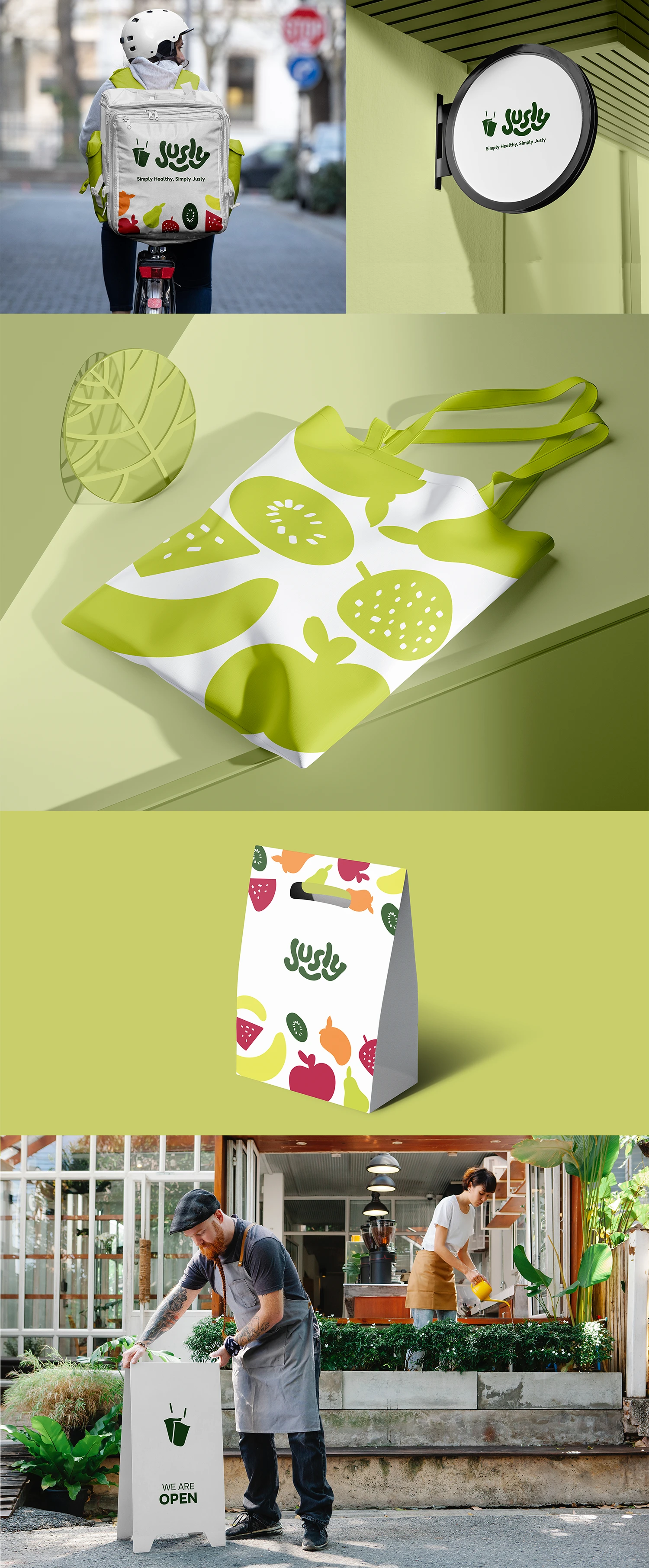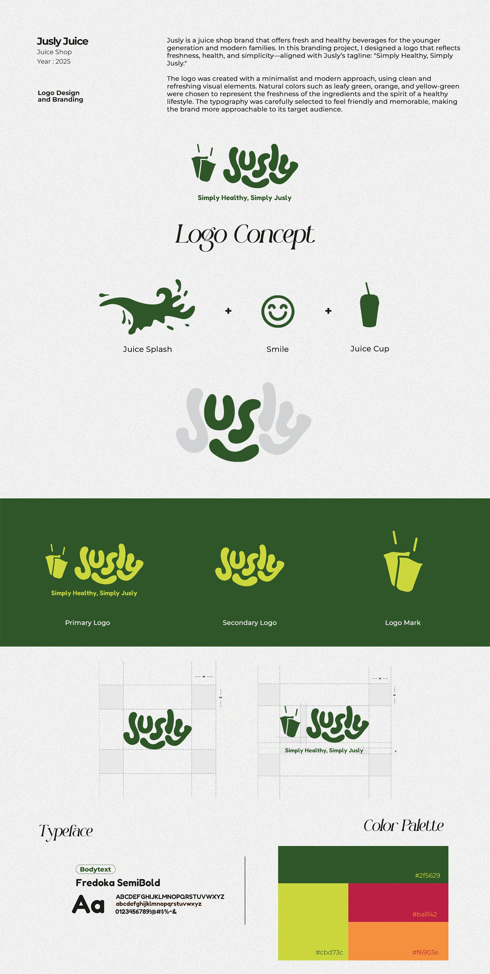 a modern juice shop brand promoting a simple and healthy lifestyle. Clean design, natural colors, and friendly typography to reflect their tagline: Simply Healthy, Simply Jusly. 🍊🥬✨
