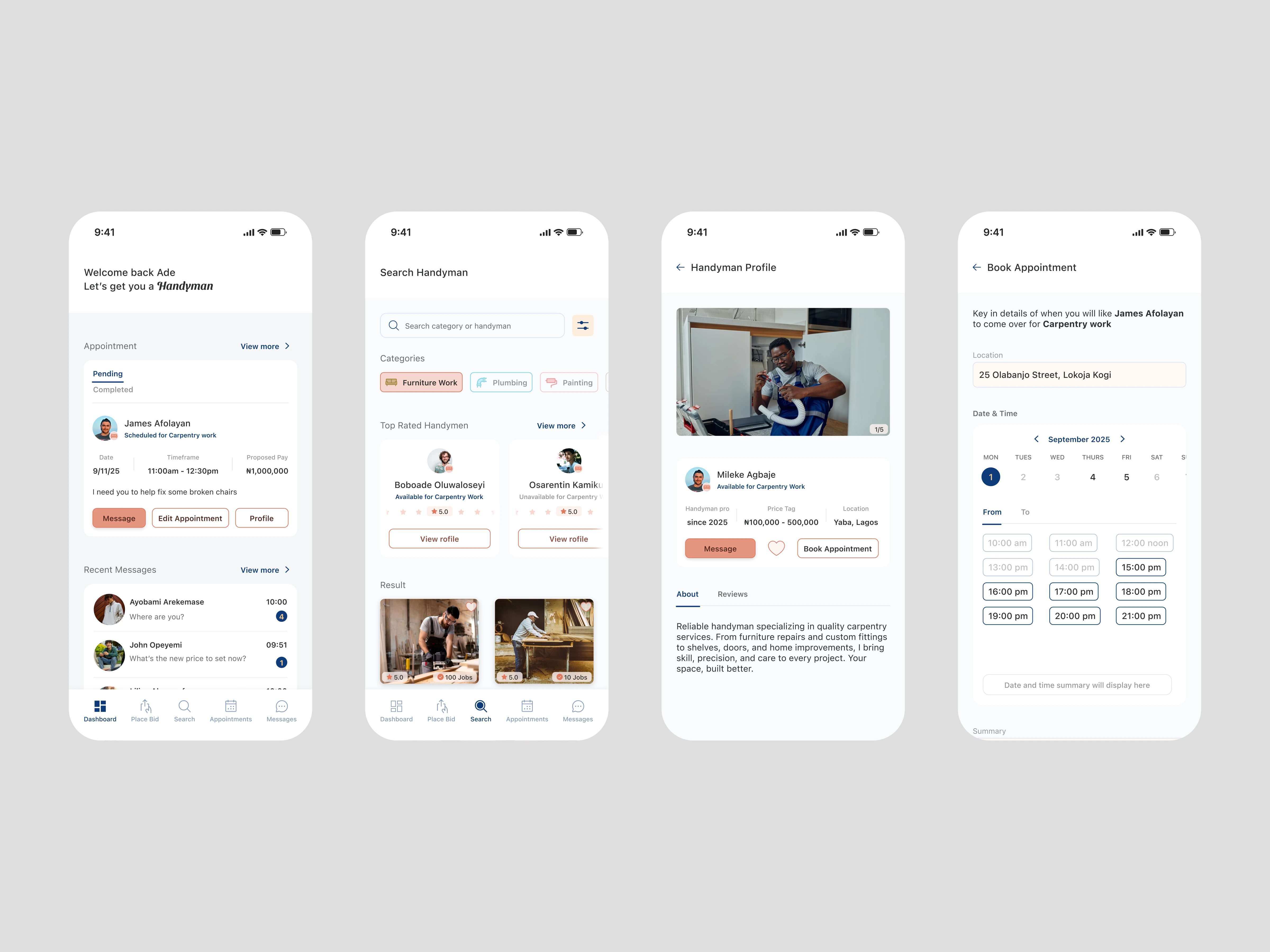 I designed a handyman app that connects users with skilled professionals for home repairs and maintenance. Upon logging in, users can view or manage appointments, search for available handymen by category, browse top-rated professionals, and view detailed profiles with pricing and reviews. The app also allows users to book appointments seamlessly by selecting preferred dates, times, and locations — making it simple, transparent, and efficient to get help when they need it.