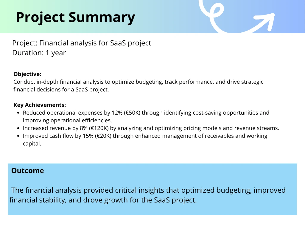 Reduced expenses by 12% (€50K), increased revenue by 8% (€120K), and improved cash flow by 15% (€20K) through financial analysis for a SaaS project in 1 year.