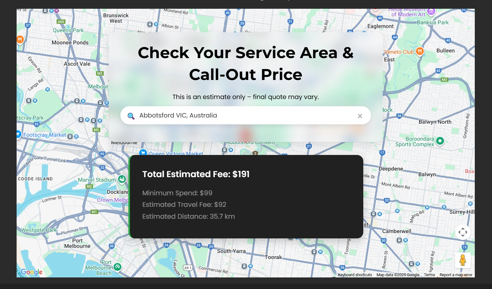 Developed a custom cost estimator for a bike servicing company. The solution integrates the Google Maps API to calculate travel fees based on customer location.