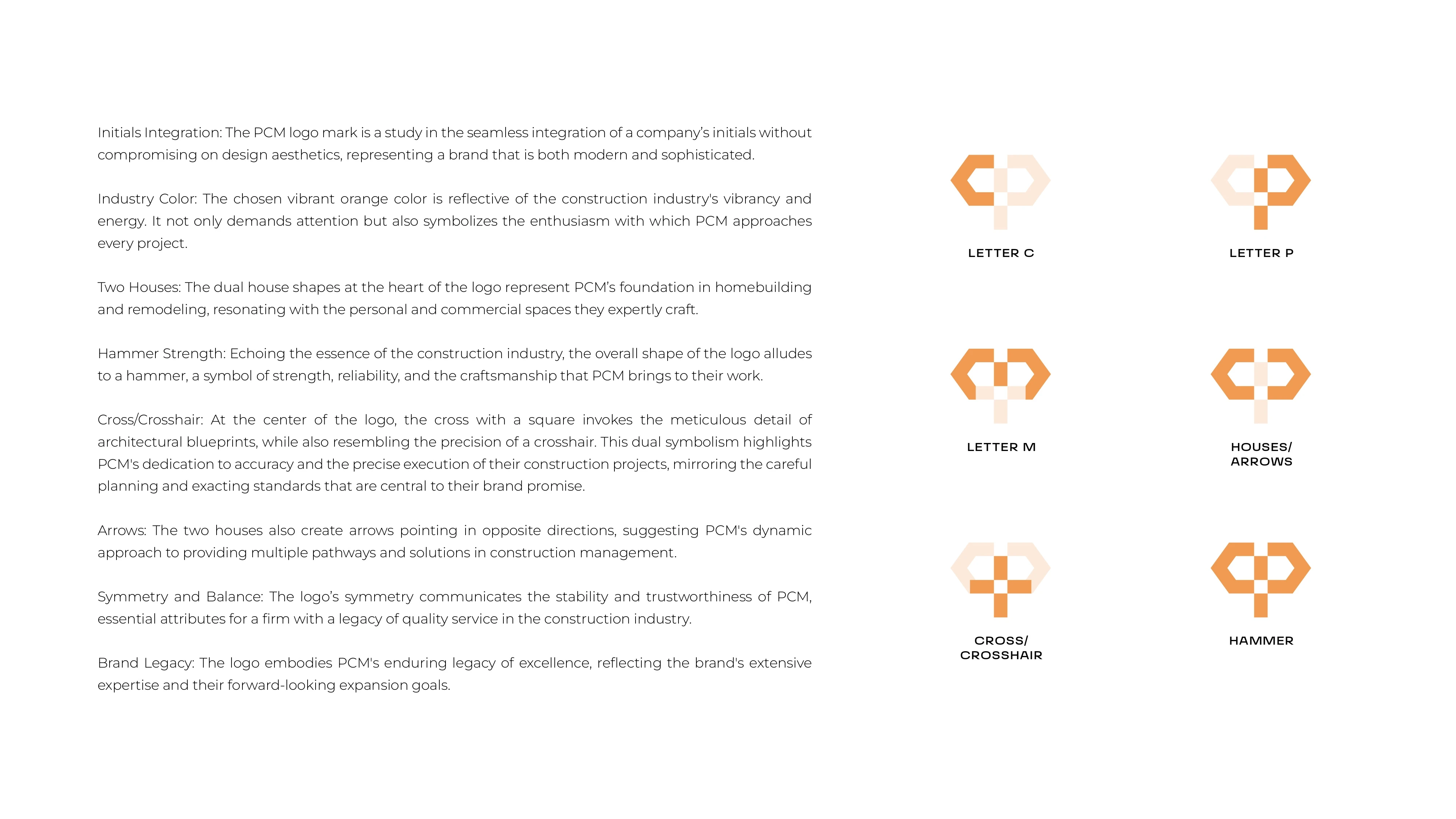 Designed PCM’s construction brand identity with a bold monogram built from houses, arrows, and tool cues, expressing strength, precision, and trust.