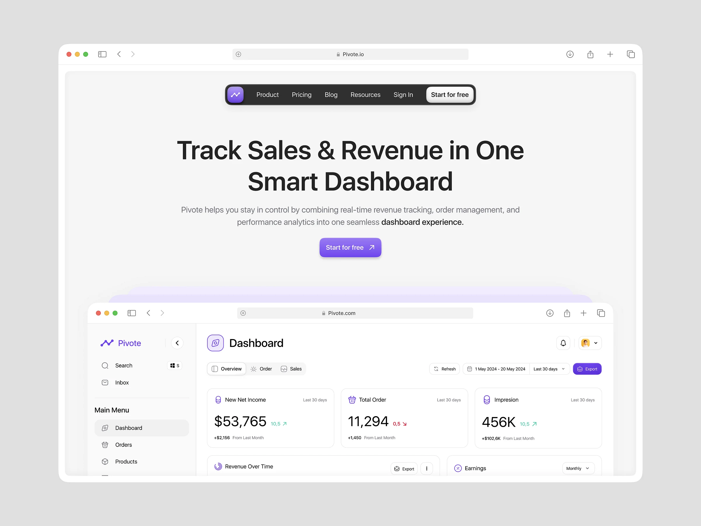 Pivote’s Sales Analysis Dashboard gives you a powerful overview of your business metrics in one clean, intuitive interface. Track your New Net Income, monitor Total Orders, and measure Impressions growth, all updated in real time to support fast decision-making.The dashboard also features visual breakdowns of revenue trends and earnings over time, making it easy to spot patterns and optimize your strategies. With Pivote, you’re not just viewing numbers, you're unlocking the story behind your sales.