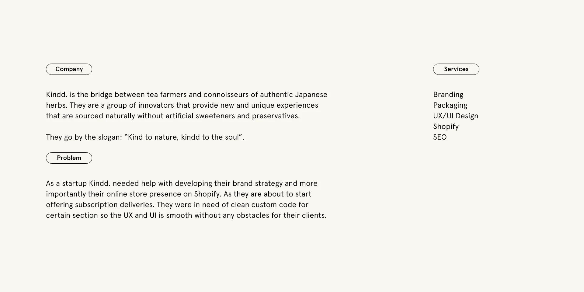 As a startup Kindd. needed help with developing their brand strategy and more importantly their online store presence on Shopify. As they are about to start offering subscription deliveries. They were in need of clean custom code for certain section so the UX and UI is smooth without any obstacles for their clients.