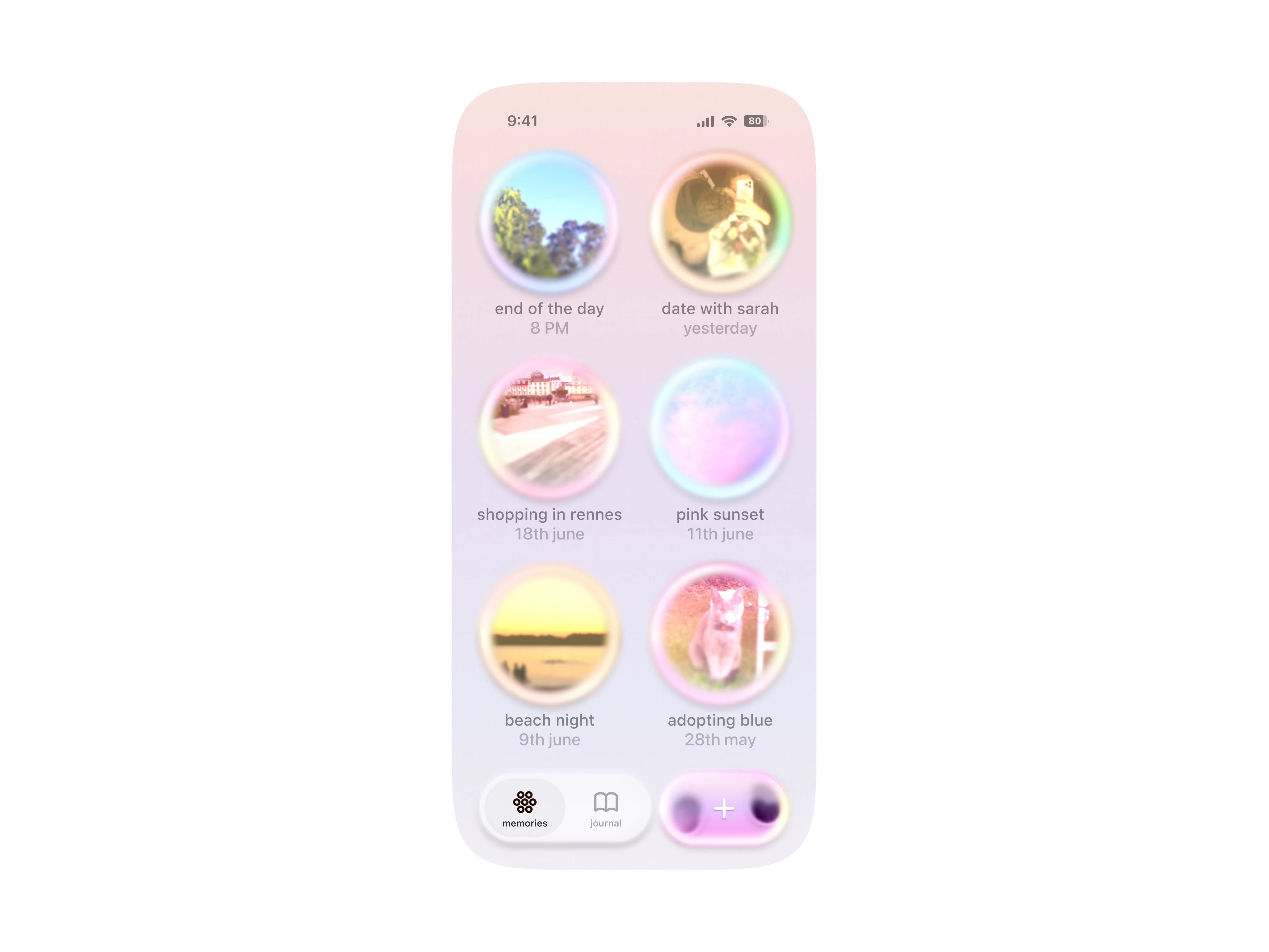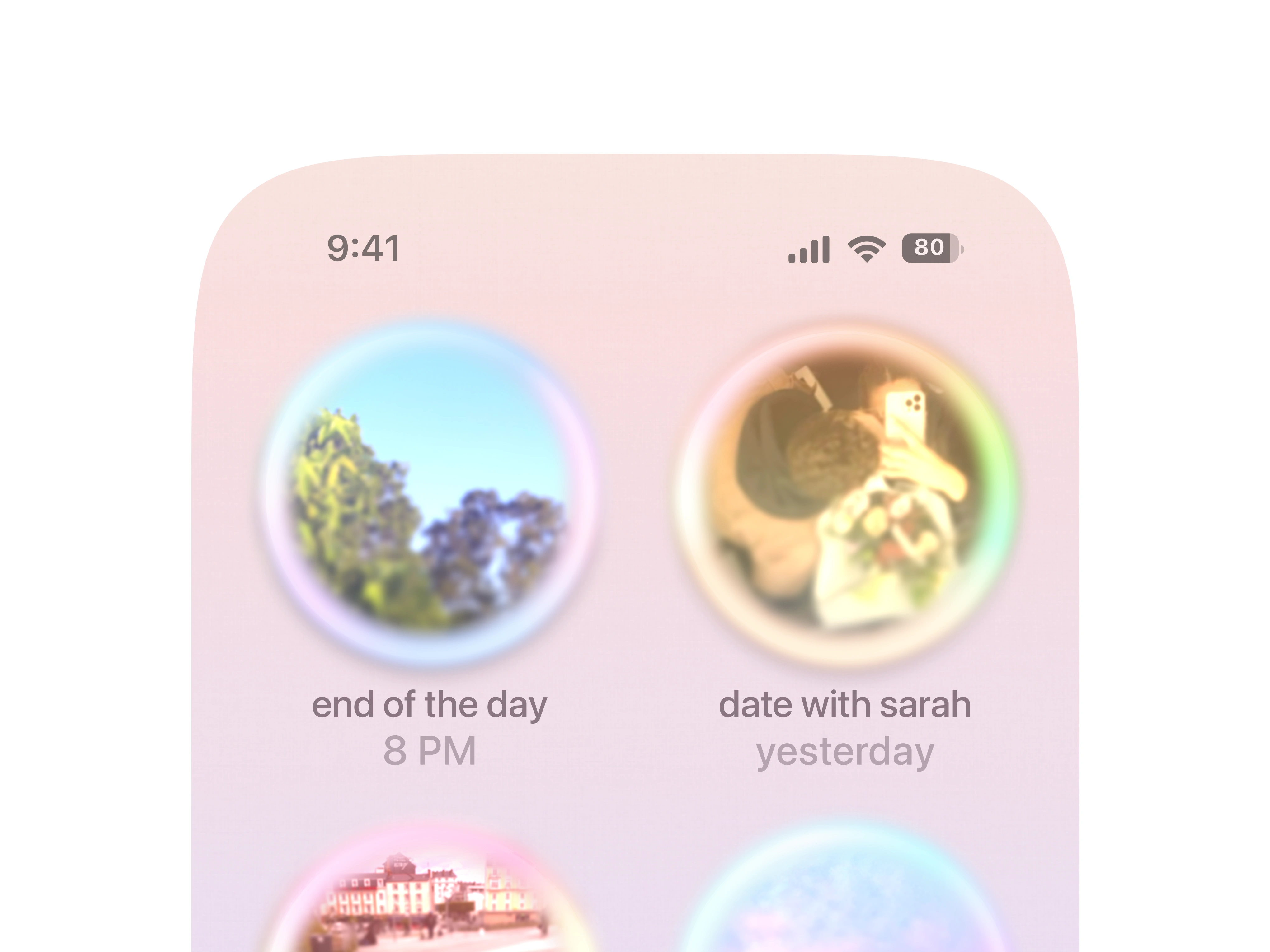 When you record a memory ; say, a date with Sarah, the app doesn’t just save a photo. It creates a glowing orb with a simple, human title like “date with Sarah,” and tags it with a date. Later, when you scroll through, you’re greeted by a gentle cascade of orbs, each one inviting you to tap and relive those moments. Instead of scrolling through endless rectangles, you feel like you’re floating through your own collection of treasured experiences.