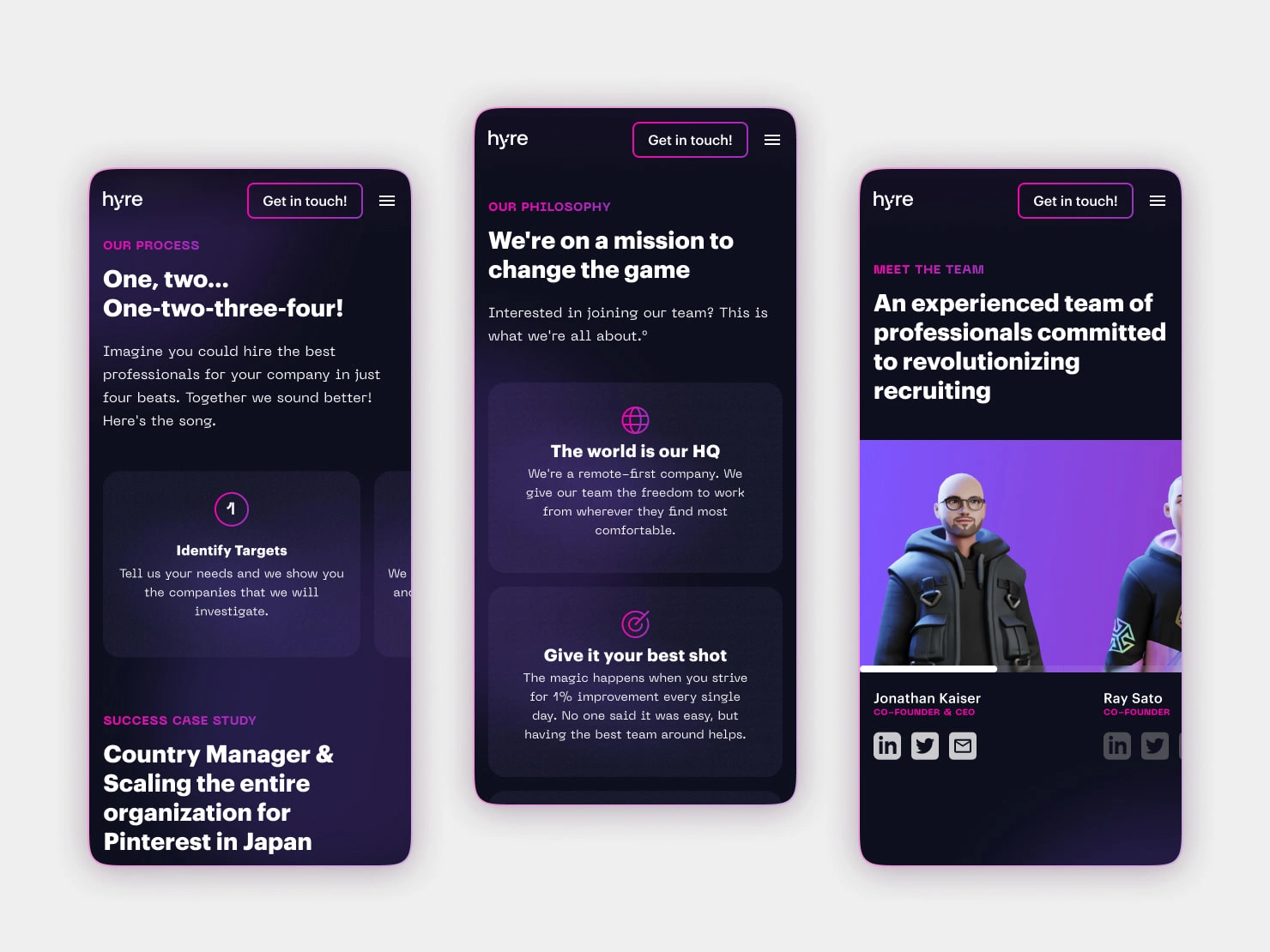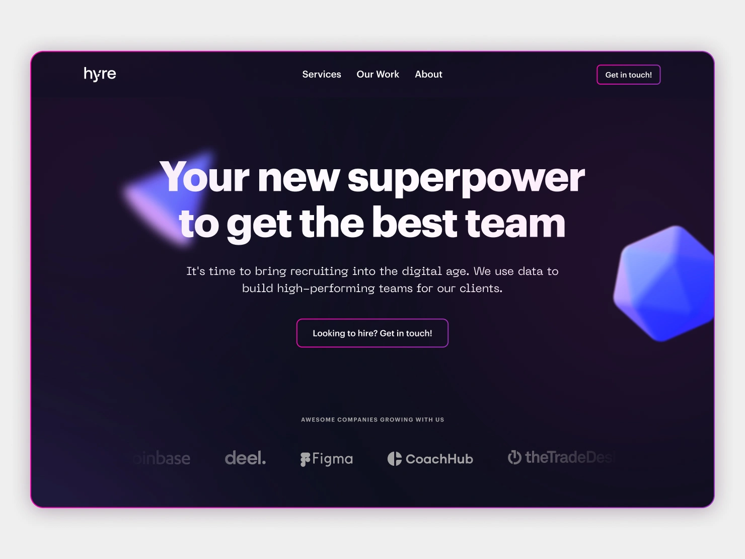 At Z1, I led the branding and web design for Hyre, a digital recruitment agency founded by ex-Uber recruiters. The goal was to craft a bold identity and online presence that communicated speed, transparency, and innovation—the core values of Hyre’s approach to building high-performing teams.