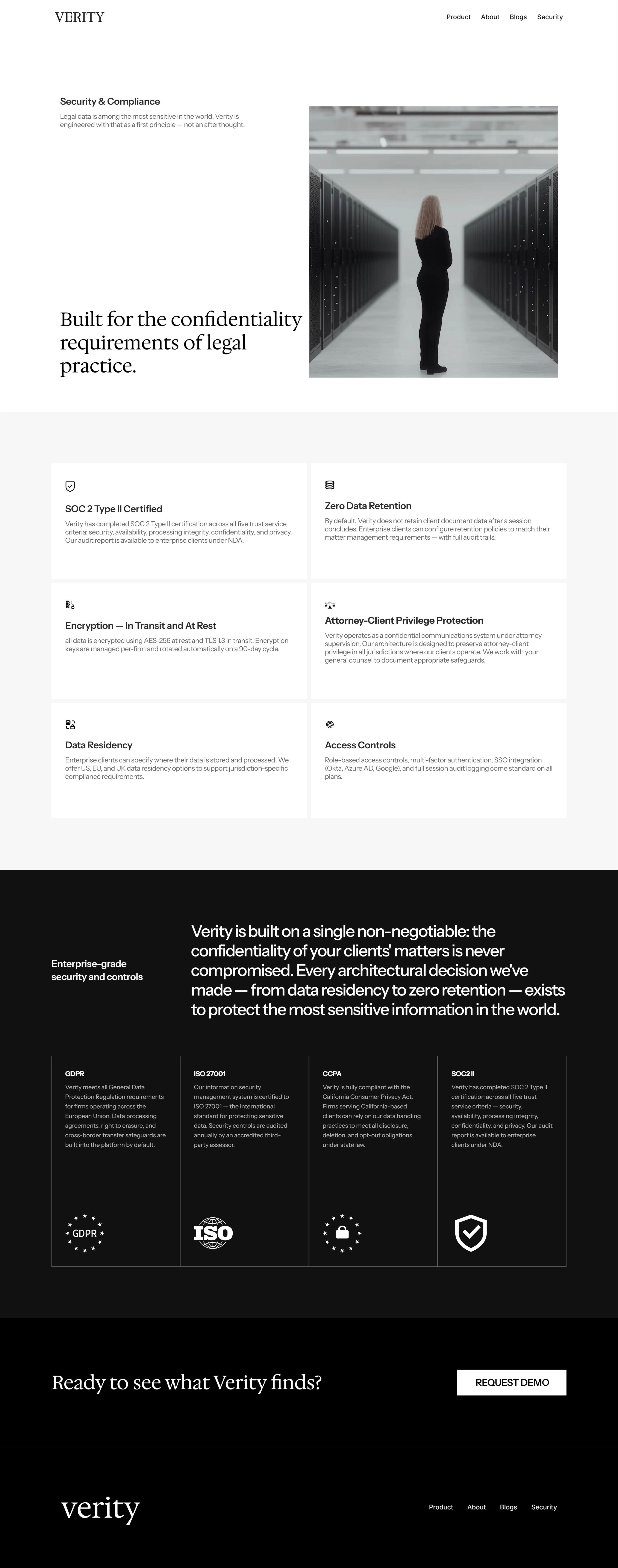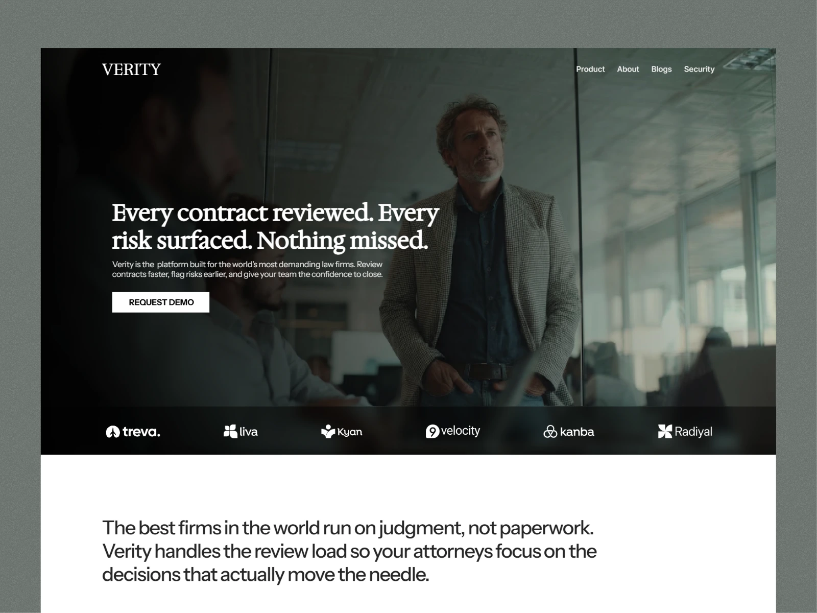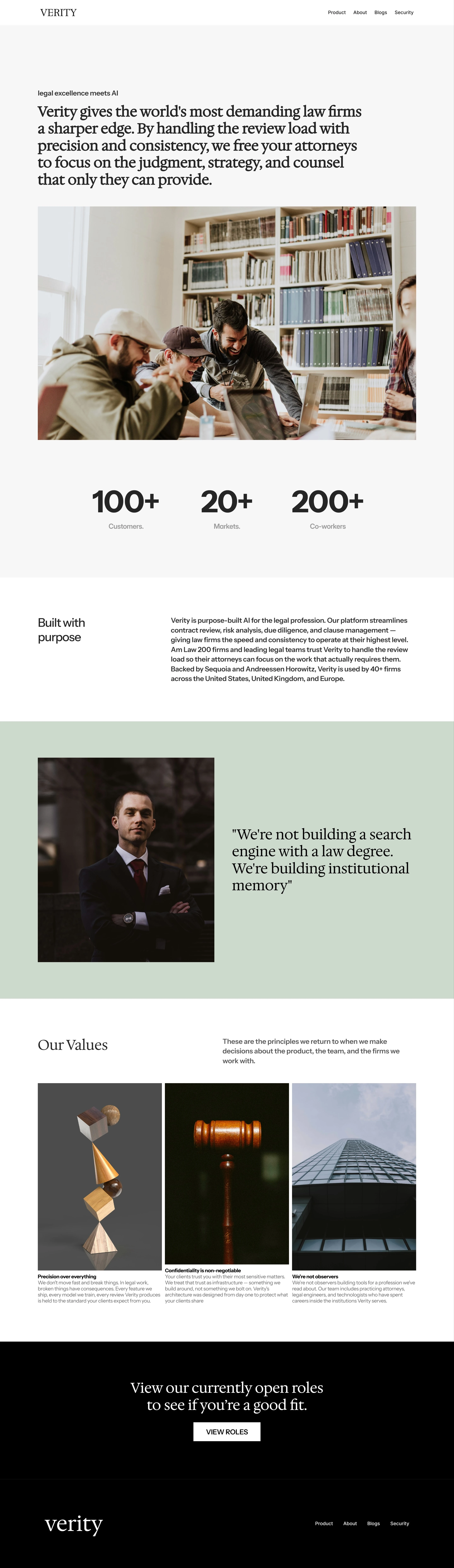 Verity is a purpose-built AI platform for Am Law 200 firms — designed to streamline contract review, surface risk, and give legal teams the consistency to operate at their highest level. I led the end-to-end design and development of Verity's marketing website, translating a complex AI value proposition into a clear, credible, and conversion-focused experience for one of the most demanding audiences in enterprise software.