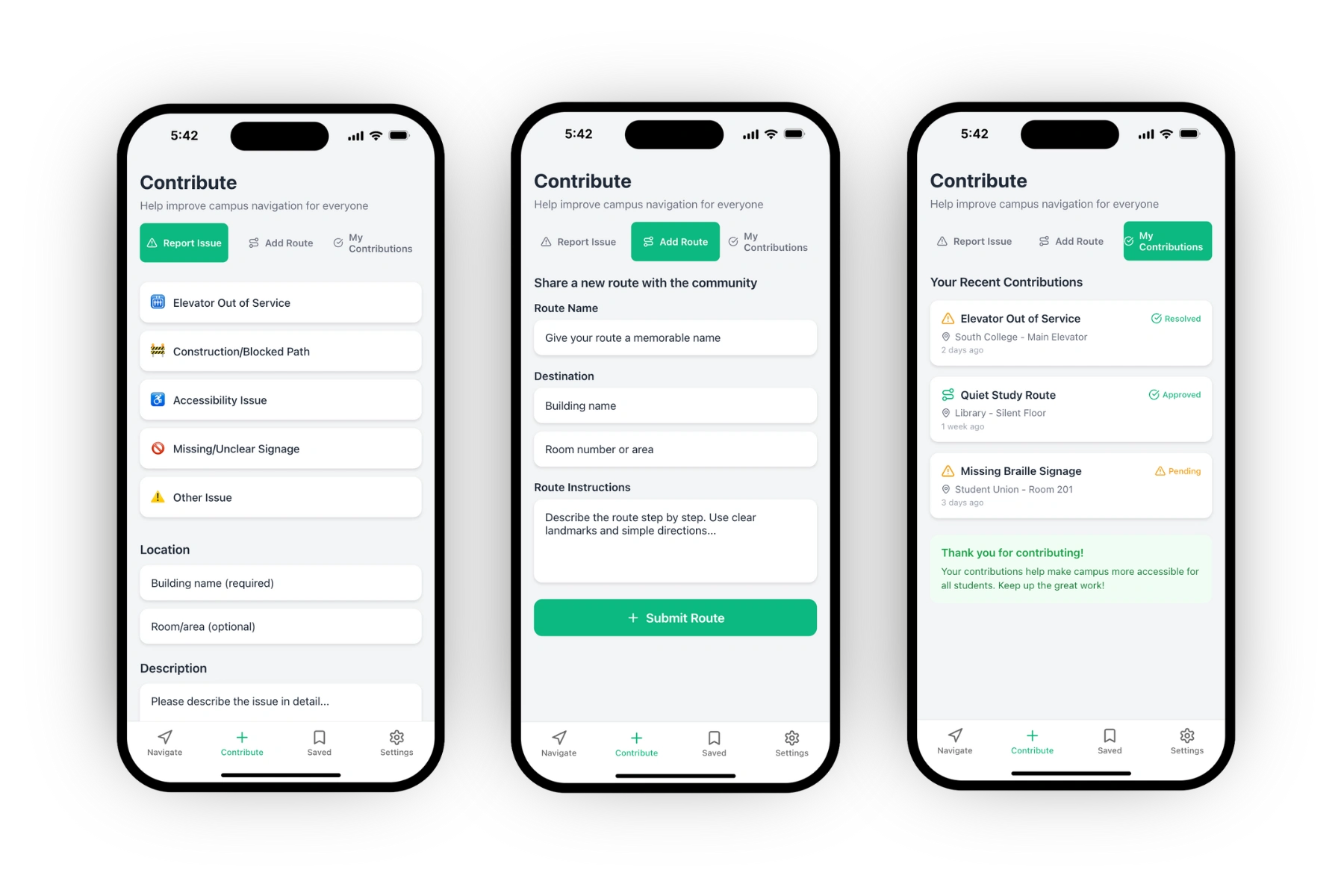 Community-Contributed Accessibility Data: The Contribute section is now central to the app, allowing users to report route issues, share updates, and view the status of their submissions, creating a culture of mutual aid and shared accountability for accessible environments.
