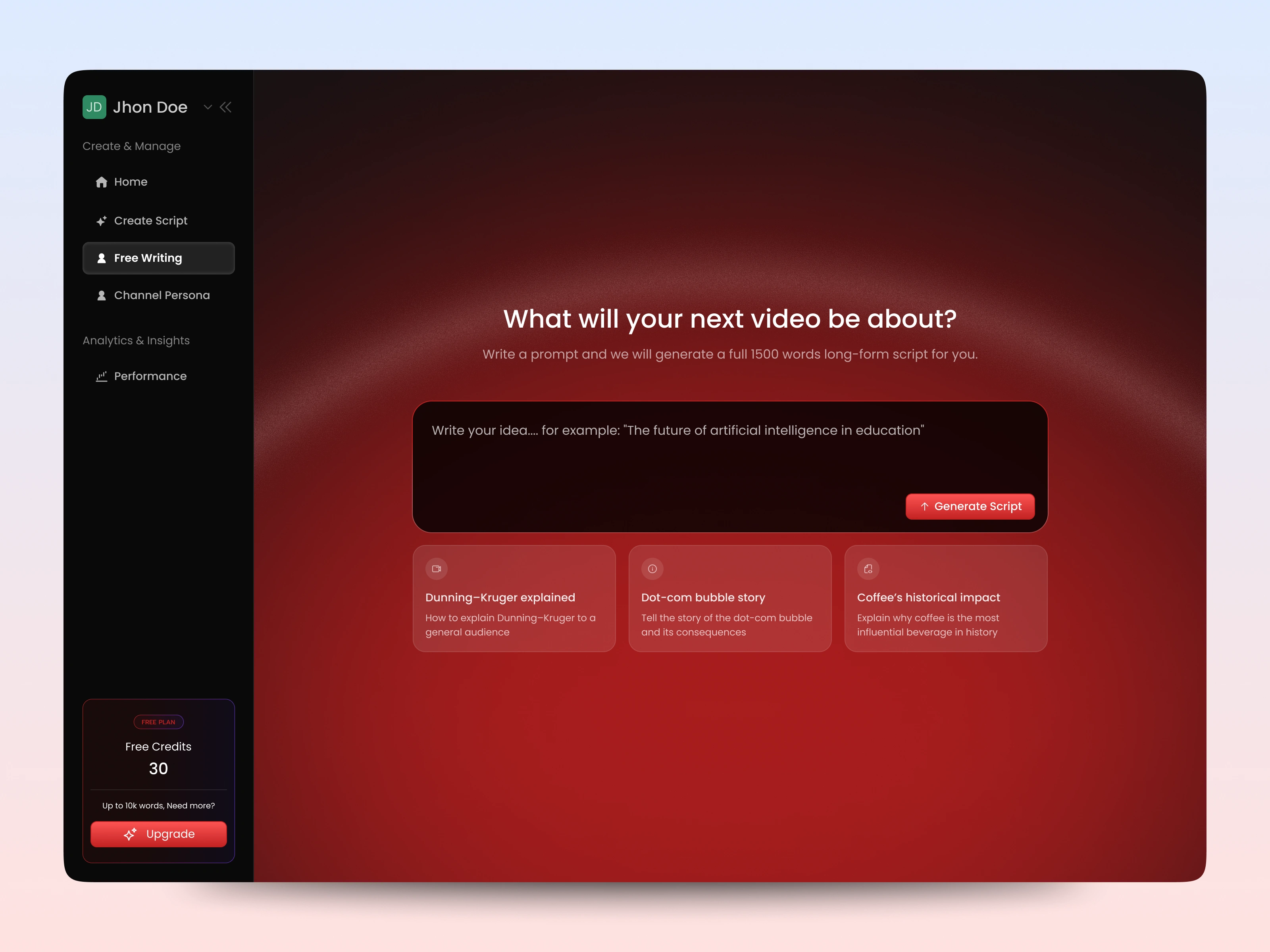 AI-powered script writing that turns ideas into complete video scripts in minutes. Clean UI and smooth flow to keep creators focused and moving fast.