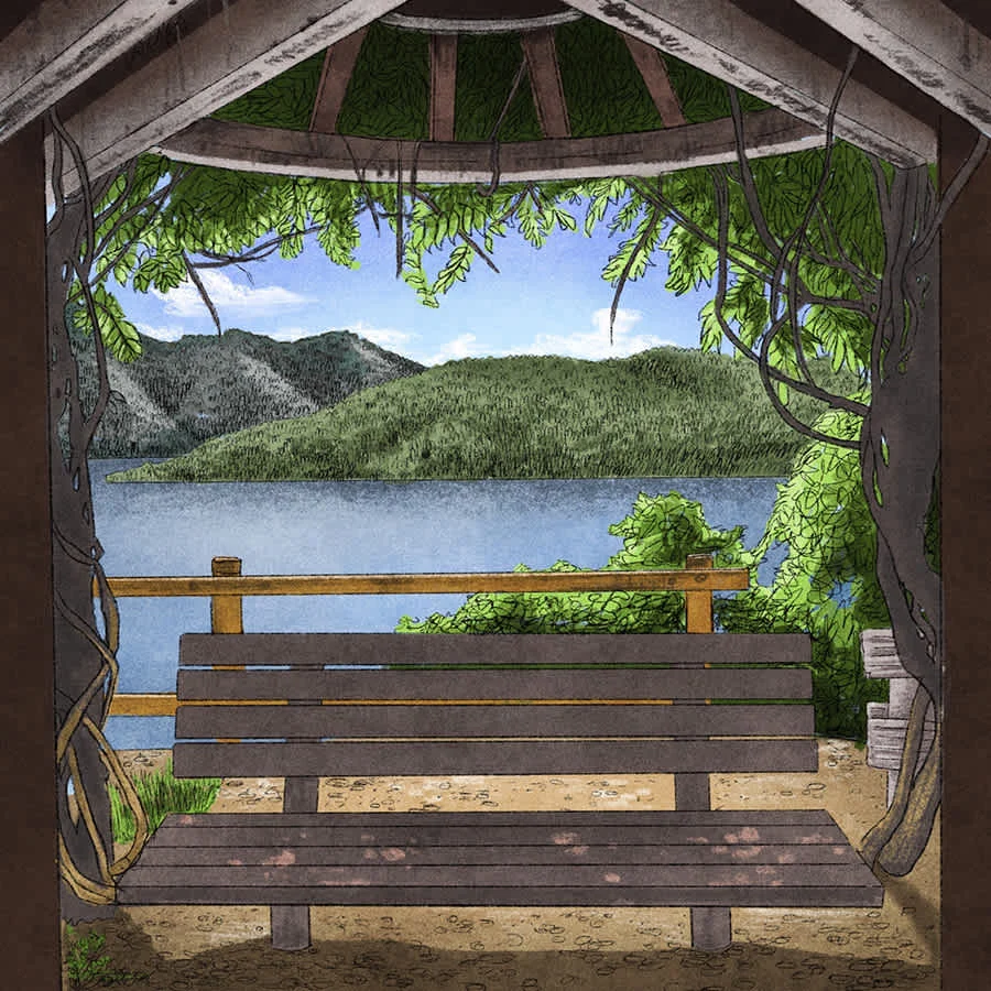A digital illustration that depicts the tranquil landscape of the lake with a hand-painted feel.