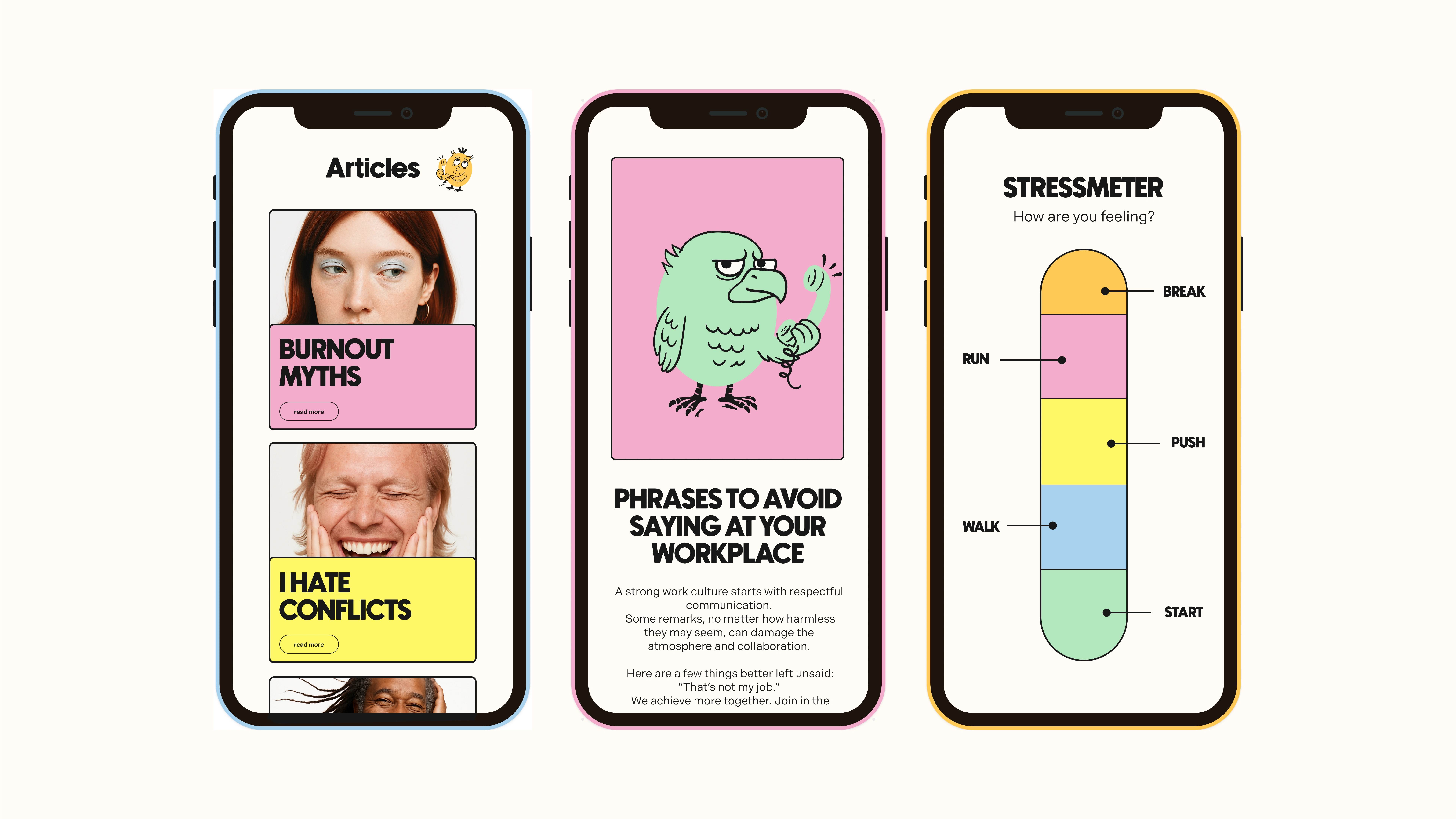 Colours express Workmate’s core: a soft, human counterforce in a tough work environment. They feel caring, setting an emotional tone without heaviness. Bold in their softness, just like Workmate.