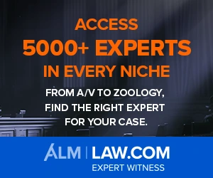 Display banner ads promoting ALM’s Expert Witness directory, a platform connecting legal professionals with specialized expert witnesses across industries.