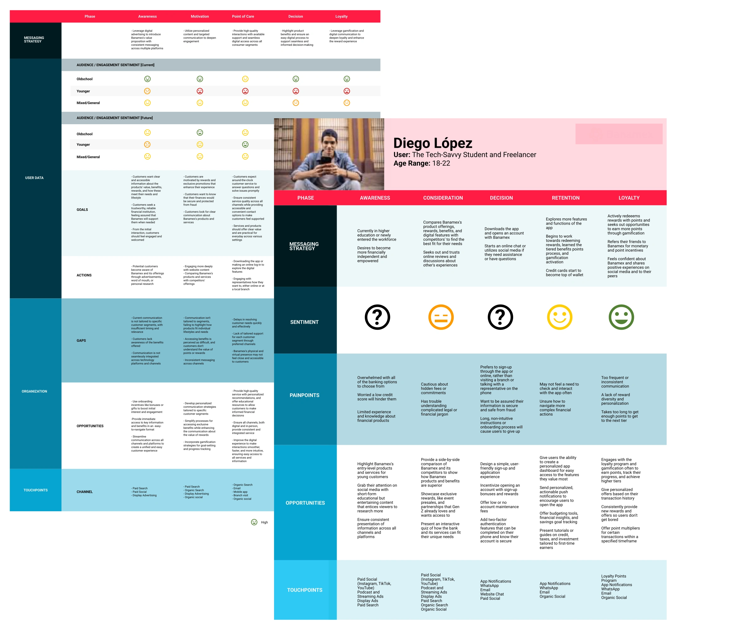 We developed vivid, behavior-driven personas — including Diego (a tech-savvy student), Carla (an ambitious urban professional), and Roberto (an experienced financial planner). These personas represented real-life financial goals, pain points, and preferences, ensuring that all future activations were rooted in human needs.