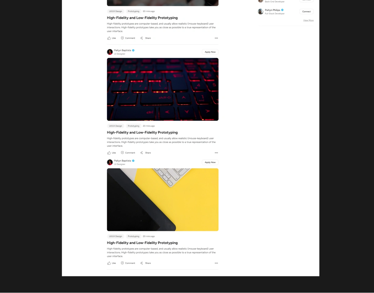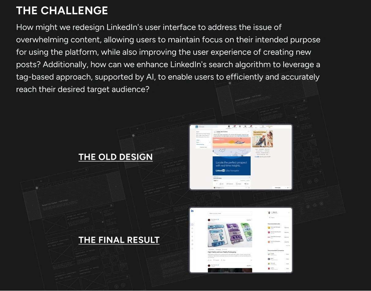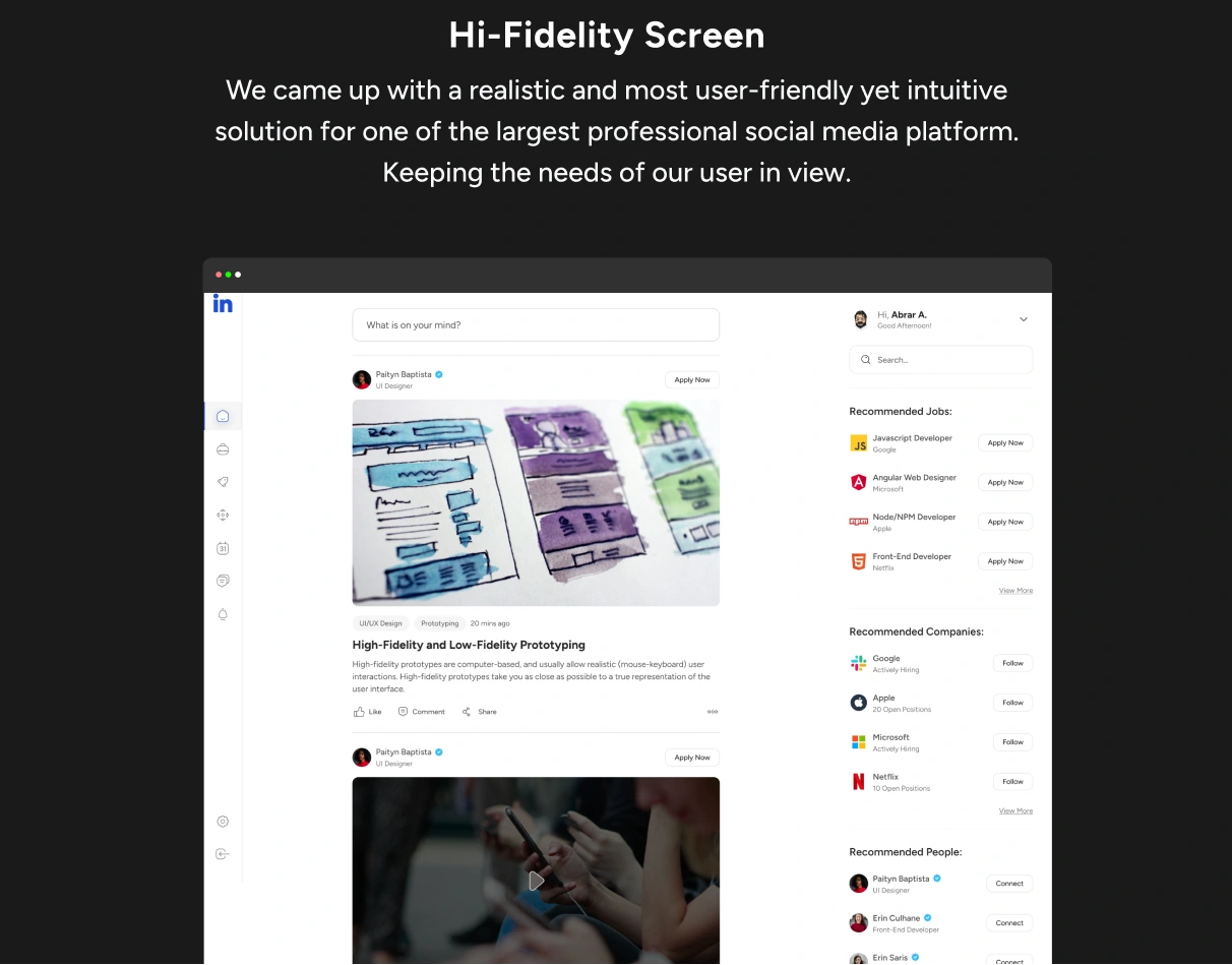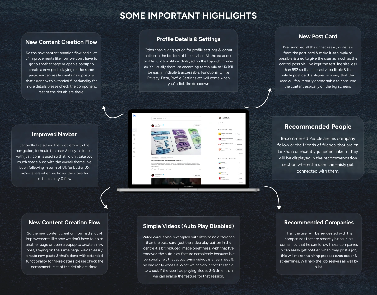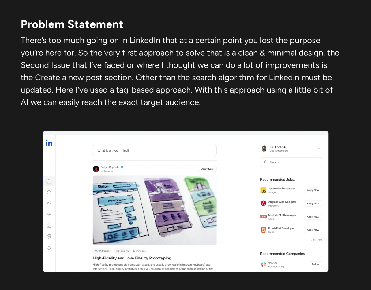 There’s too much going on in LinkedIn that at a certain point you lost the purpose you’re here for. So the very first approach to solve that is a clean & minimal design, the Second Issue that We've faced or where we thought we can do a lot of improvements is the Create a new post section. Other than the search algorithm for Linkedin must be updated. Here we’ve used a tag-based approach. With this approach using a little bit of AI we can easily reach the exact target audience.