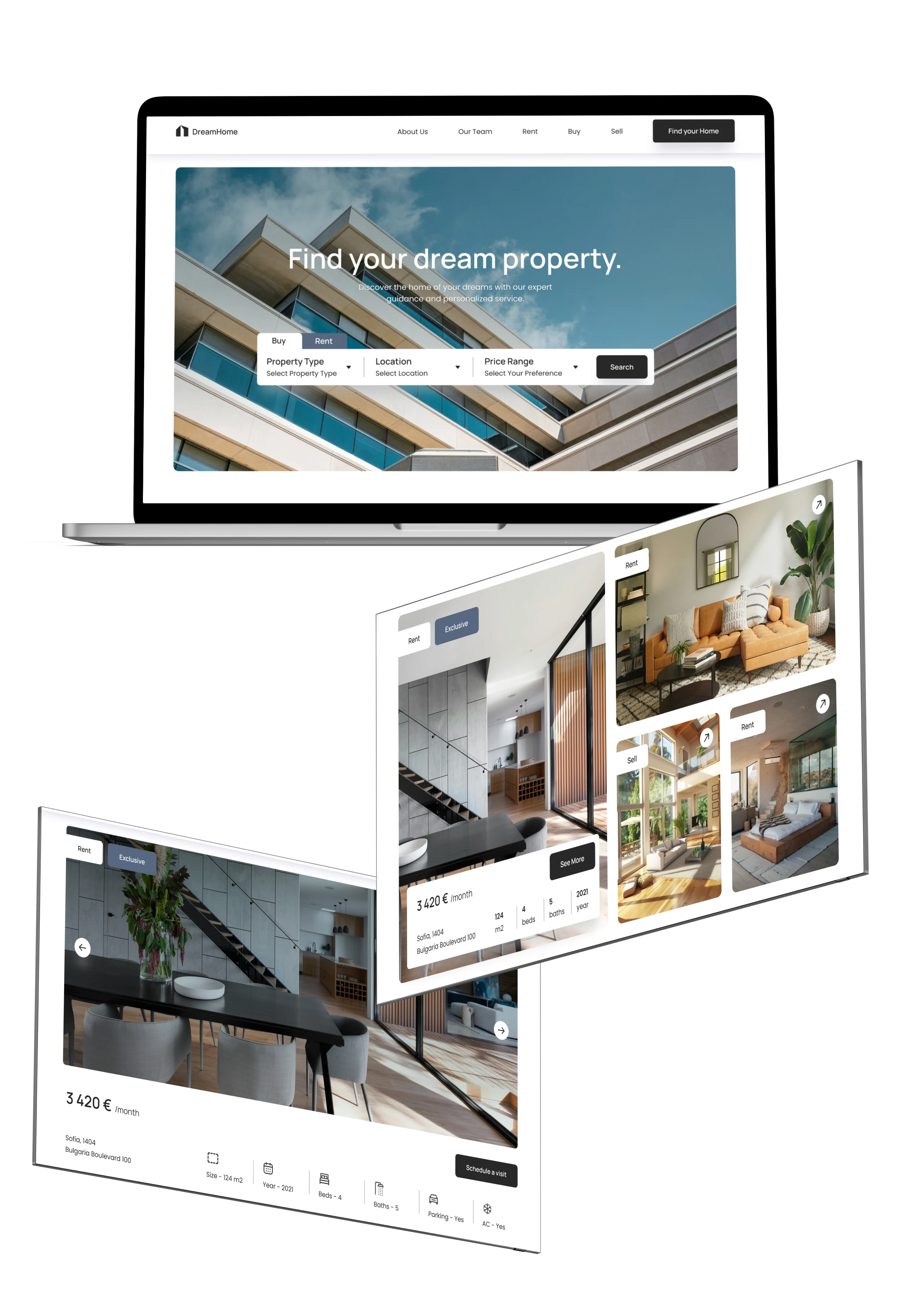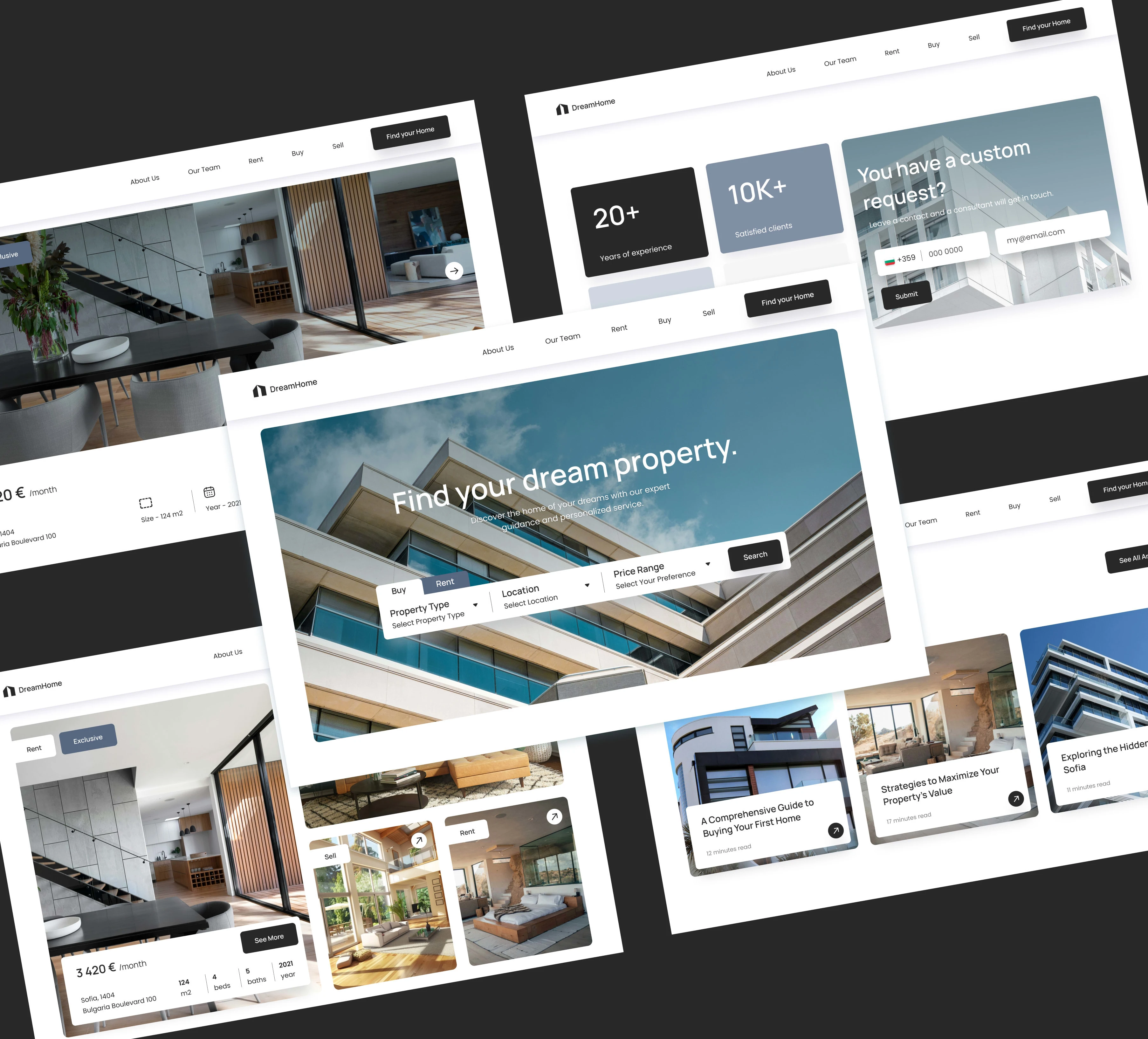 Web design for a real estate listing company. Completed with custom layouts, branding, and UI screens keeping a consistent style throughout.