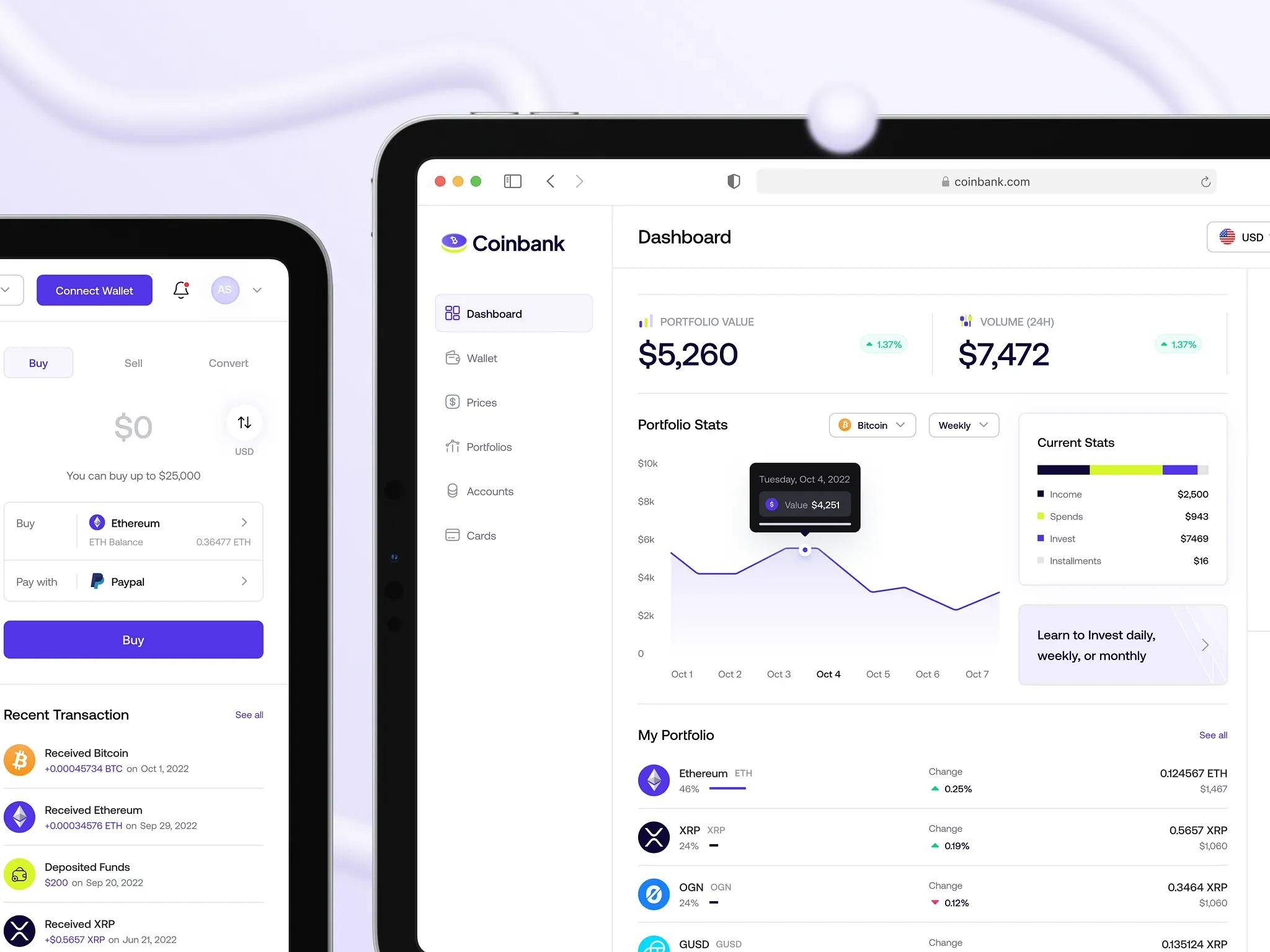 Coinbank is a modern crypto wallet and trading platform that allows users to buy, sell, and manage digital assets with ease. I designed a sleek dashboard experience across desktop and mobile, covering portfolio performance, wallet integration, transaction flows, and conversion tools.