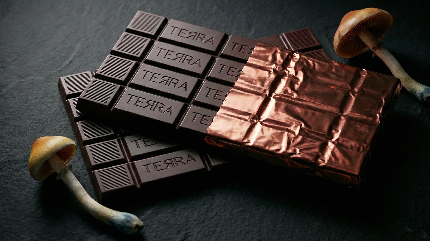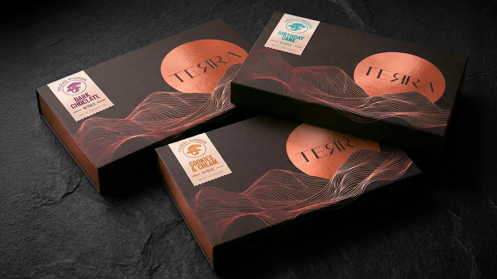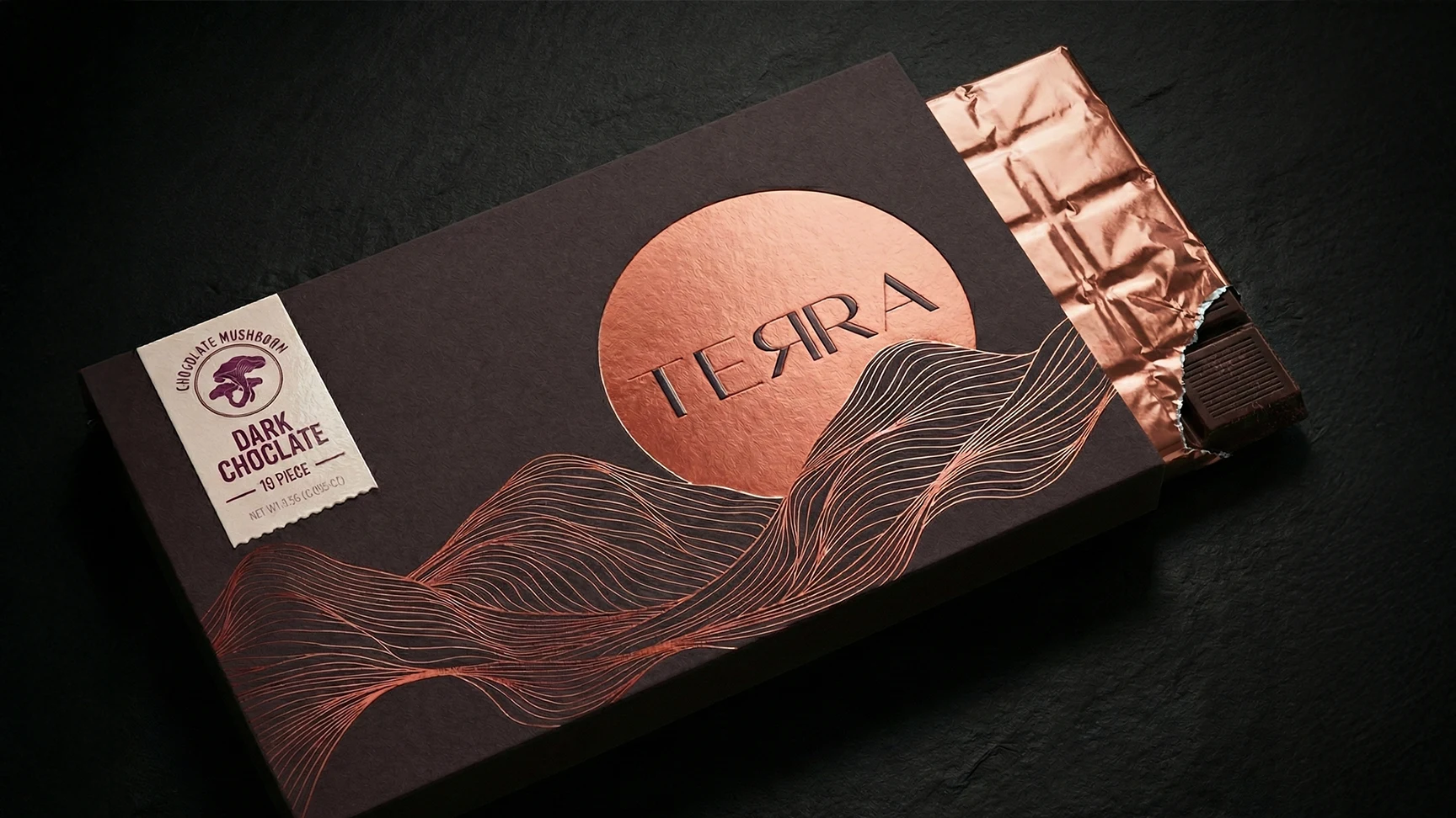 Mushroom Chocolate Bars are rising in popularity among wellness enthusiasts, blending the rich indulgence of premium chocolate with the natural benefits of magic mushrooms. The packaging reflects this unique fusion, featuring a smooth, uplifting design enhanced by earthy copper tones and refined topographic elements. The result is a mindful, balanced aesthetic that conveys both a sense of serenity and premium quality, elevating the experience from the inside out.