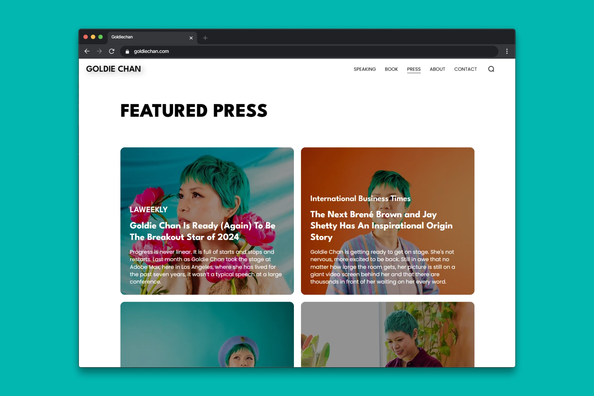 Goldie Chan's existing website does not effectively convey her unique personality, brand identity, and the value she offers to her audience. The current design lacks visual appeal, is difficult to navigate, and fails to engage visitors in a meaningful way.