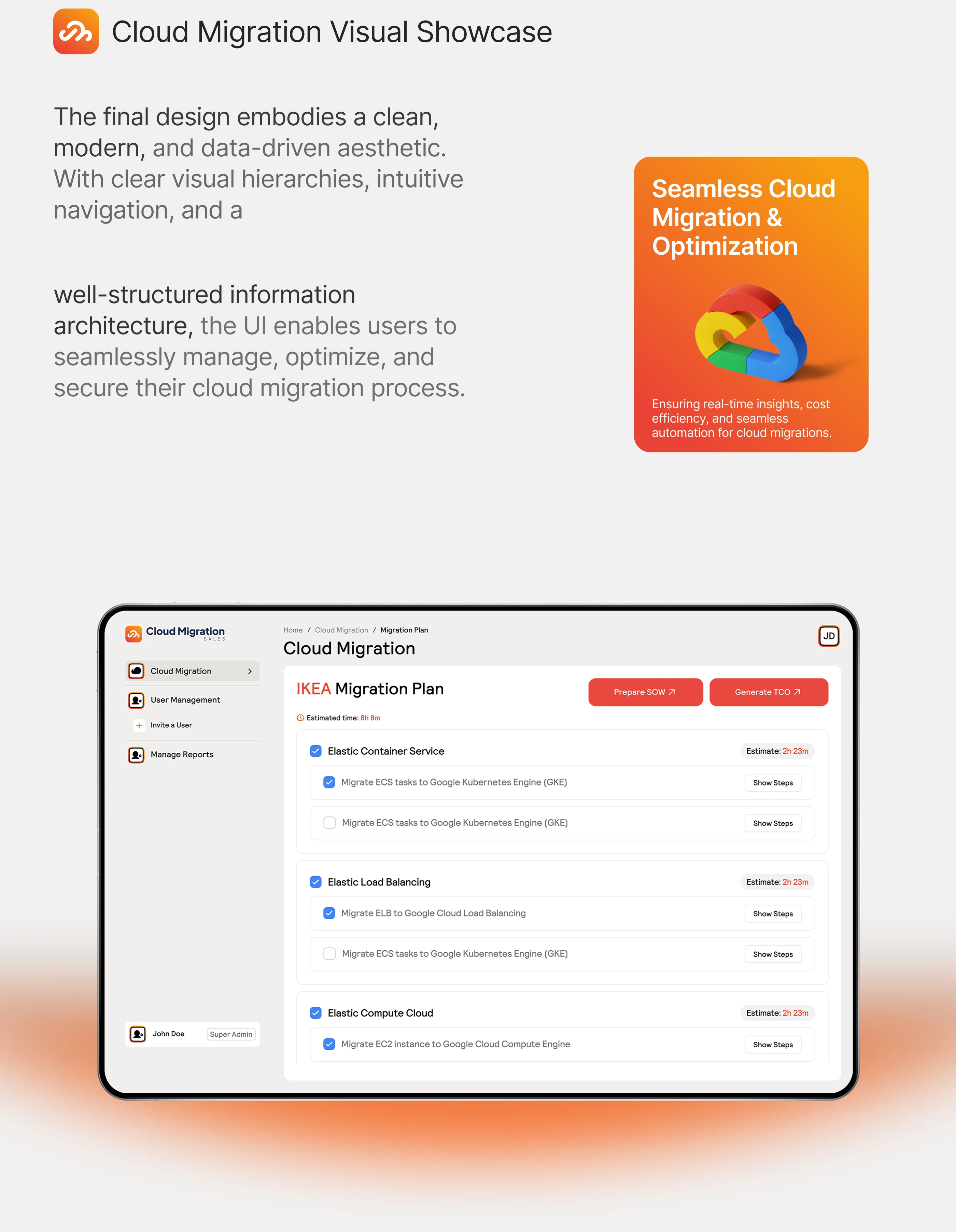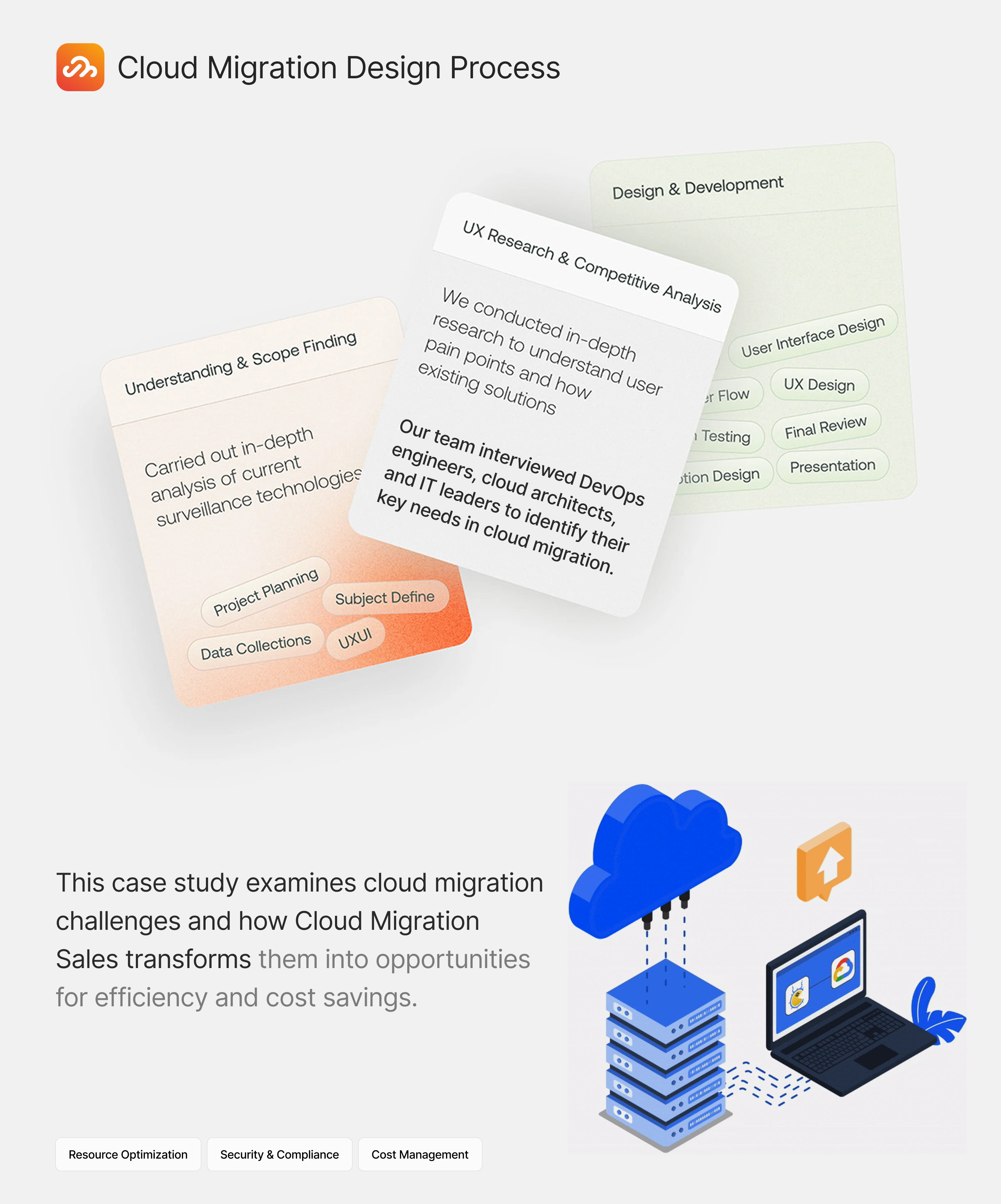 Designed a UI/UX case study for EazyOps’ Cloud Migration Sales extension, simplifying ROI, proposals, and pipeline tracking to speed up cloud deals.