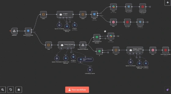 This setup combines Vapi and Twilio to automatically manage voice and SMS interactions through a single webhook, while an AI Agent (OpenAI) processes and stores conversations for smart follow-ups.
