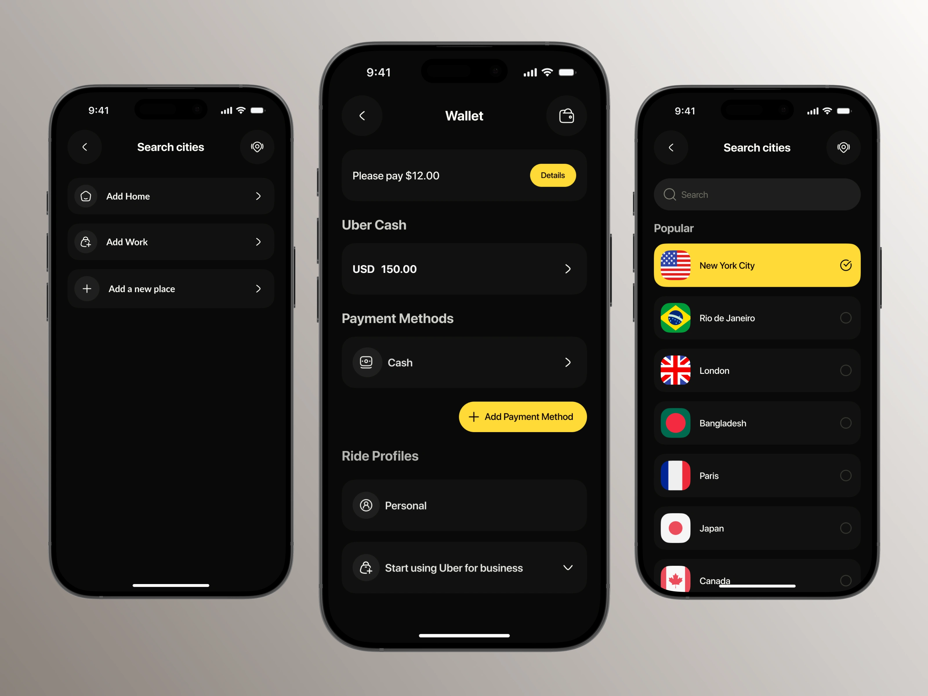 🚖 Modern ride app with fast city search, secure wallet, smart suggestions, vibrant visuals, and seamless booking-to-payment experience.
