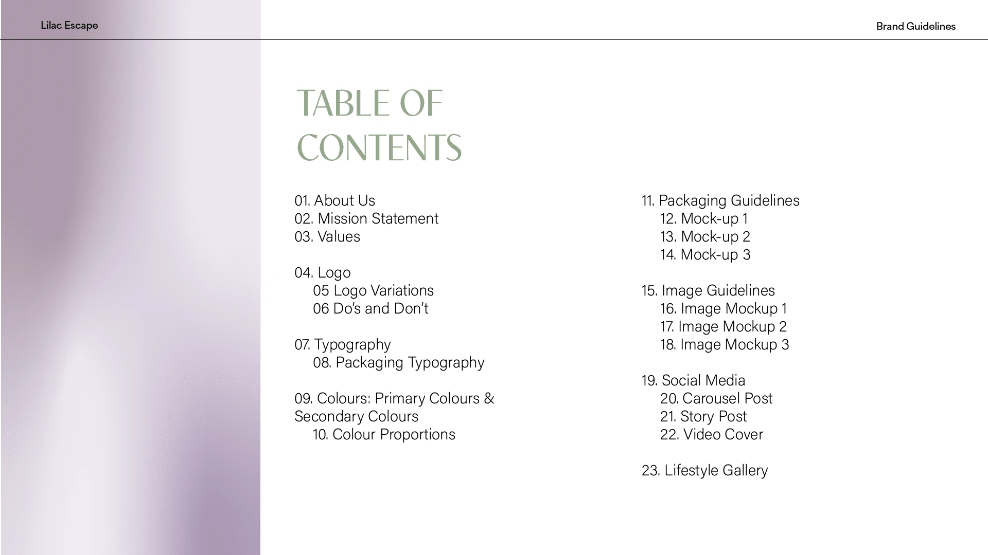 Lilac Escape is a fictional fragrance brand that I created. The goals of this project was to create a full brand standards which includes a new logo, packaging guidelines, social media posts, and mockups that would help reflect the company’s mission and values. To create a consistent and compelling brand identity that would resonate with the target audience and reflect the brand’s essence. The brand standard states a clear guideline on the brand’s logo usage, typography, color palette, imagery, and tone of voice.