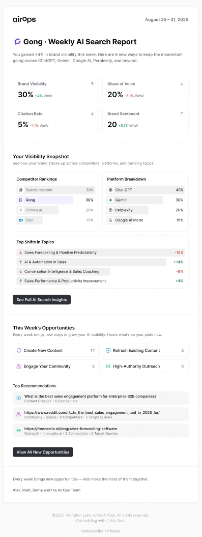 A responsive airOps HTML email for Weekly AI Search Reports. It tracks visibility, competitor trends - and provides actionable growth recommendations.