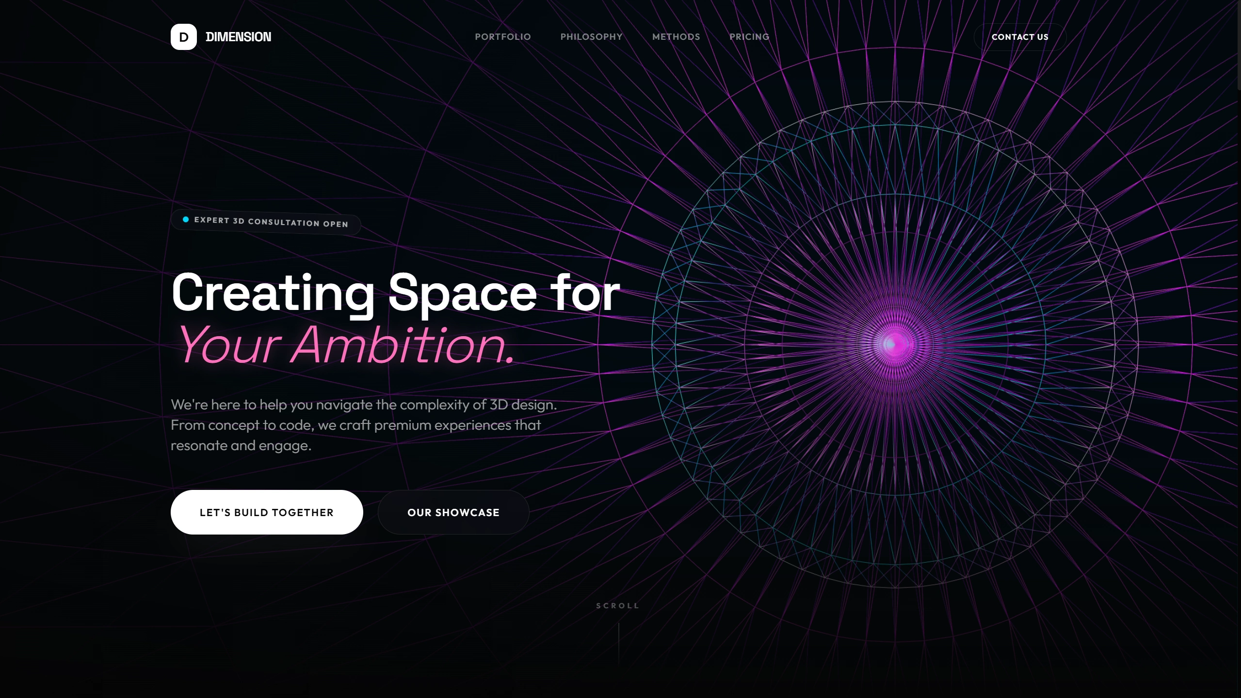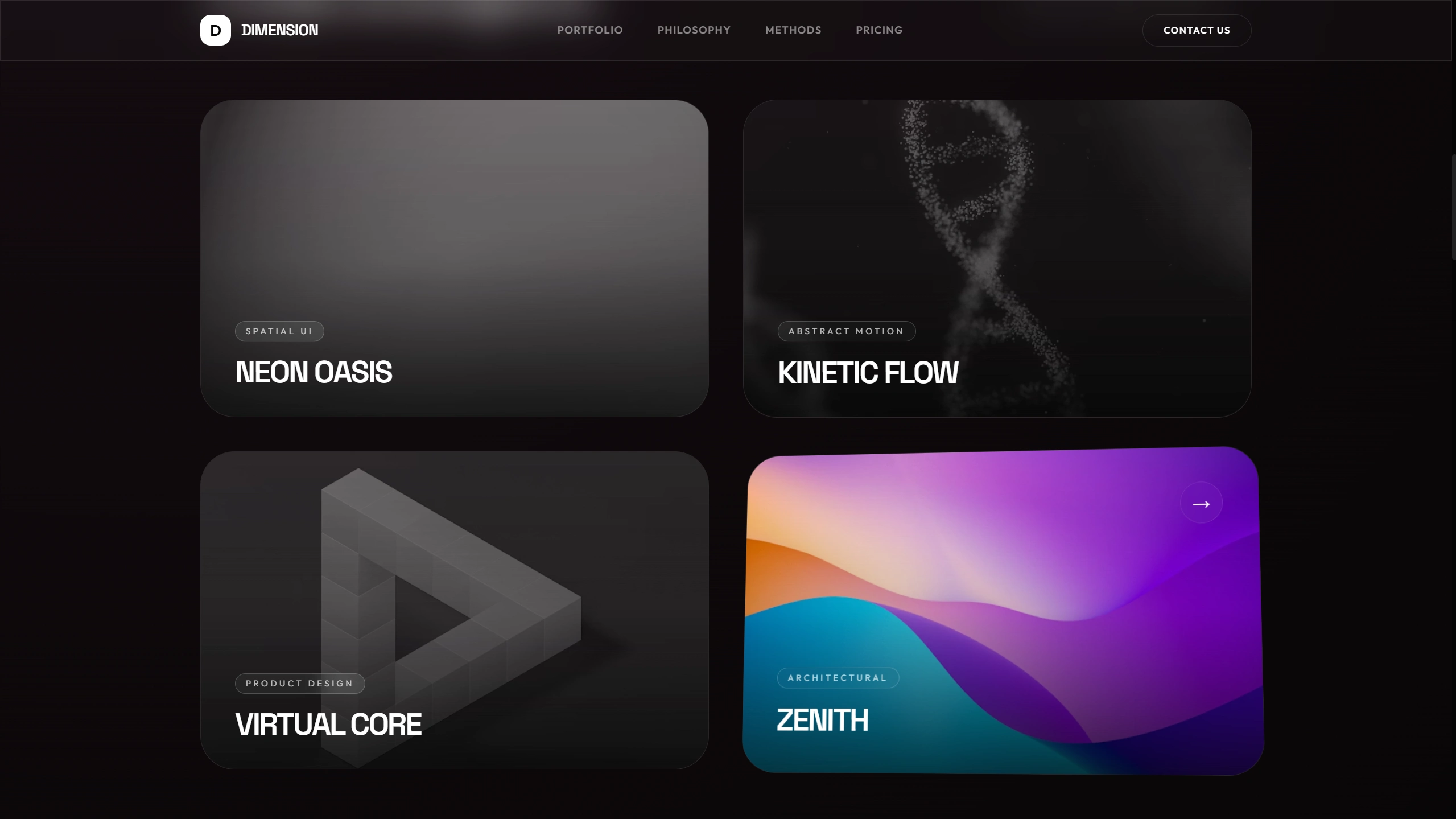 Project cards and philosophy modules respond to cursor movement using CSS 3D transforms, creating subtle perspective tilt and a sense of physical presence.