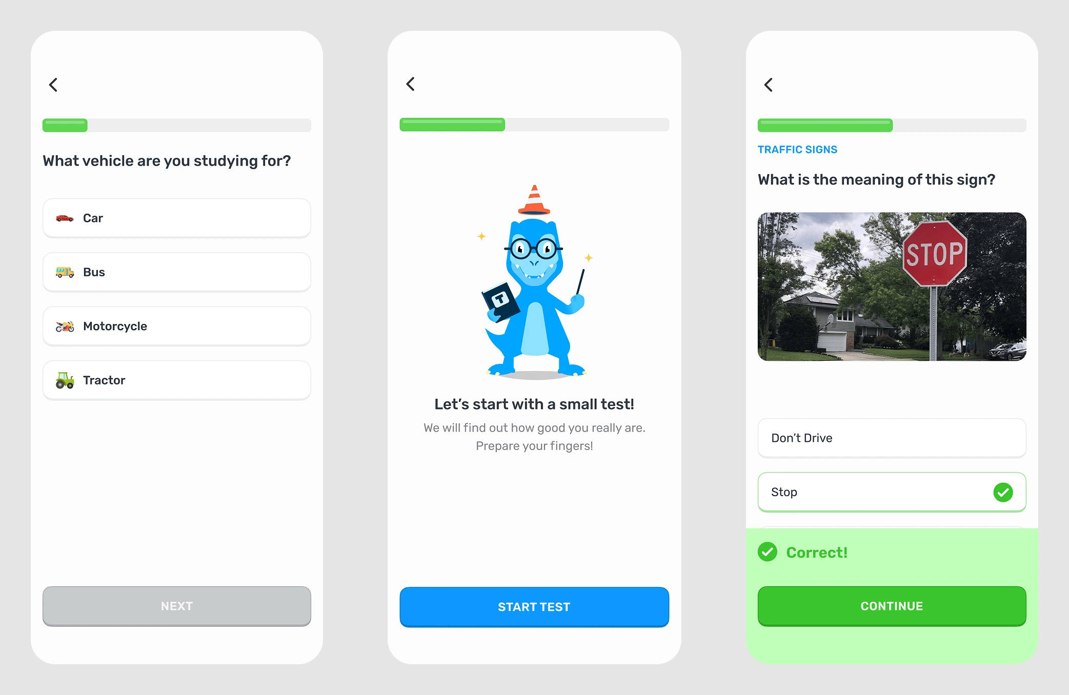 Existing apps for driving school students in Slovakia lacked the attribute of fun, we aimed for users to see preparing for the exams as a fun activity rather than a chore.