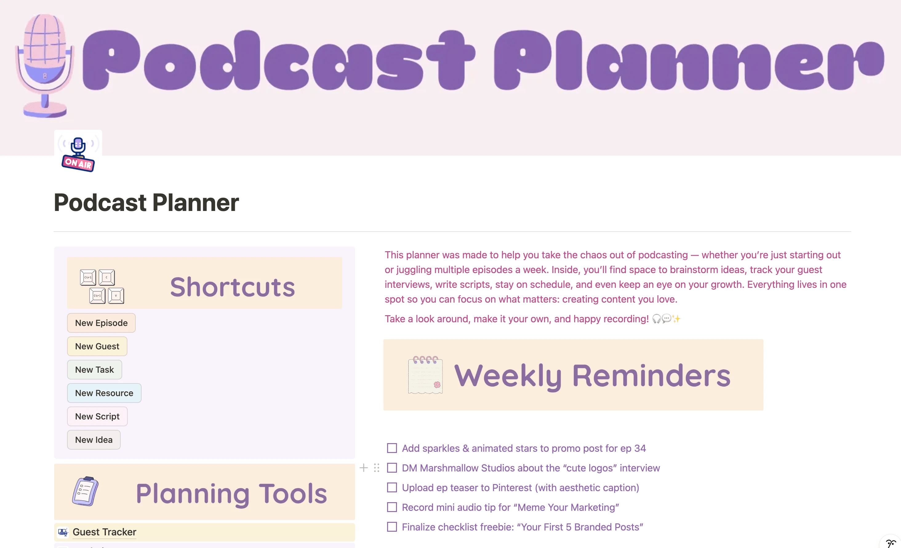 This is a podcast planner template I created in Notion. (Kawaii version)