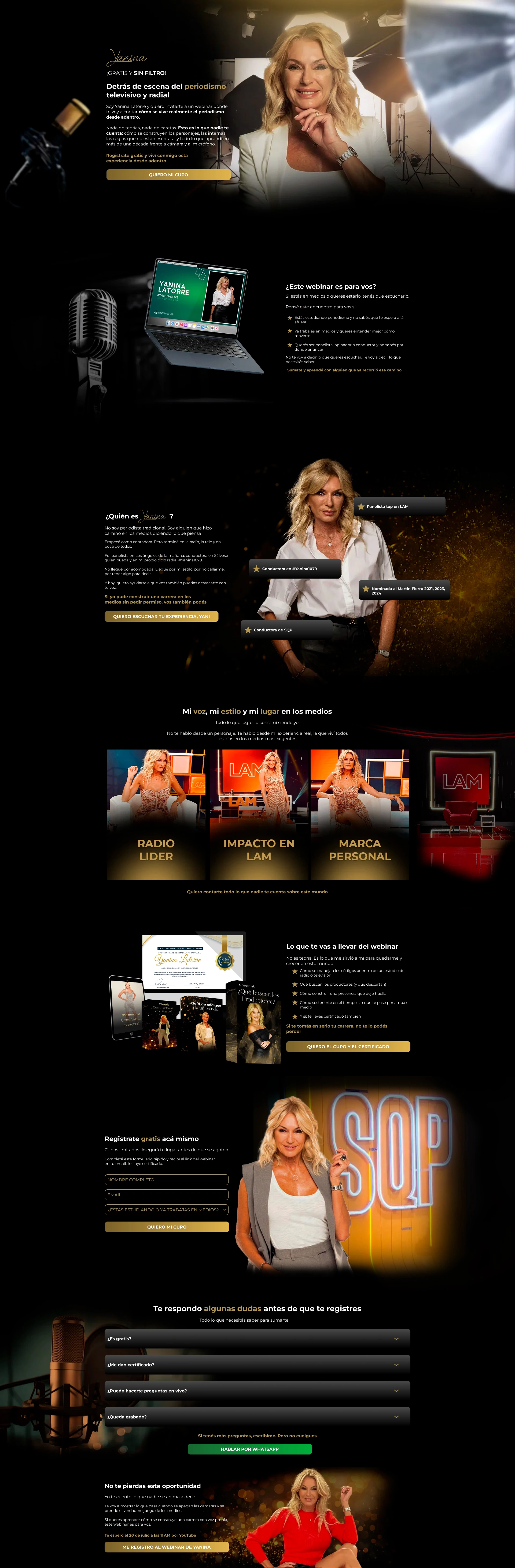 Este proyecto consistió en la creación de una landing page promocional para un webinar gratuito impartido por Yanina Latorre, figura destacada del periodismo televisivo y radial en Argentina. El objetivo principal fue transmitir profesionalismo y cercanía, resaltando la trayectoria de Yanina y los beneficios exclusivos que los asistentes pueden obtener al participar en el evento. Para lograrlo, se diseñó una página moderna y dinámica con una estructura clara, destacando elementos visuales como fotografías de alta calidad, colores dorados que evocan elegancia y exclusividad, y una navegación intuitiva.