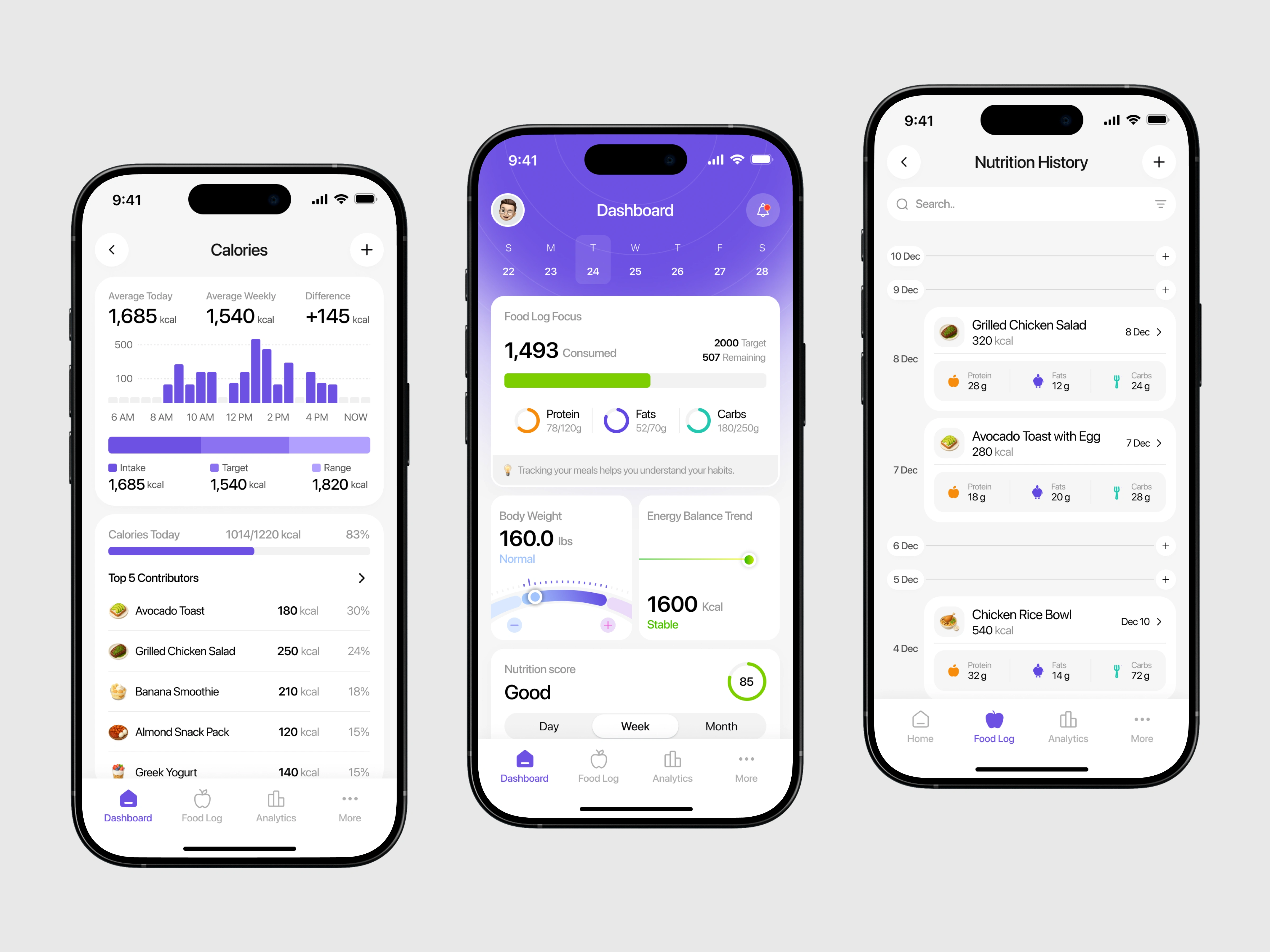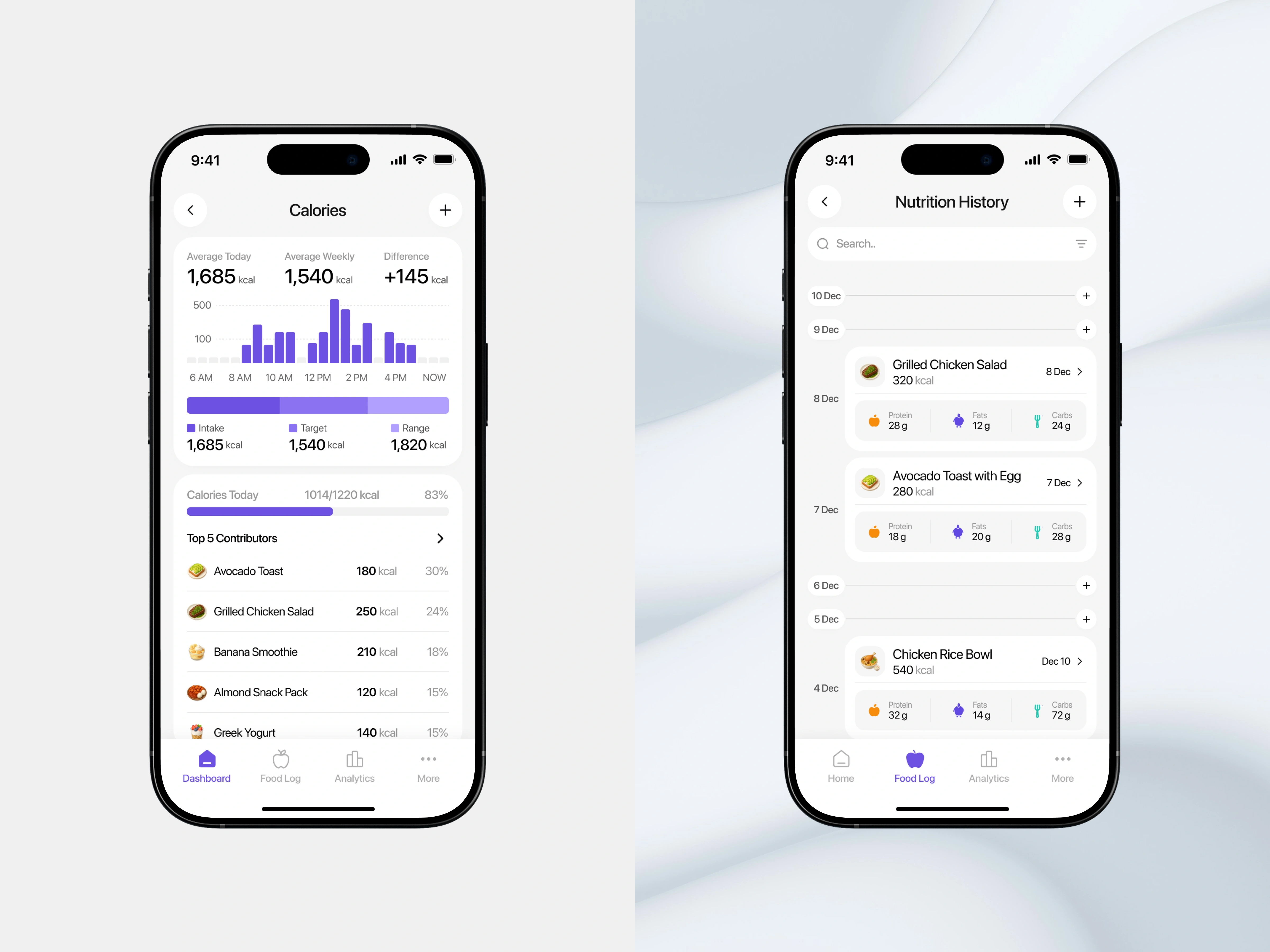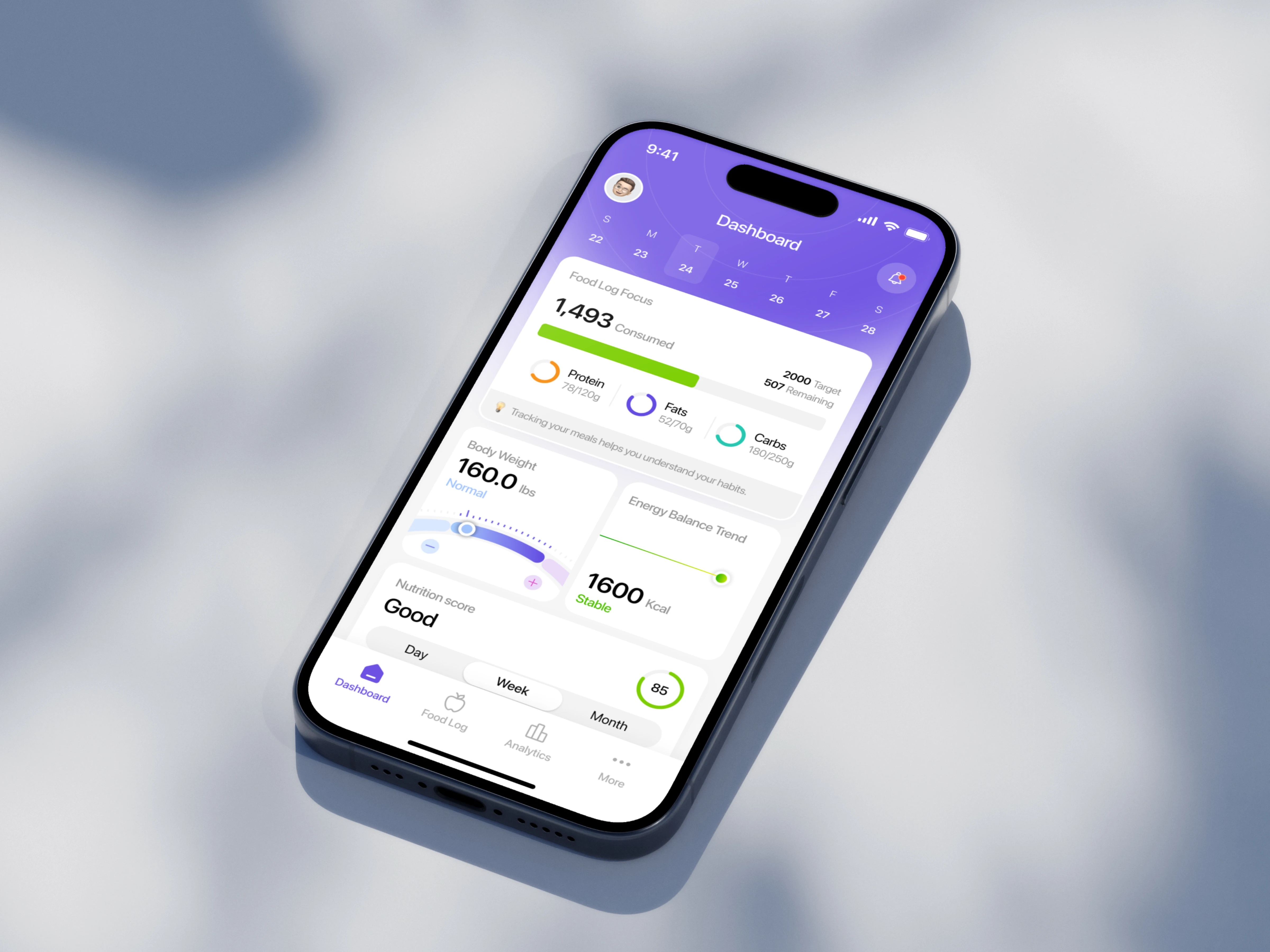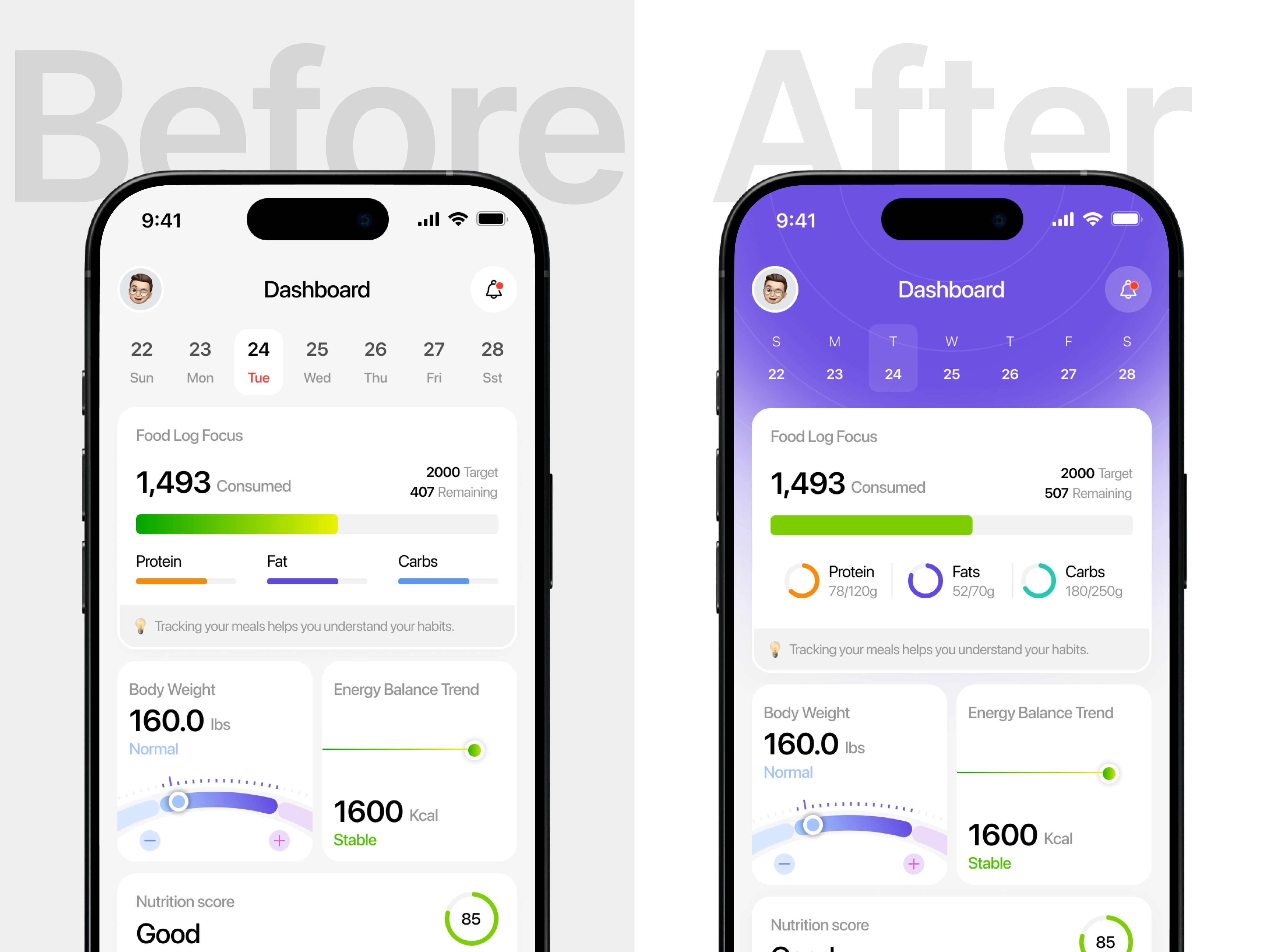 We focused on a clean, card-based layout that highlights essential nutrition data at a glance. The interface prioritizes daily calories, macro distribution, and progress indicators while keeping interactions simple and mobile-friendly.