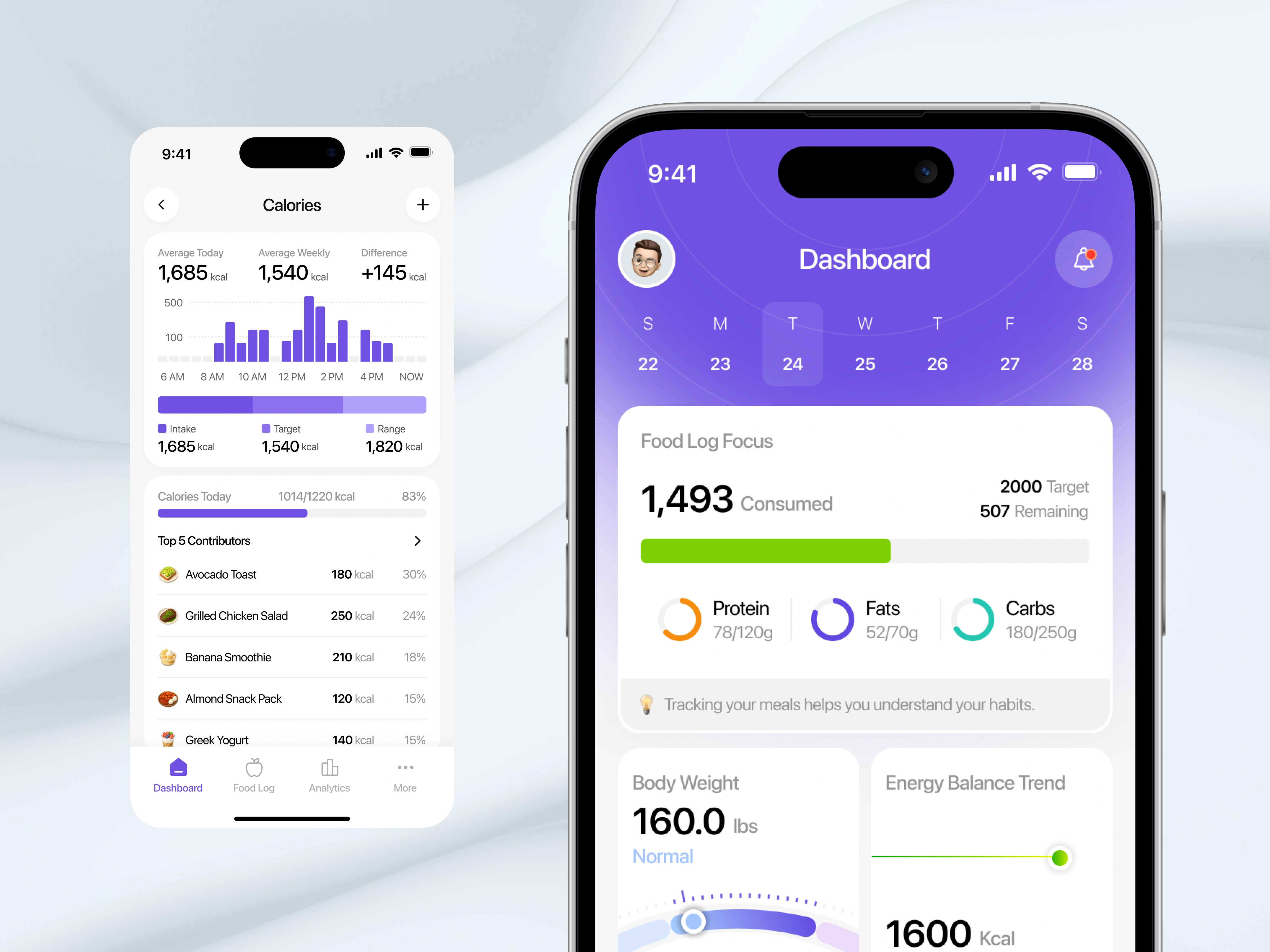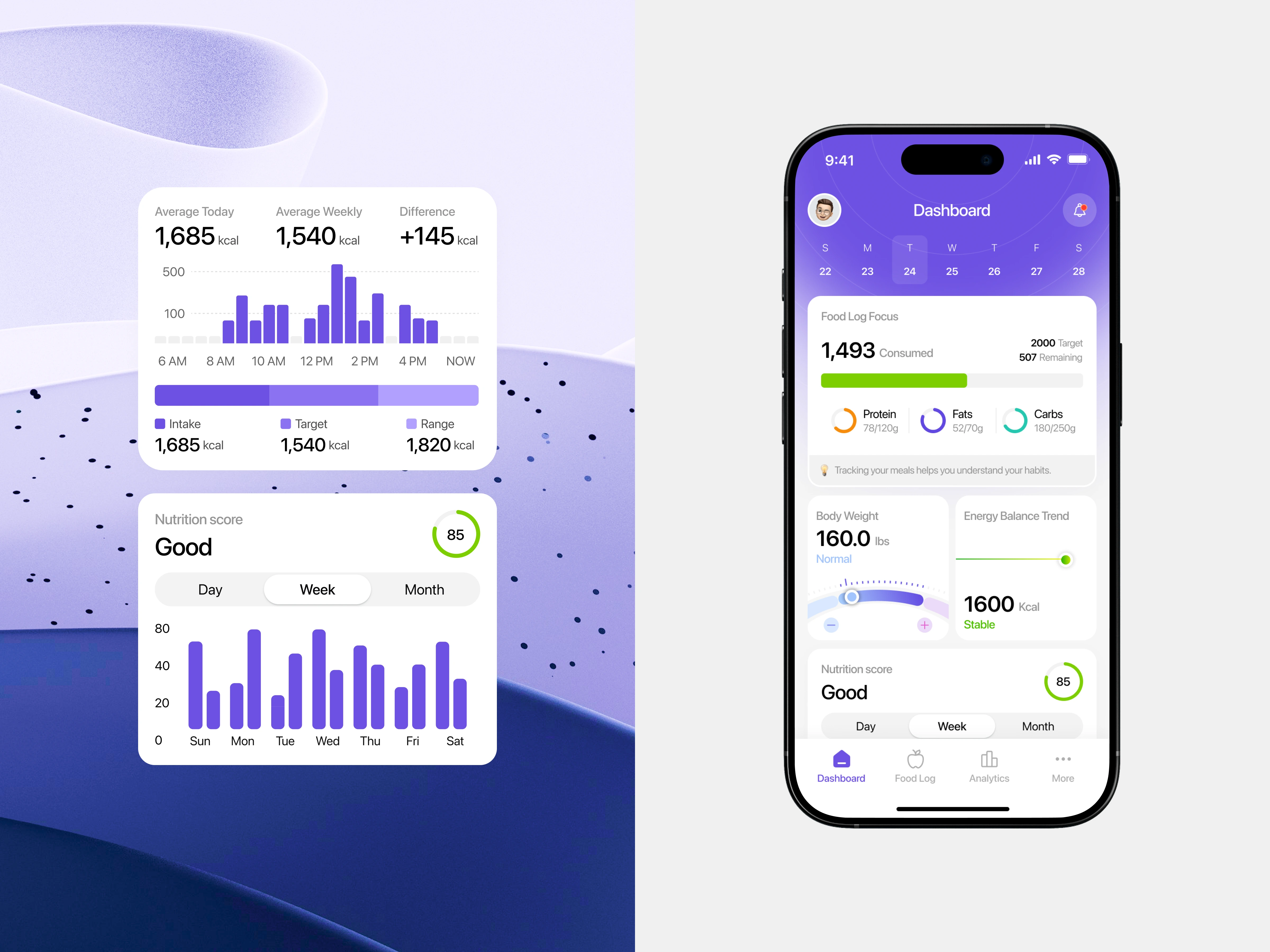 Many nutrition apps overwhelm users with complex charts and excessive numbers. Users often struggle to understand calorie intake, macro balance, and progress trends on small mobile screens.