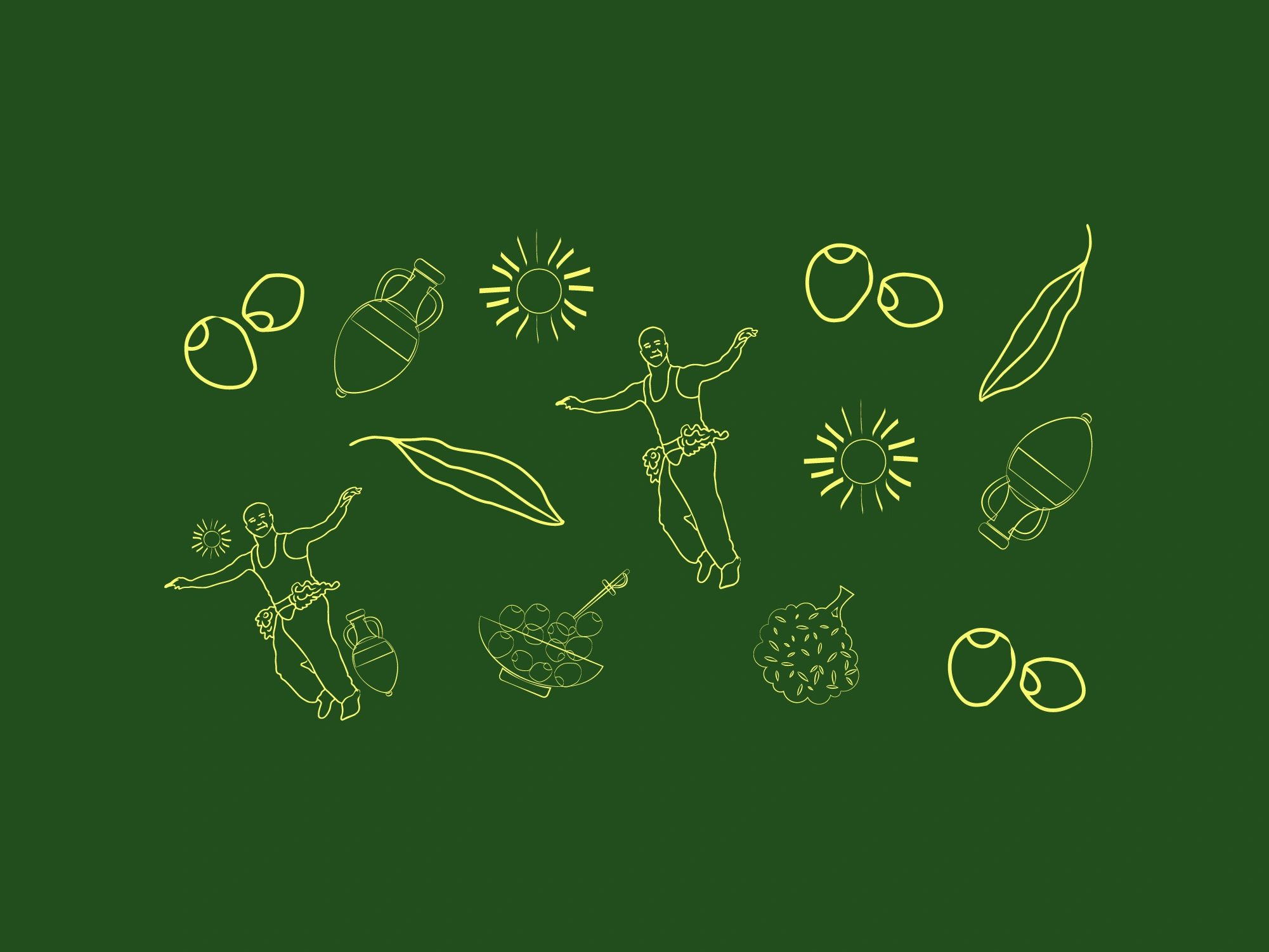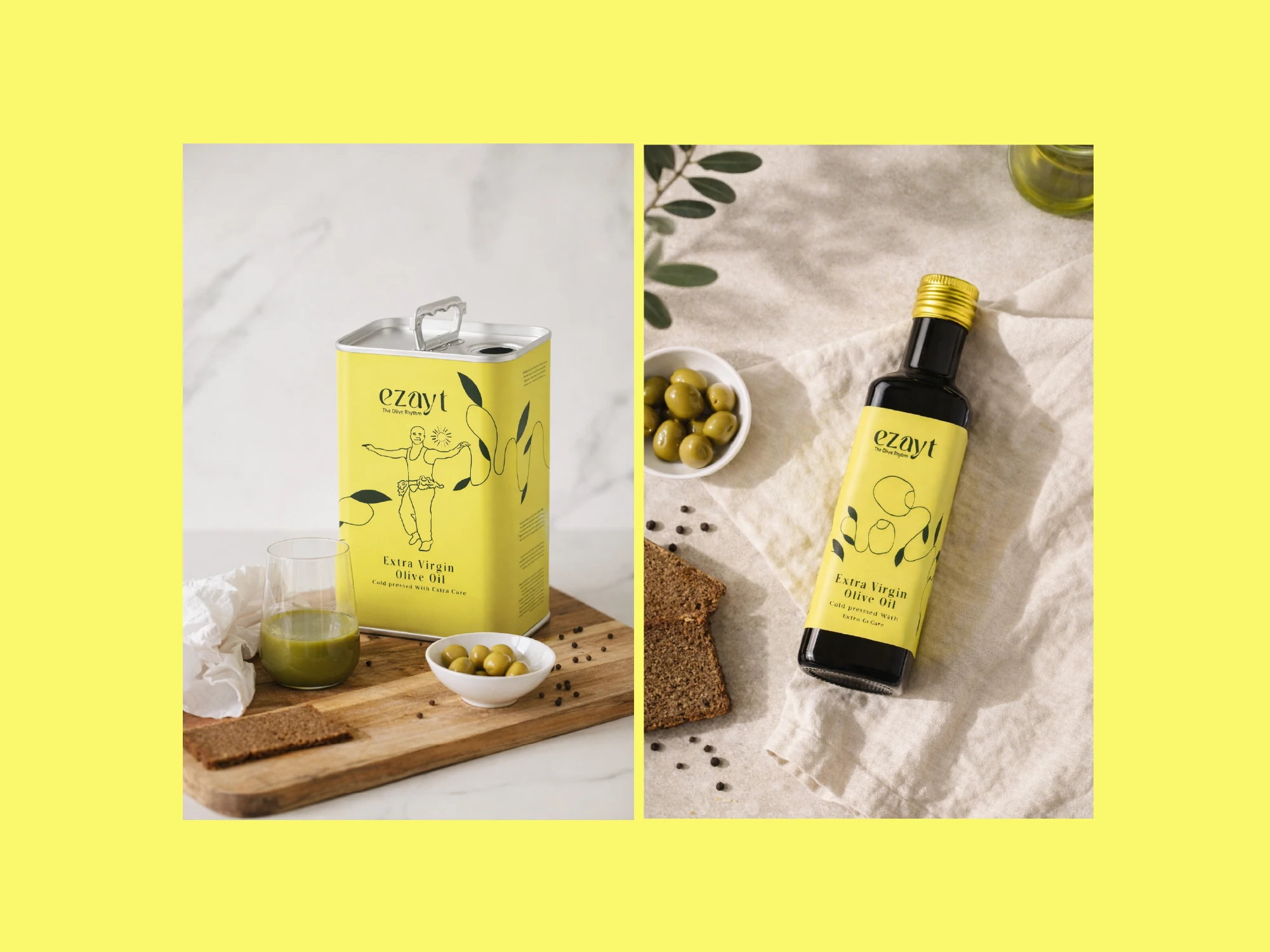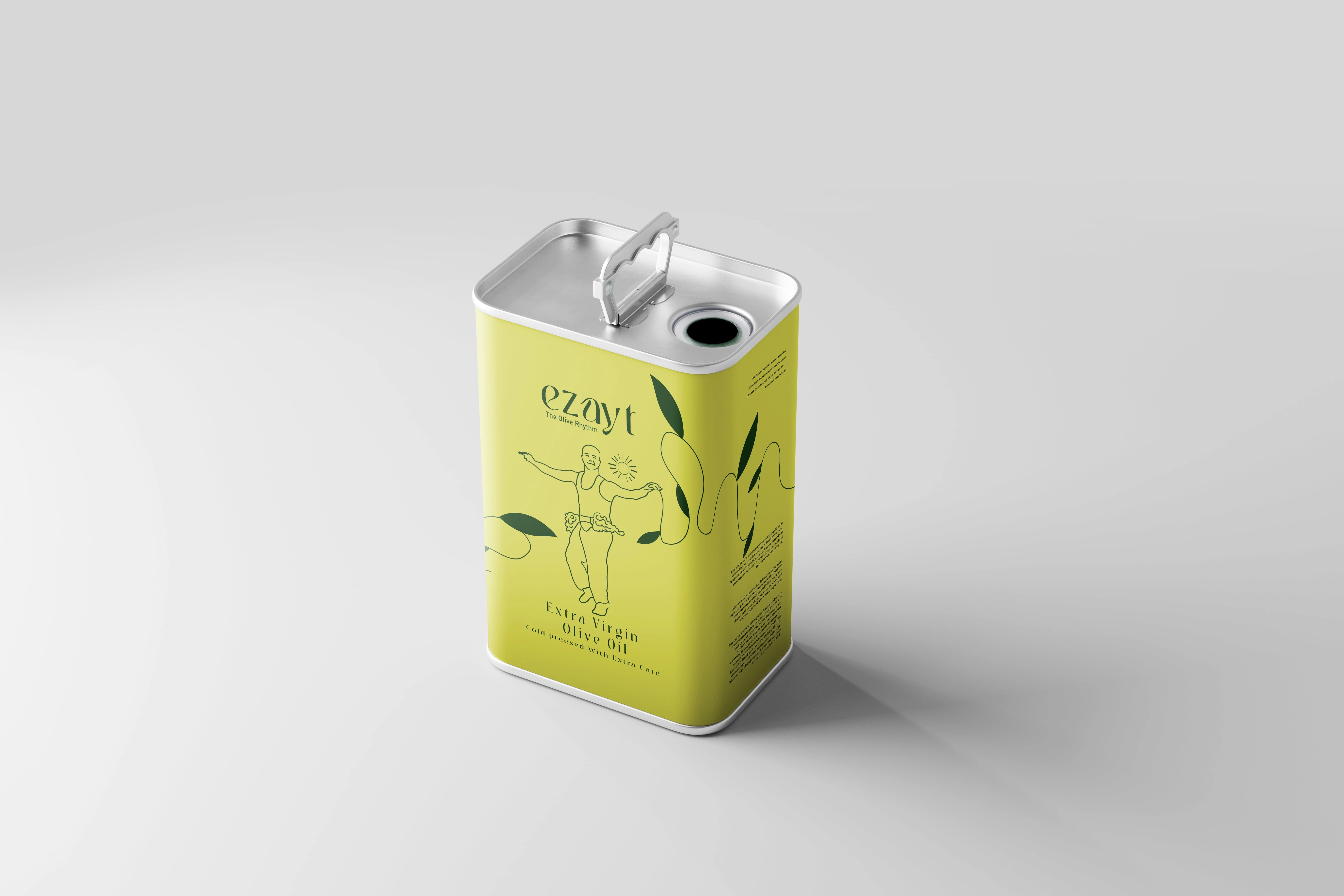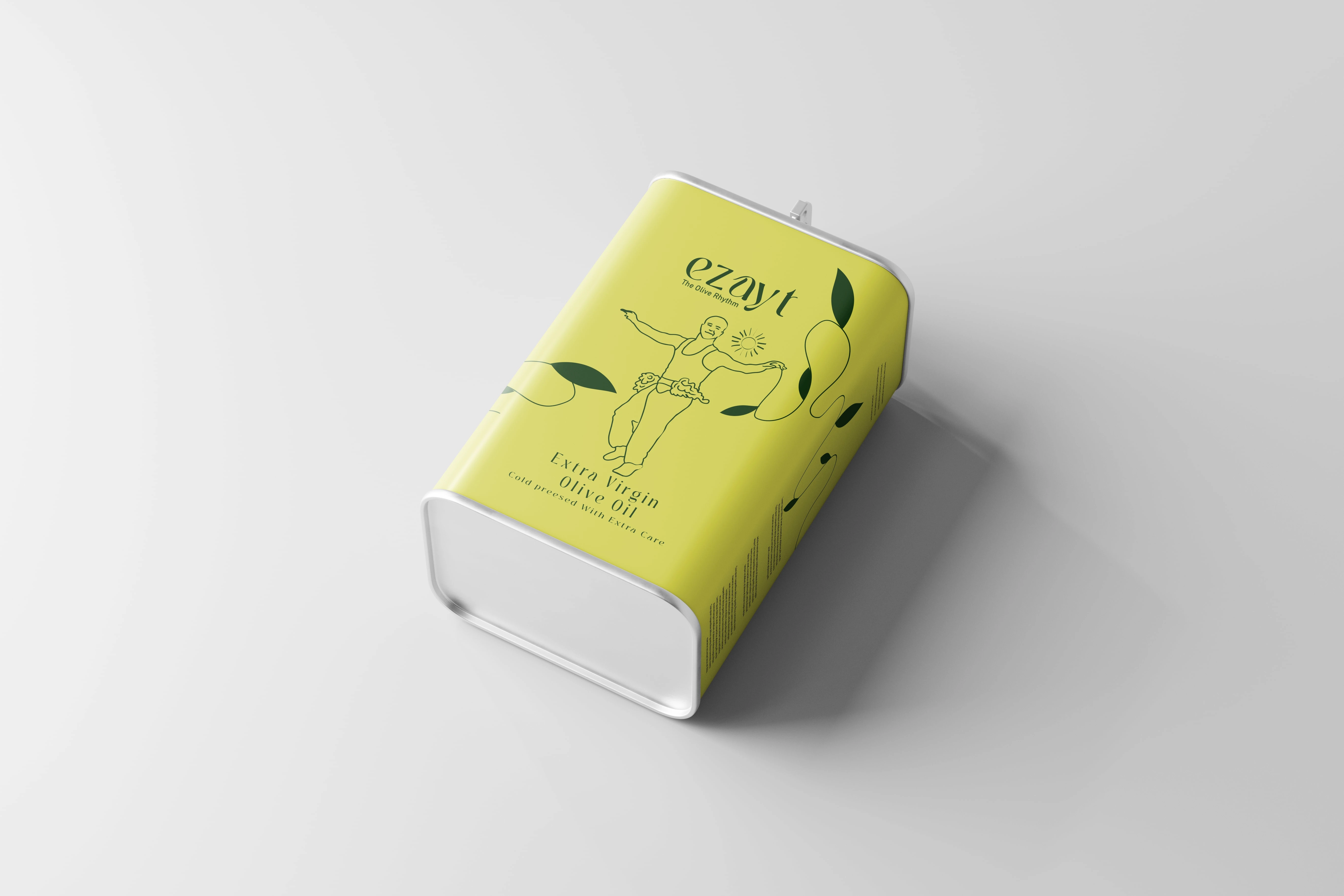 The packaging emphasizes simplicity and elegance while telling a story. The label incorporates fluid illustrations inspired by traditional dance and olive harvesting, reflecting the movement and rhythm of the harvest. Combined with the logo and green-yellow color palette, the design creates a modern, clean, and culturally rich look that stands out on shelves.