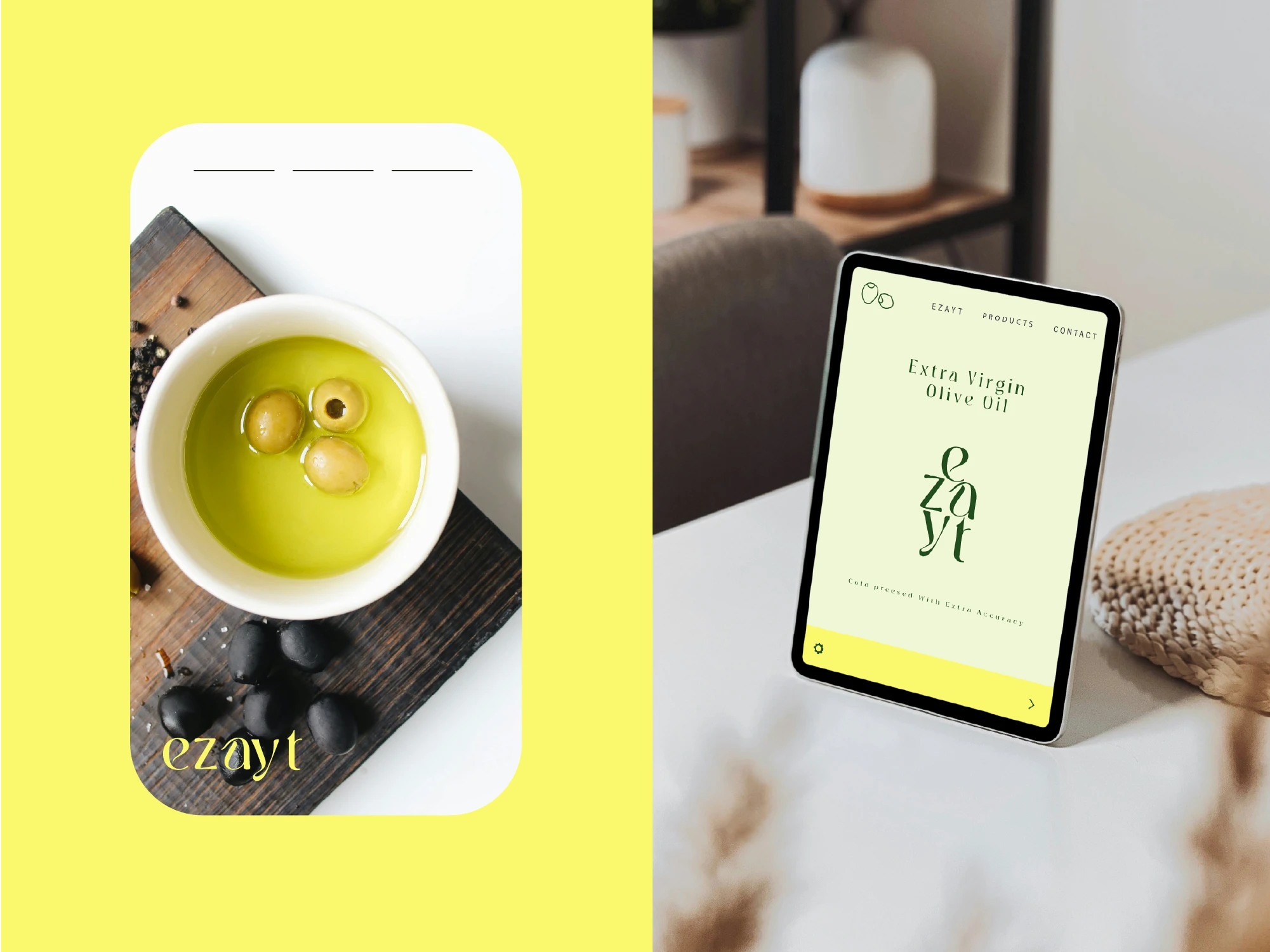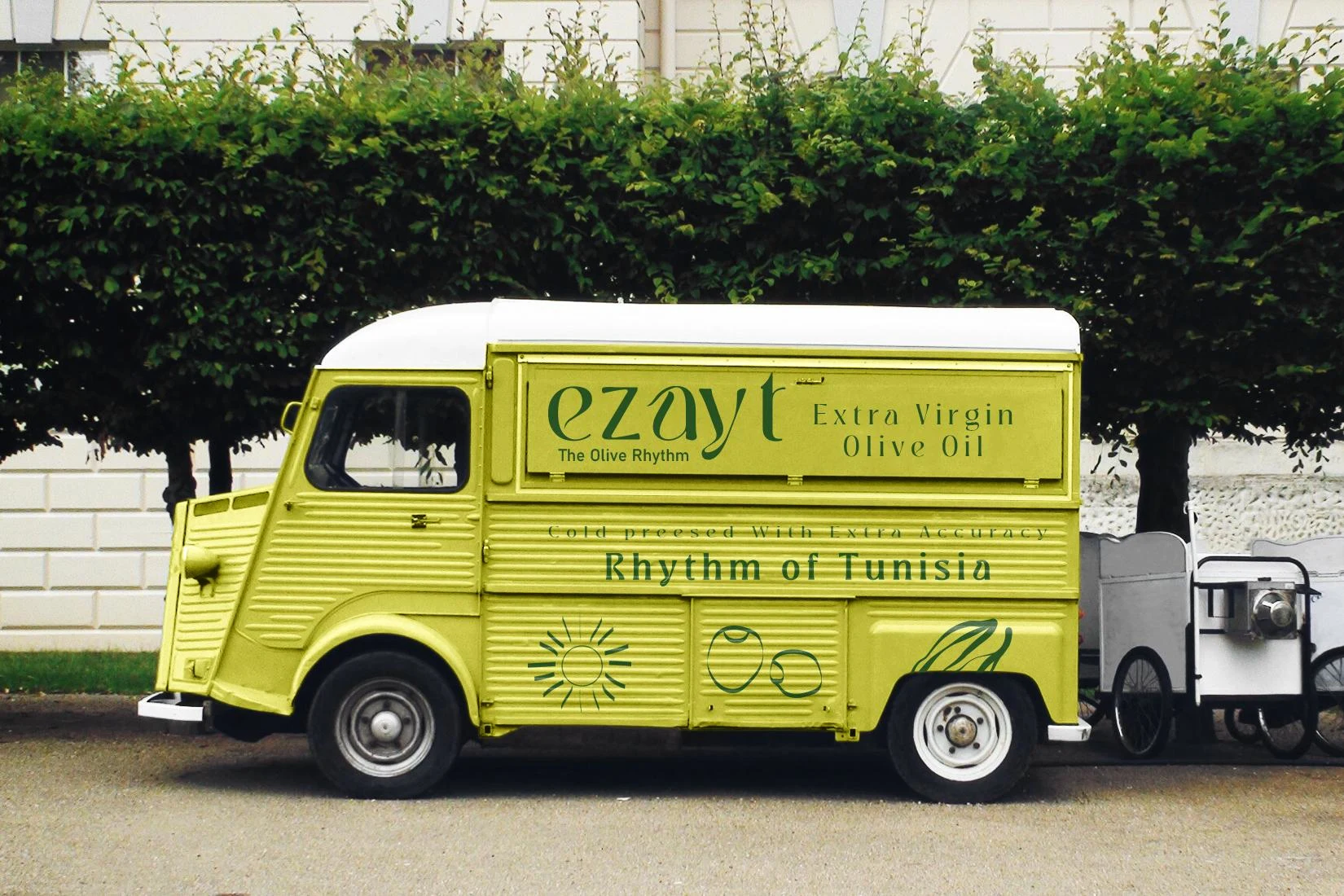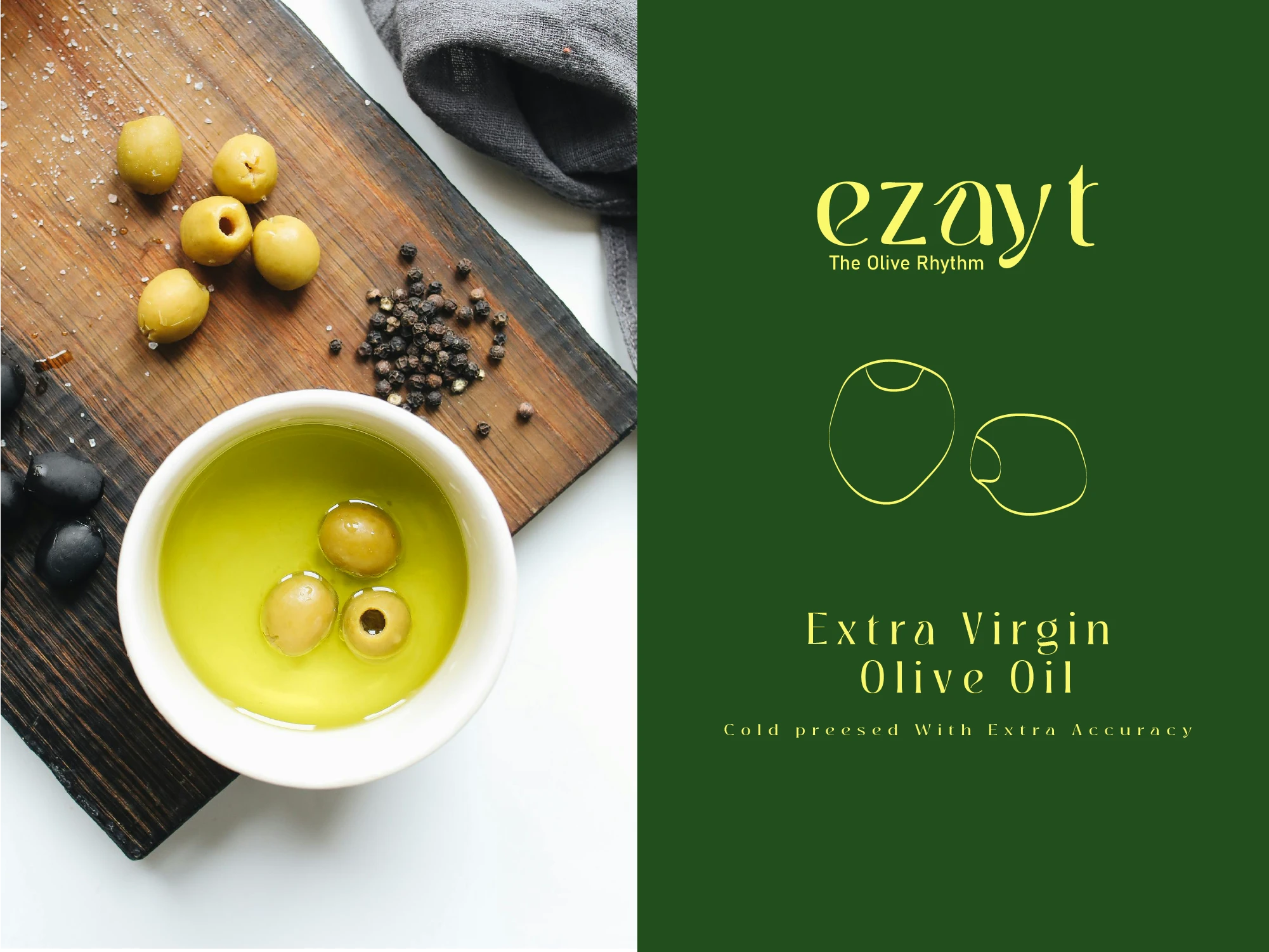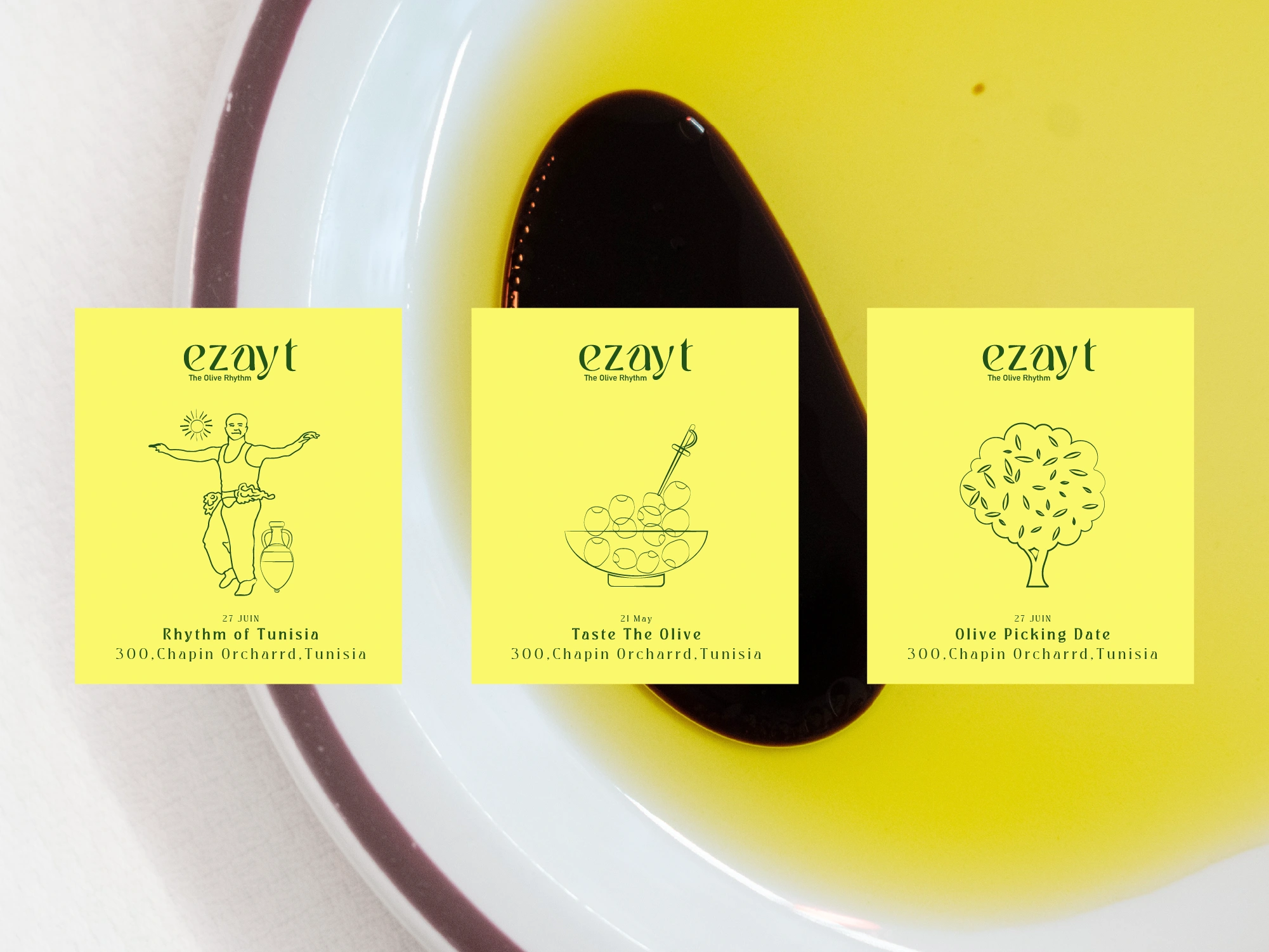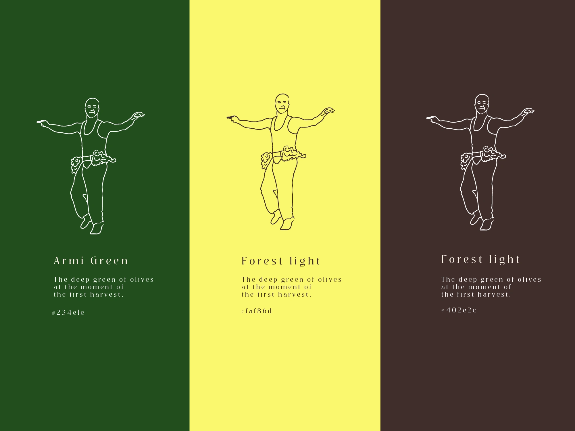 The packaging emphasizes simplicity and elegance while telling a story. The label incorporates fluid illustrations inspired by traditional dance and olive harvesting, reflecting the movement and rhythm of the harvest. Combined with the logo and green-yellow color palette, the design creates a modern, clean, and culturally rich look that stands out on shelves.