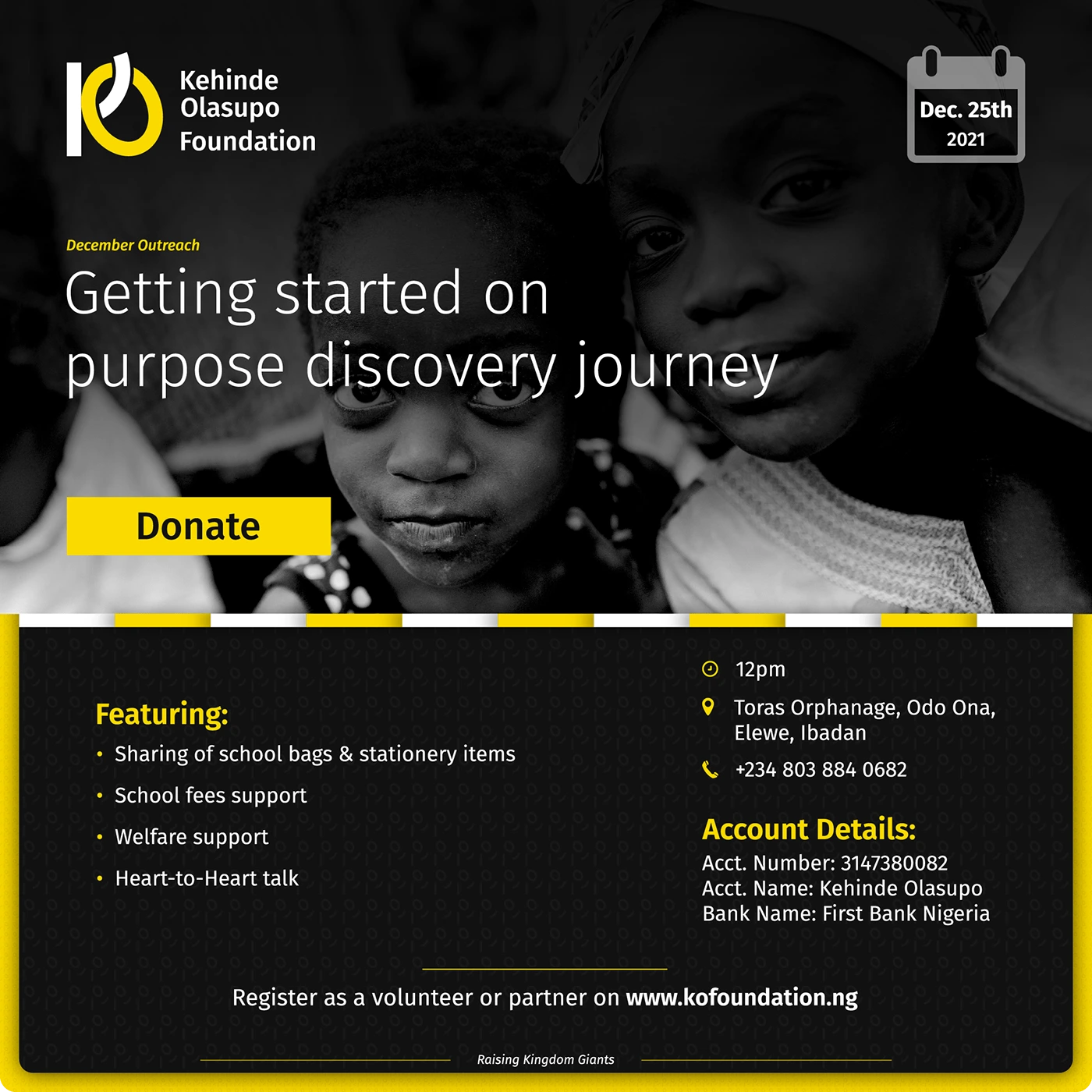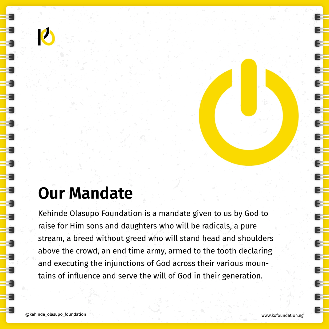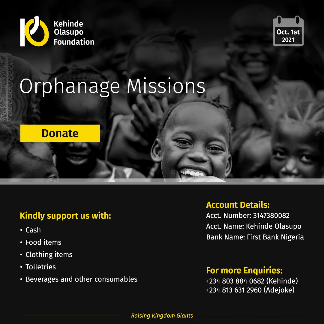 KOF (Kehinde Olasupo Foundation) is a charity foundation that seeks direction from the divine mandate given to Mr Kehinde Olasupo. KOF is a mandate God gave him to raise others as God has raised him. KOF is an Orphanage missions commanded by God. With a mandate to raise sons and daughters, kingdom giants for Him.