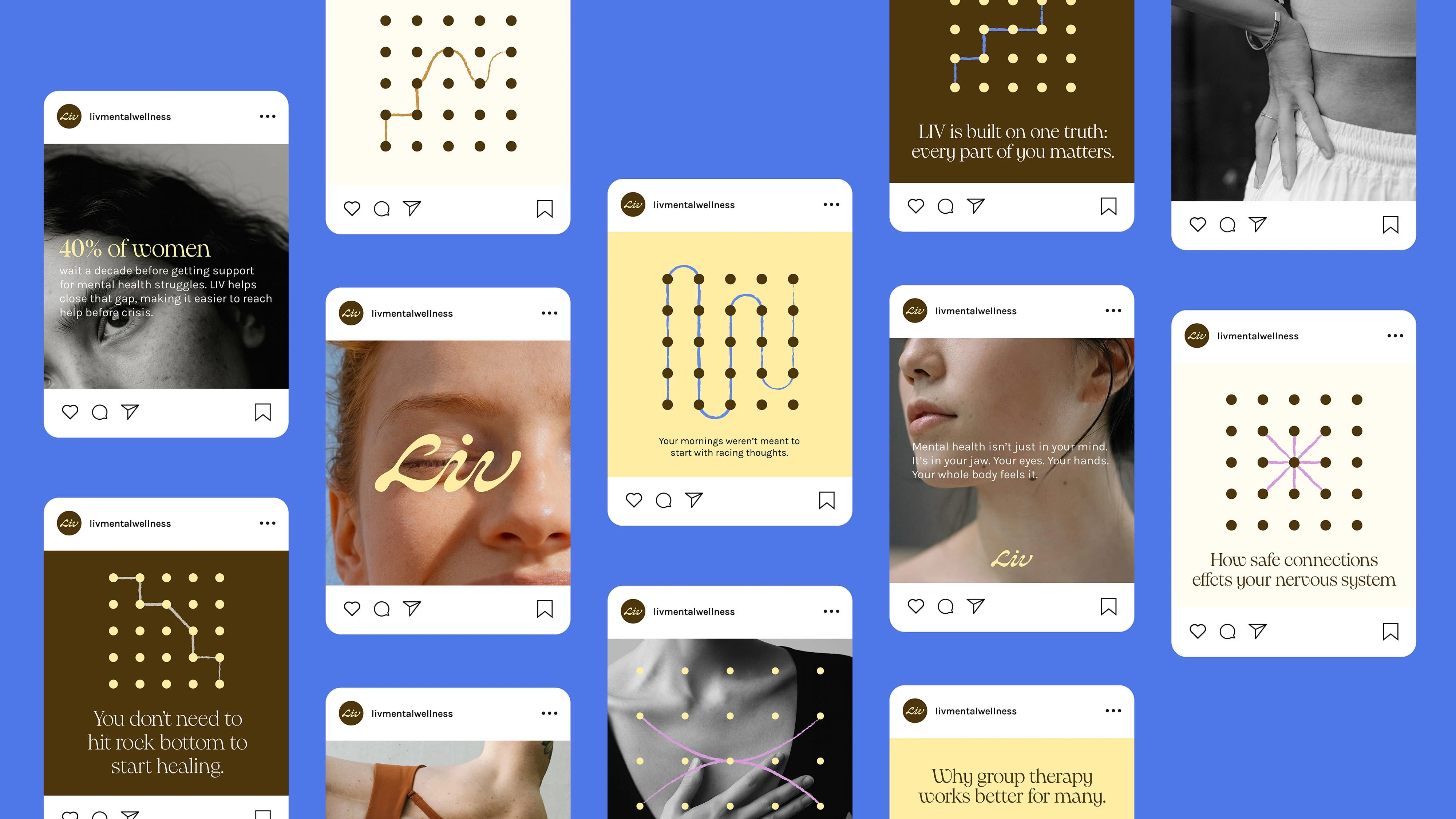 Designed a modern brand identity for LIV Mental Wellness centered on connection, clarity, and an intuitive modular visual system.