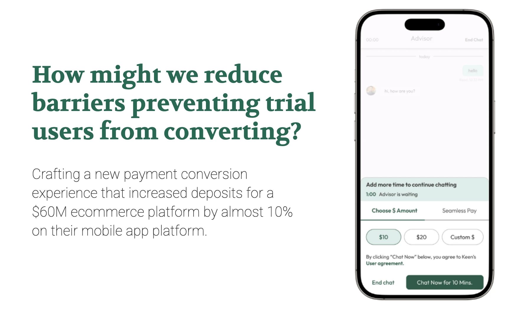 Crafted a new payment conversion experience that increased deposits for a $60M ecommerce platform by almost 10% on their mobile app platform.
