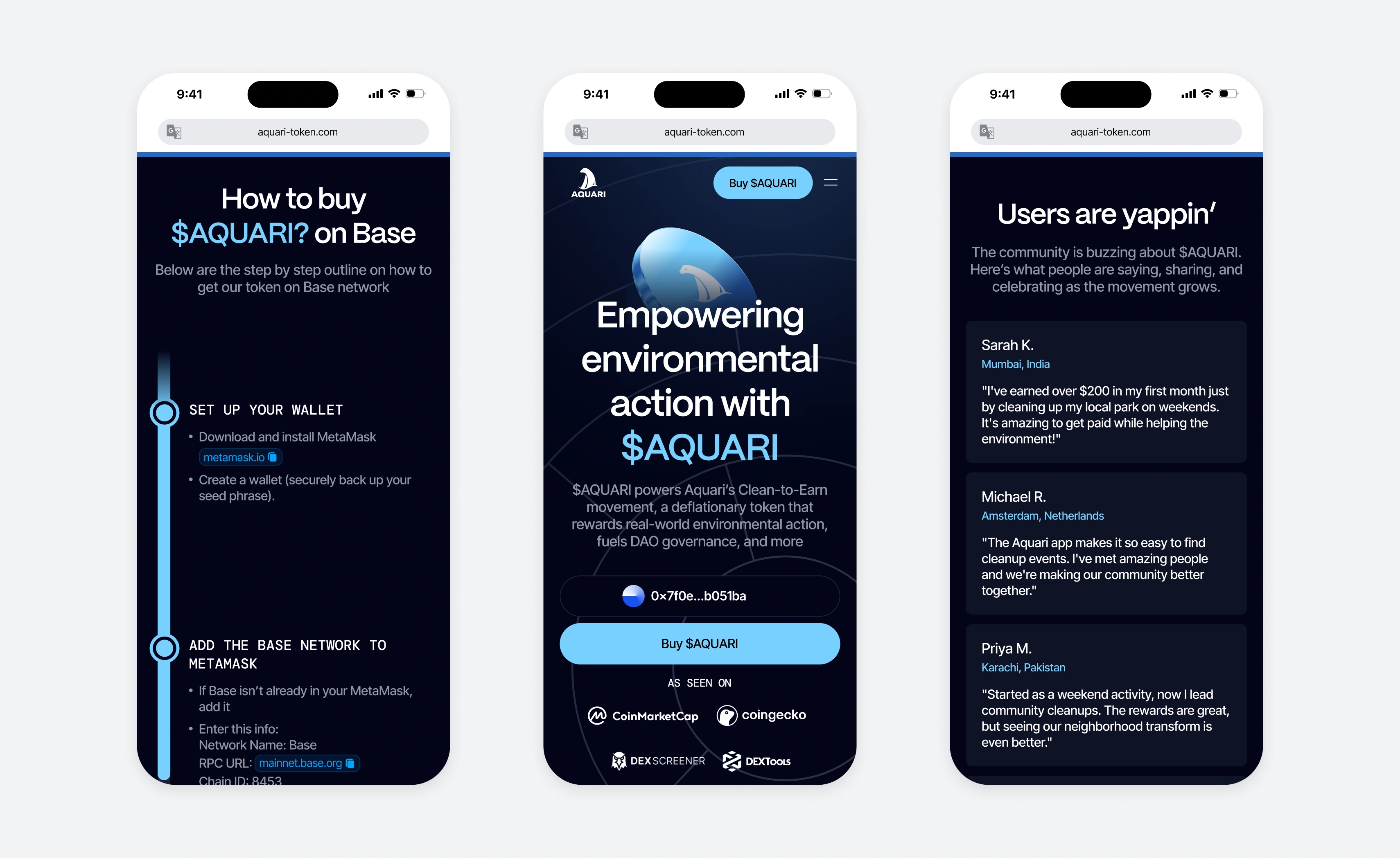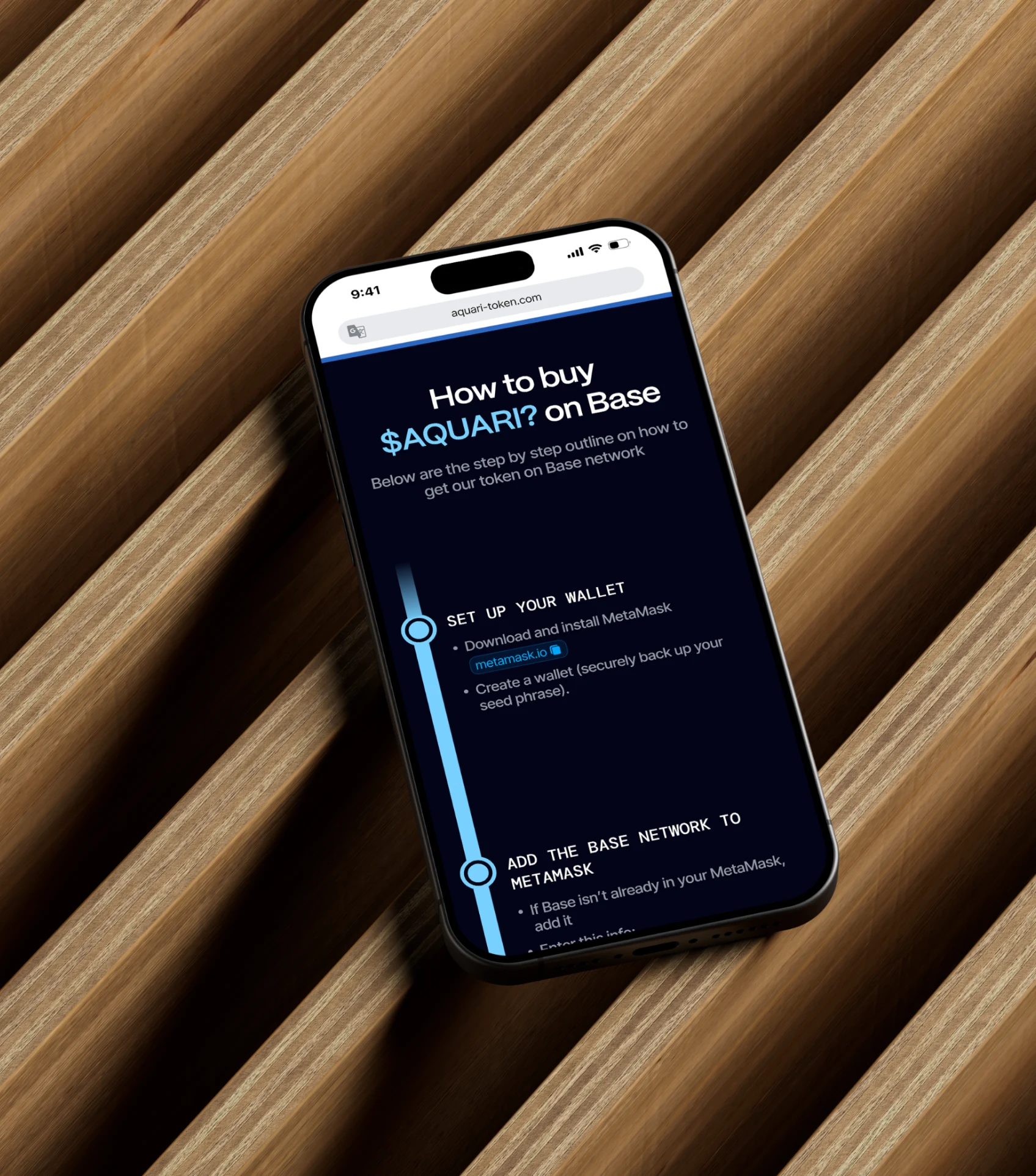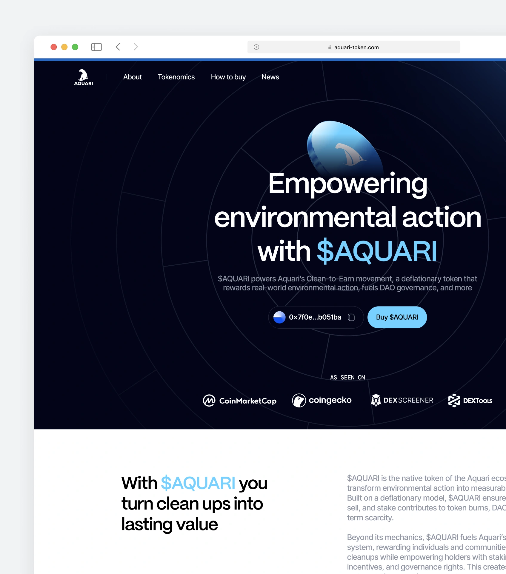 When Cameron first reached out, I immediately connected with the idea behind Aquari. I was contracted to design the Aquari token landing page, a space to tell the token’s story and show real, trusted data.