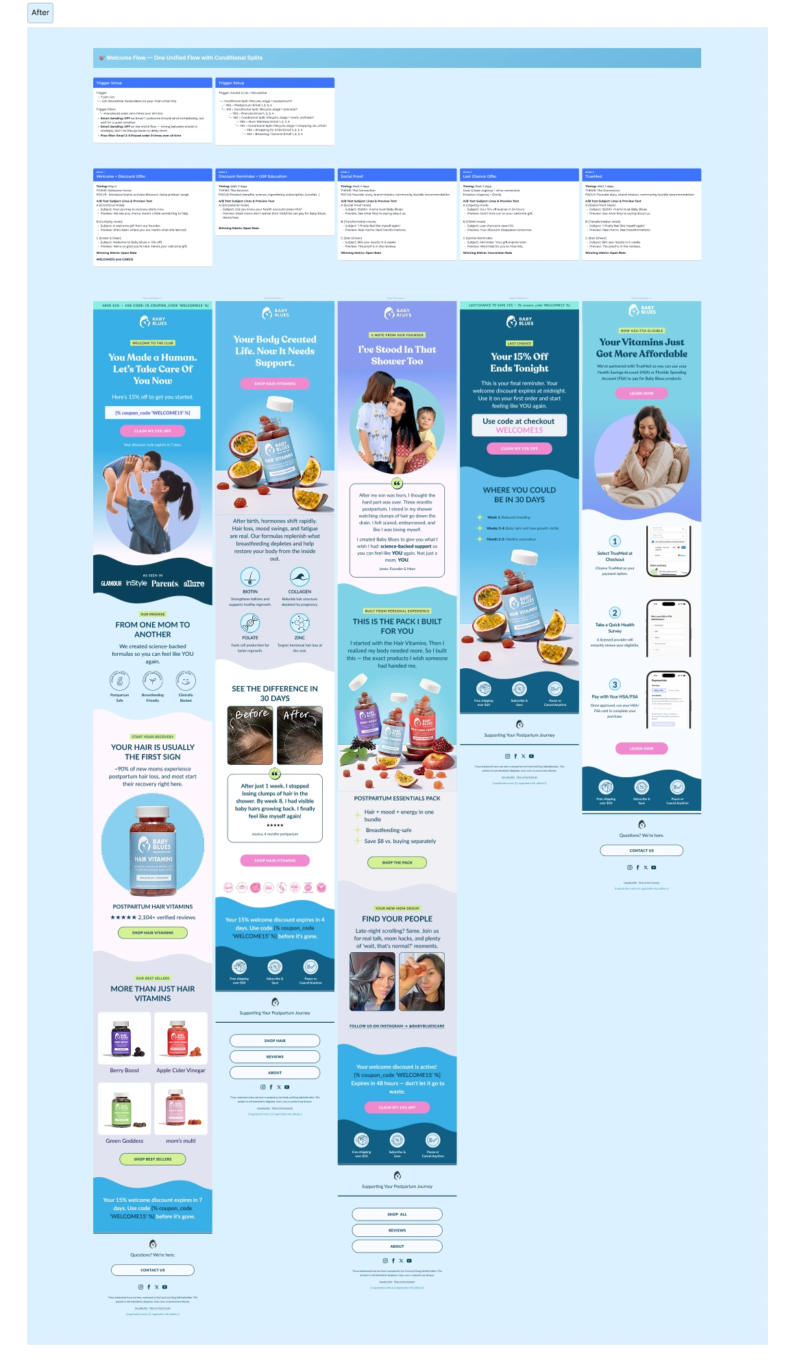 Baby Blues had a single, linear welcome sequence. Every subscriber, regardless of where she was in her journey, received the exact same emails. No segmentation, no zero-party data, no personalization. The messaging was generic for an audience that is anything but.