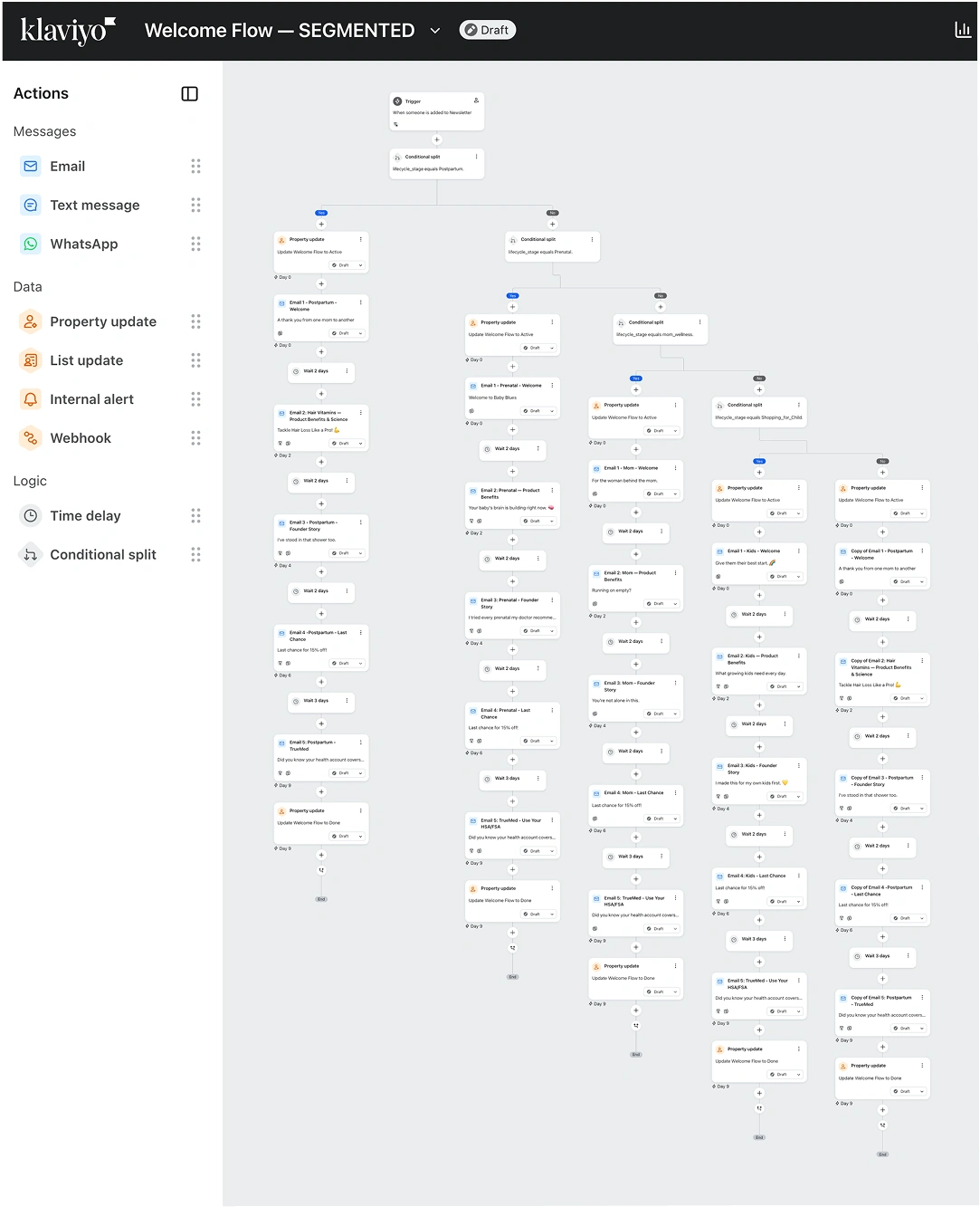Every path has unique subject lines, preview text, body copy, and CTAs written for that specific stage: prenatal, postpartum, daily support, gifting, or browsing.