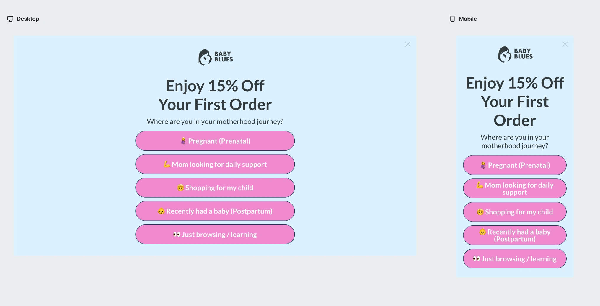 A full-page Klaviyo form that captures life stage before collecting contact info. Five options map directly to five flow paths, creating a zero-party data engine that personalizes every email from day one.