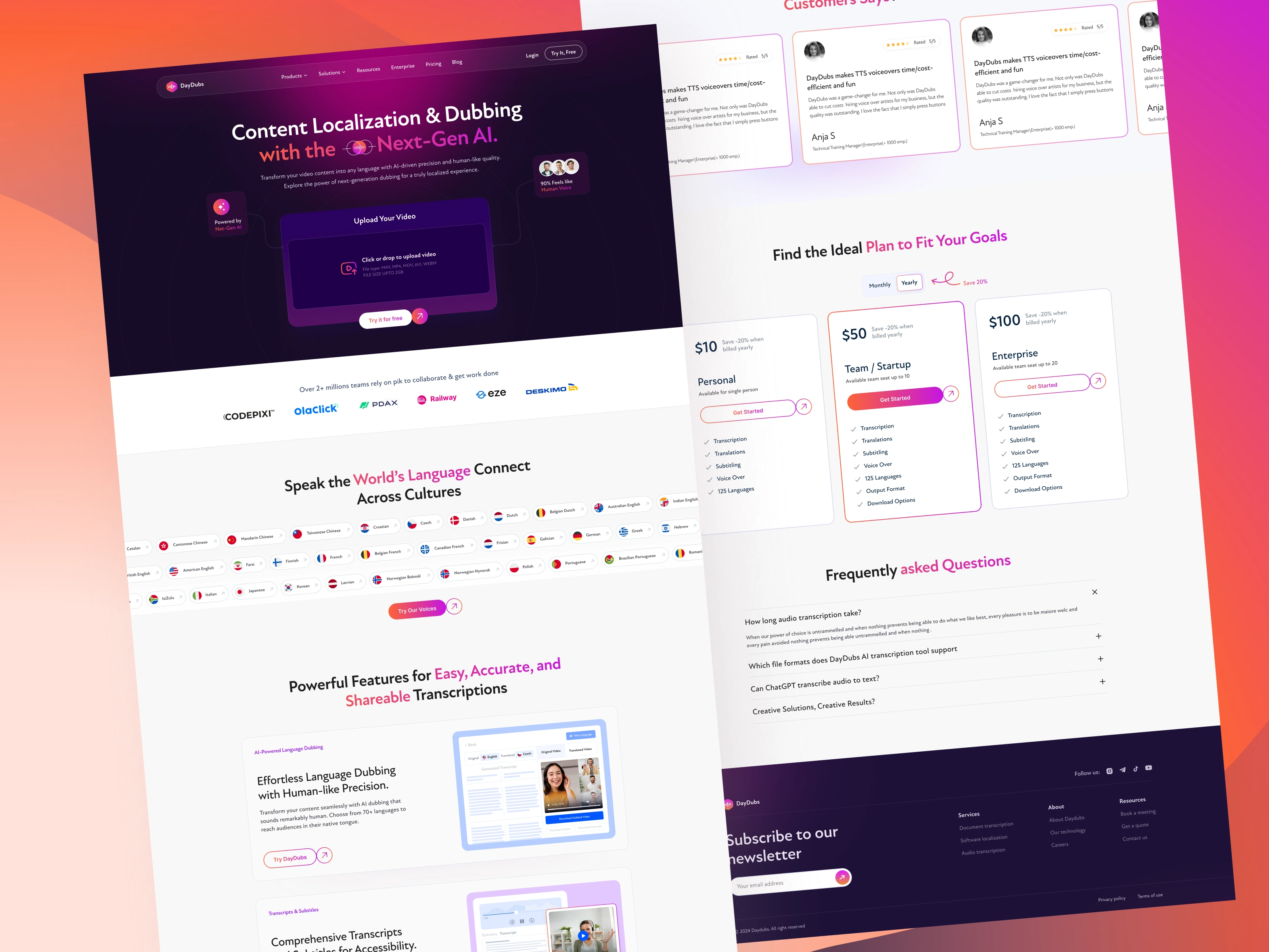 From homepage to feature highlights and branding blocks — this shot showcases the responsive web design for DayDubs, an AI-powered content dubbing platform. The challenge? Build a bold, modern site that explains DayDubs' tech clearly while still feeling easy, friendly, and global.